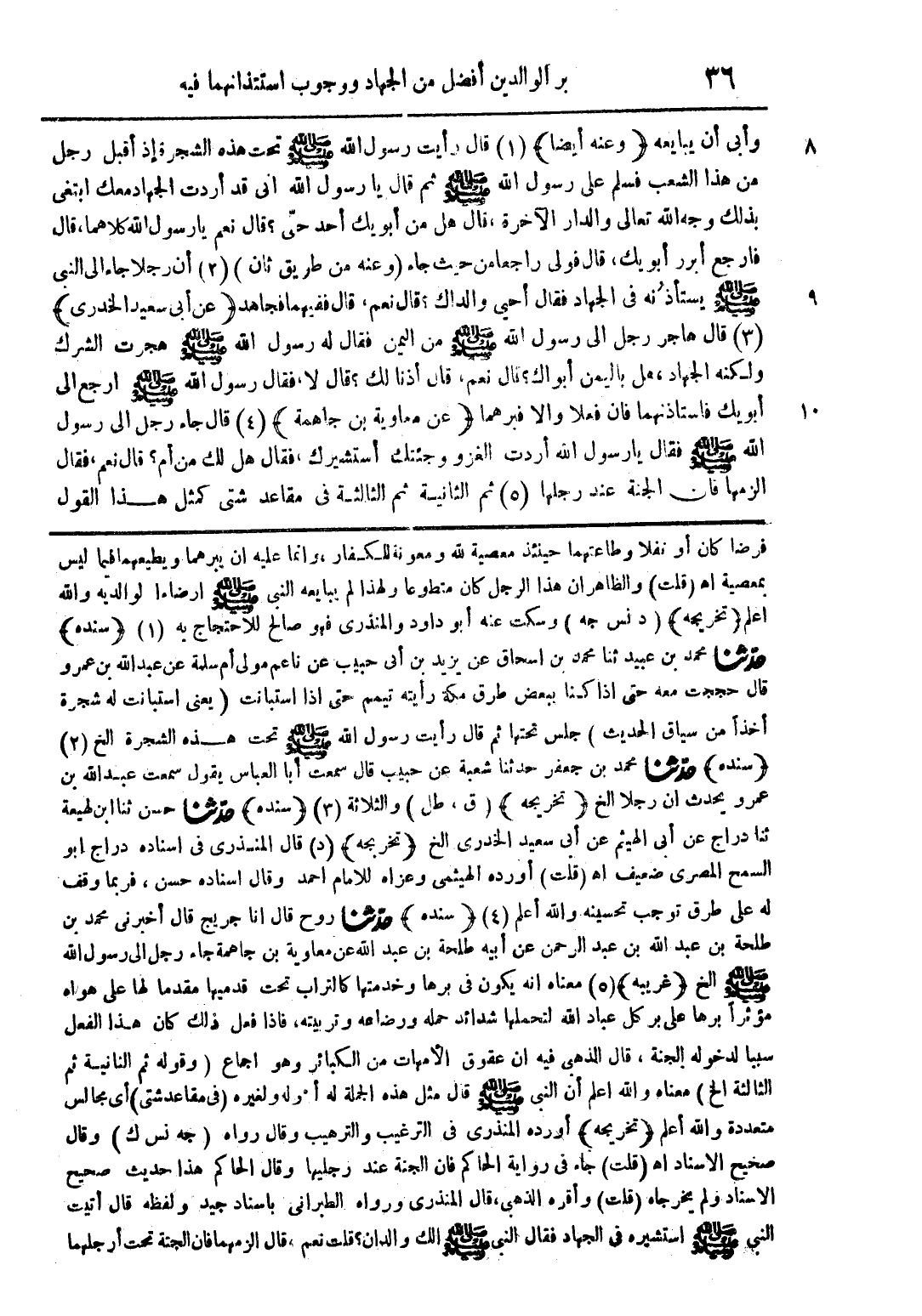 فرضا كان أو نفلا وطاعتهما حينئذ معصية لله ومعونة للكفار وإنما عليه أن يبرهما ويطيعهما فيما ليس بمعصية الله (قلت) والظاهر أن هذا الرجل كان متطوعا ولهذا لم يبايعه النبي صلى الله عليه وسلم ارضاءا لوالديه والله أعلم (تخريجه) (د نس جه) وسكت عنه أبو داود والمنذري فهو صالح للاحتجاج به (1) (سنده) حدثنا محمد بن عبيد ثنا محمد بن اسحاق عن يزيد بن أبي حبيب عن ناعم مولى أم سلمة عن عبد الله بن عمرو قال حججت معه حتى إذا كنا ببعض طرق مكه رأيته تيمم حتى إستبانب (يعني استبانت له شجرة أخذا من سياق الحديث) جلس تحتها ثم قال رأيت رسو ل الله صلى الله عليه وسلم تحت هذه الشجرة الخ (2) (سنده) حدثنا محمد بن جعفر حدثنا شعبة عن حبيب قال سمعت أبا العباس يقول سمعت عبد الله بن عمرو يحدث رجلا الخ (تخريجه) (ق طل) والثلاثة (3) (سنده) حدثنا حسن ثنا ابن لهيعة ثنا دراج عن أبي الهيثم عن أبي سعيد الخدري الخ (تخريجه) (د) قال المنذري في اسناده دراج أبو السمح المصرى ضعيف اهـ (قلت) أورده الهيثمي وعزاه للامام أحمد وقال اسناده حسن فربما وقف له على طرق توجب تحسينه والله أعلم (4) (سنده) حدثنا روح قال أنا جريج قال أخبرني محمد بن طلحة بن عبد الله بن عبد الرحمن عن أبيه طلحة بن عبد الله بن معاوية بن جاهمة جاء رجل إلى رسول الله صلى الله عليه وسلم الخ (غريبه) (5) معناه أنه يكون في برها وخدمتها كالتراب تحت قدميها مقدما لها على هواه مؤثرا برها على بر كل عباد الله لتحملها شدائد حمله ورضاعه وتربيته فإذا فعل ذلك كان هذا الفعل سببا لدخوله الجنة قال الذهي فيه أن عقوق الأمهات من الكبائر وهو إجماع (وقوله ثم الثانية ثم الثالثة الخ) معناه والله أعلم أن النبي صلى الله عليه وسلم قال مثل هذه الجملة له ولغيره (في مقاعد شتى) أي مجالس متعددة والله أعلم (تخريجه) أورده المنذري في الترغيب والترهيب وقال رواه (جه نس ك) وقال صحيح الاسناد اه (قلت) جاء في رواية الحاكم فإن الجنة عند رجليها وقال الحاكم هذا حديث صحيح الاسناد ولم يخرجاه (قلت) وأقره الذهي قال المنذري ورواه الطبراني باسناد جيد ولفظه قال أتيت النبي صلى الله عليه وسلم استشيره في الجهاد فقال النبي صلى الله عليه وسلم الك والدان؟ قلت نعم قال الزمهما فإن الجنة تحت أرجلهما