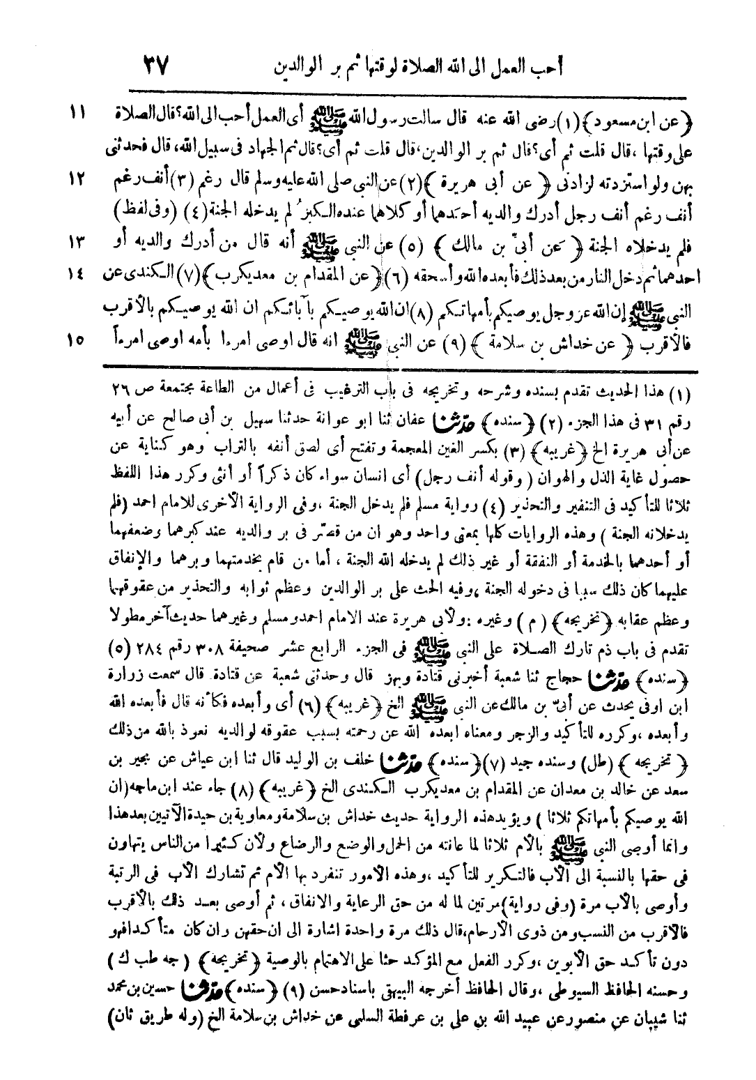 (عن ابن مسعود) (1) رضي الله عنه قال سألت رسول الله صلى الله عليه وسلم أي العمل أحب إلى الله؟ قال الصلاة على وقتها قال قلت ثم أي؟ قال ثم بر الوالدين قال قلت ثم أي؟ قال ثم الجهاد في سبيل الله قال فحدثني بهن ولو استزدته لزادني (عن ابي هريرة) (2) عن النبي صلى الله عليه وسلم قال رغم (3) أنف رغم أنف رغم أنف رجل أدرك والديه أحدهما او كلاهما عنده الكبر لم يدخله الجنة (4) (وفي لفظ) فلم يدخلاه الجنة (عن أبي بن مالك) (5) عن النبي صلى الله عليه وسلم أنه قال من أدرك والديه أو أحدهما ثم دخل النار من بعد ذلك فأبعده الله واسحقه (6) (عن المقدام بن معديكرب) (7) الكندي عن النبي صلى الله عليه وسلم إن الله عز وجل يوصيكم بأمهاتكم (8) إن الله يوصيكم بآبائكم إن الله يوصيكم بالأقرب فالأقرب (عن خداش بن سلامة) (9) عن النبي صلى الله عليه وسلم أنه قال أوصى امرءا بأمه أوصى امرءا