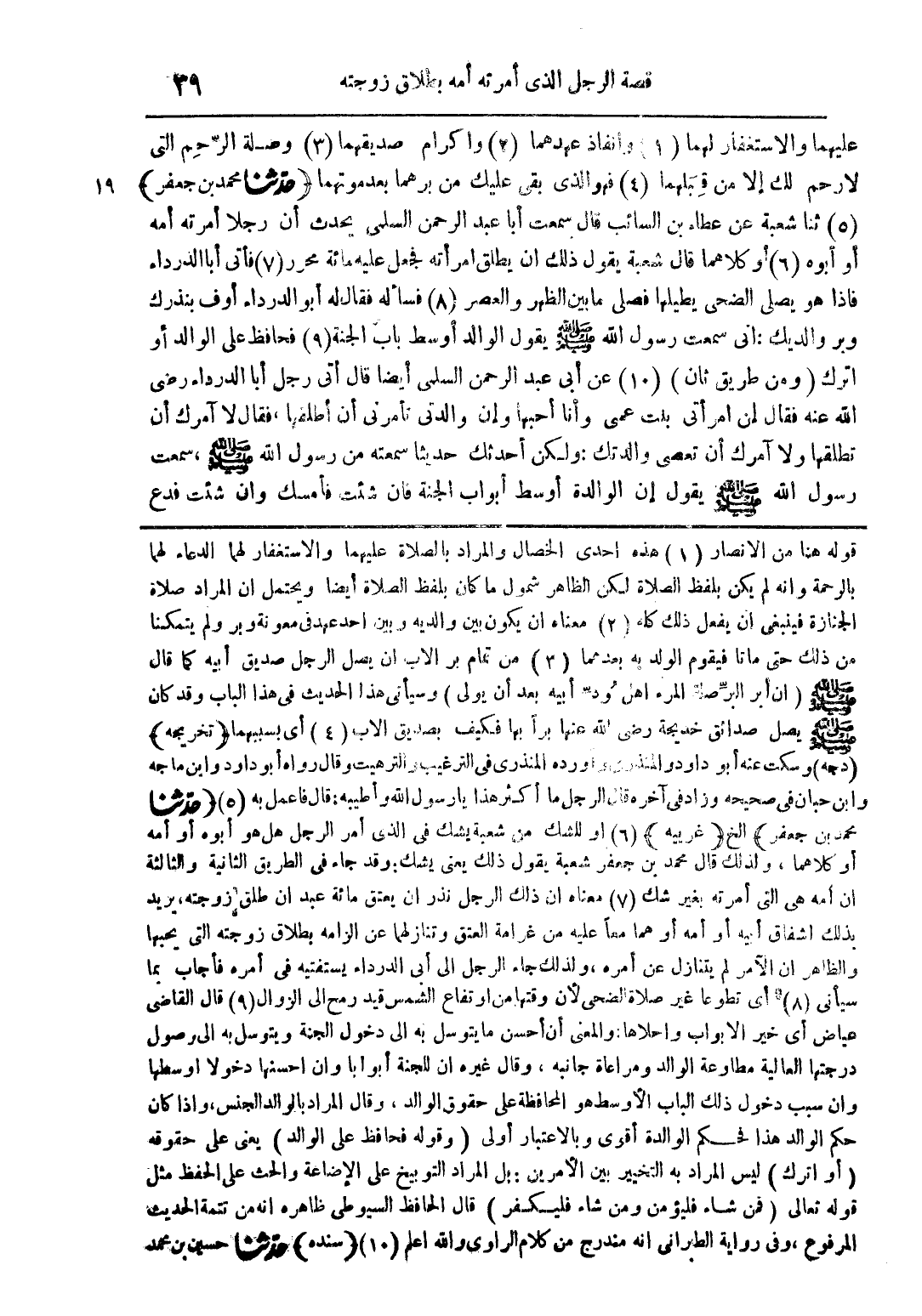 قوله هنا من الأنصار (1) هذه إحدى الخصال والمراد بالصلاة عليهما والاستغفار لهما الدعاء لهما بالرحمة وأنه لم يكن بلفظ الصلاة لكن الظاهر شمول ما كان بلفظ الصلاة أيضا ويحتمل أن المراد صلاة الجنازة فينبغي أن يفعل ذلك كله (2) معناه أن يكون بين والديه وبين احد عهد في معونة وبر ولم يتمكنا من ذلك حتى ماتا فيقوم الولد به بعدهما (3) من تمام بر الأب أن يصل الرجل صديق أبيه كما قال صلى الله عليه وسلم (أن البر صلة المرء أهل ود أبيه بعد أن يولى) وسيأتي هذا الحديث في هذا الباب وقد كان صلى الله عليه وسلم يصل صدائق خديجة رضي الله عنها برا بها فكيف بصديق الأب (4) أي بسببها (تخريجه) (د جه) وسكت عنه أبو داود والمنذري وأورده المنذري في الترغيب والترهيب وقال رواه أبو داود وابن ماجه وابن حبان في صحيحه وزاد في آخره قال الرجل ما أكثر هذا يا رسول الله وما أطيبه قال فاعمل به (5) (حدثنا محمد بن جعفر) الخ (غريبه) (6) أو للشك من شعبة يشك في الذي أمر الرجل هل هو أبوه أو أمه أو كلاهما ولذلك قال محمد بن جعفر شعبة يقول ذلك يعني يشك وقد جاء في الطريق الثانية والثالثة أنه أمه هي التي أمرته بغير شك (7) معناه أن ذلك الرجل نذر أن يعتق مائة عبد ان طلق زوجته يريد بذلك إشفاق أبيه أو أمه أو هما معا عليه من غرامة العتق وتنازلهما عن الزامه بطلاق زوجته التي يحبها والظاهر أن الآمر لم يتنازل عن أمره ولذلك جاء الرجل إلى أبي الدرداء يستفتيه في أمره فأجاب بما سيأتي (8) أي تطوعا غير صلاة الضحى لأن وقتها من ارتفاع الشمس قيد رمح إلى الزوال (9) قال القاضي عياض أي خير الأبواب وأحلاها والمعنى أحسن ما يتوسل به إلى دخول الجنة ويتوسل به إلى وصول درجتها العالية مطاوعة الوالد ومراعاة جانبه وقال غيره أن للجنة أبوابا وأن أحسنها دخولا اوسطها وأن سبب دخول ذلك الباب الأوسط هو المحافظة على حقوق الوالد وقال المراد بالوالد الجنس وإذا كان حكم الوالد هذا فحكم الوالدة أقوى وبالاعتبار أولى (وقوله فحافظ على الوالد) يعني على حقوقه (أو اترك) ليس المراد به التخيير بين الأمرين بل المراد التوبيخ على الإضاعة والحث على الحفظ مثل قوله تعالى (فمن شاء فليؤمن ومن شاء فليكفر) قال الحافظ السيوطي ظاهره أنه من تتمة الحديث المرفوع وفي رواية الطبراني أن مندرج من كلام الراوي والله أعلم (10) (سنده) حدثنا حسين بن محمد