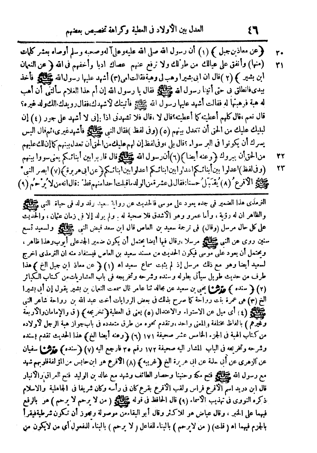 (عن معاذ بن جبل) (1) أن رسول الله صلى الله عليه وعلى آله وصحبه وسلم أوصاه بعشر كلمات (منها) وأنفق على عيالك من طولك ولا ترفع عنهم عصاك أدبا وأخفهم في الله (عن النعمان ابن بشير) (2) قال ان ابي بشيرا وهب لي وهبة فقالت أمي (3) أشهد عليها رسول الله صلى الله عليه وسلم فأخذ بيدي فانطلق بي حتى أتينا رسول الله صلى الله عليه وسلم فقال يا رسول الله إن أم هذا الغلام سألتني أن أهب له هبة فوهبتها له فقالت أشهد عليها رسول الله صلى الله عليه وسلم فأتيتك لأشهدك فقال رويدك الك ولد غيره؟ قال نعم قال كلهم أعطيته كما أعطيته؟ قال لا قال فلا تشهدني إذا إني لا أشهد على جور (4) إن لبنيك عليك من الحق أن تعدل بينهم (5) (وفي لفظ آخر) فقال النبي صلى الله عليه وسلم فأشهد غيري ثم قال اليس يسرك أن يكونوا في البر سواء؟ قال بلى وفي لفظ إن لهم عليك من الحق أن تعدل بينهم كما إن لك عليهم من الحق أن يبروك (وعنه أيضا) (6) أن رسول الله صلى الله عليه وسلم قال قاربوا بين أبنائكم يعني سووا بينهم (وفي لفظ) اعدلوا بين أبنائكم اعدلوا بين ابنائكم اعدلوا بين ابنائكم (عن أبي هريرة) (7) ابصر النبي صلى الله عليه وسلم الأقرع (8) يقبل حسنا فقال لي عشرة من الولد ما قبلت أحدا منهم قط قال أنه من لا يرحم (9)