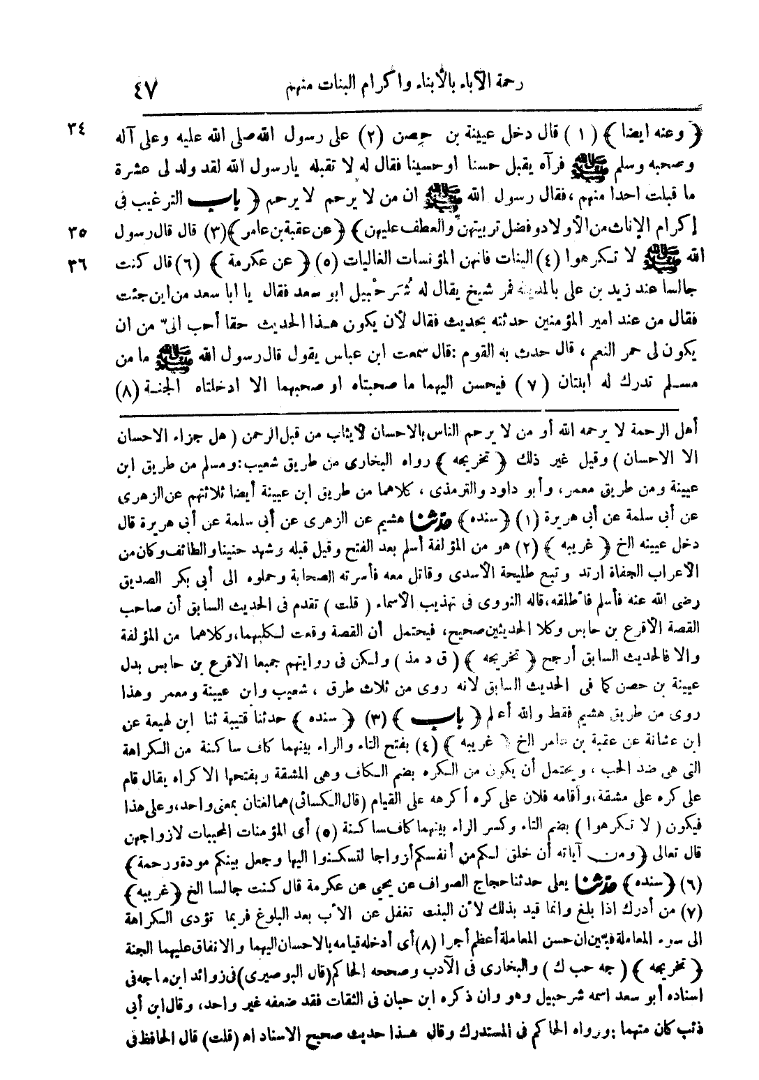 أهل الرحمة لا يرحمه الله أو من لا يرحم الناس بالإحسان لا يثاب من قبل الرحمن (هل جزاء الإحسان إلا الاحسان) وقيل غير ذلك (تخريجه) رواه البخاري من طريق شعيب ومسلم من طريق ابن عيينة ومن طريق معمر وأبو داود والترمذي كلاهما من طريق ابن عيينة أيضا ثلاثتهم عن الزهري أي أبي سلمة عن ابي هريرة (1) (سنده) حدثنا هشيم عن الزهري عن أبي سلمة عن أبي هريرة قال دخل عيينة الخ (غريبه) (2) هو من المؤلفة أسلم بعد الفتح وقيل فبله وشهد حنينا والطائف وكان من الأعراب الجفاة ارتد وتبع طليحة الأسدي وقاتل معه فأسرته الصحابة وحملوه إلى أبي بكر الصديق رضي الله عنه فأسلم فأطلقه قال النووي في تهذيب الأسماء (قلت) تقدم في الحديث السابق أن صاحب القصة الأقرع بن حابس وكلا الحديثين صحيح فيحتمل أن القصة وقعت لكليهما وكلاهما من المؤلفة والا فالحديث السابق ارجح (تخريجه) (ق د مذ) ولكن في روايتهم جميعا الأقرع بن حابس بدل عيينه بن حصن كما في الحديث السابق لأنه روى من ثلاث طرق شعيب وابن عيينه ومعمر وهذا روى من طريق هشيم فقط والله أعلم (باب) (3) (سنده) حدثنا قتيبة ثنا ابن لهيعة عن ابن عشانة عن عقبة بن عامر الخ (غريبه) (4) بفتح التاء والراء بينهما كاف ساكنة من الكراهة التي هي ضد الحب ويحتمل أن يكون من الكره بضم الكاف وهي المشقة وبفتحها الاكراه يقال قام على كره على مشقة وإقامه فلان على كره أكرهه على القيام (قال الكسائي) هما لغتان بمعنى واحد وعلى هذا فيكون (لا تكرهوا) بضم التاء وكسر الراء بينهما كاف ساكنة (5) أي المؤمنات المحببات لأزواجهن قال تعالى (ومن آياته أن خلق لكم من أنفسكم أزواجا لتسكنوا إليها وجعل بينكم مودة ورحمة) (6) (سنده) حدثنا يعلى حدثنا حجاج الصواف عن يحي عن عكرمة قال كنت جالسا الخ (غريبه) (7) من أدرك إذا بلغ إنما قيد بذلك لأن البنت تغفل عن الأب بعد البلوغ فربما تؤدي الكراهة إلى سوء المعاملة فبين أن حسن المعاملة أعظم أجرا (8) أي أدخله قيامه بالاحسان إليهما والانفاق عليهما الجنة (تخريجه) (جه حب ك) والبخاري في الأدب وصححه الحاكم (قال البوصيري) في زوائد ابن ماجه في اسناده أبو سعد اسمه شرحبيل وهو وان ذكره ابن حبان في الثقات فقد ضعفه غير واحد وقال ابن أبي ذئب كان منهما ورواه الحاكم في المستدرك وقال هذا حديث صحيح الاسناد اهـ (قلت) قال الحافظ في