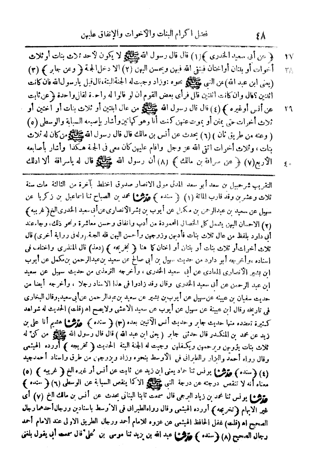 (عن أبي سعيد الخدري) (1) قال قال رسول الله صلى الله عليه وسلم لا يكون لأحد ثلاث بنات أو ثلاث أخوات أو بنتان أو أختان فيتقي الله فيهن ويحسن إليهن (2) إلا دخل الجنة (وعن جابر) (3) (يعني ابن عبد الله) عن النبي صلى الله عليه وسلم نحوه وزاد وجبت له الجنة البتة قال قيل يا رسول الله فإن كانت اثنتين؟ قال وإن كانت اثنتين قال فرأى بعض القوم أن لو قالوا له واحدة لقال واحدة (عن ثابت عن أنس أو غيره) (4) قال قال رسول الله صلى الله عليه وسلم من عال ابنتين أو ثلاث بنات أو اختين أو ثلاث أخوات حتى يمتن أو يموت عنهن كنت أنا وهو كهاتين وأشار بإصبعه السبابة والوسطى (5) (وعنه من طريق ثان) (6) يحدث عن أنس بن مالك قال قال رسول الله صلى الله عليه وسلم من كان له ثلاث بنات وثلاث أخوات اتقى الله عز وجل وأقام عليهن كان معي في الجنة هكذا وأشار بأصابعه الأربع (7) (عن سراقة بن مالك) (8) أن رسول الله صلى الله عليه وسلم قال له يا سراقة ألا أدلك