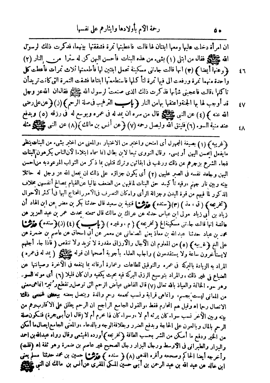 (غريبه) (1) بصيغة المجهول أي امتحن واختبر من الاختبار والمعنى من اختبر بشيء من البنات ينظر ما يفعل ايحسن اليهن أو يسيء وقال النووي تبعا لابن بطال أنما سماه ابتلاءا لأن الناس يكرهون البنات فجاء الشرع بزجرهم عن ذلك ورغب في ابقائهن وترك قتلهن بما ذكر من الثواب الموعود به من احسن اليهن وجاهد نفسه في الصبر عليهن (2) أي يكون جزاؤه على ذلك أن يجعل الله عز وجل له حائلا بينه وبين نار جهنم وفيه تأكيد حق البنات لما فيهن من الضعف غالبا عن القيام بمصالح أنفسهن بخلاف الذكور لما فيهم من قوة البدن وجزالة الرأي وامكان التصرف في الأمور المحتاج إليها في أكثر الأحوال (تخريجه) (ق مذ) (3) (سنده) حدثنا قتيبة بن سعيد قال حدثنا بكر بن مضر عن ابن الهاد أن زياد بن أبي زياد مولى ابن عباس حدثه عن عراك بن مالك قال سمعته يحدث عمر بن عبد العزيز عن عائشة أنها قال جاءتني مكينة الخ (تخريجه) (م وغيره) (باب) (4) (ز) (سنده) حدثنا محمد بن عباد حدثنا عبد الله بن معاذ يعني الصنعاني عن معمر عن أبي اسحاق عن عاصم بن ضمرة عن الخ (غريبه) (5) من المعلوم أن الآجال والأرزاق مقدرة لا تزيد ولا تنقص (فإذا جاء أجلهم لا يستأخرون ساعة ولا يستقدمون) وأجاب العلماء بأجوبة أصحها أن قوله صلى الله عليه وسلم (يمد له في عمره) المراد به الزيادة بالبركة في عمره والتوفيق للطاعات وعمارة أوقاته بما ينفعه في الآخرة وصيانتها عن الضيع في غير ذلك والمراد بتوسيع الرزق البركة فيه بحيث يكفيه وان كان قليلا (6) أي موته السوء وهو سوء الخاتمة والعياذ بالله تعالى (7) قال القاضي عياض الرحم التي توصل وتقطع وتبر إنما هي معنى من المعاني ليست بجسم وإنما هي قرابة ونسب تجمعه رحم والدة ويتصل بعضه ببعض نسمي ذلك الاتصال رحما اهـ وقيل هم المحارم فقط والقول الجامع الراجع أن الرحم يطلق على الأقارب وهم من بينه وبين الآخر نسب سواء كان يرثه أم لا وسواء كان ذا محرم أم لا (قال ابن ابي جرة) فتكون صلة الرحم بالمال وبالعون على الحاجة وبدفع الضرر وبطلاقة الوجه وبالدعاء والمعنى الجامع ايصال ما امكن من الخير ودفع ما امكن من الشر بحسب الطاقة (تخريجه) أورده الهيثمي وقال رواه عبد الله بن أحمد والبزار والطبراني في الأوسط ورجال البزار رجال الصحيح غير عاصم بن ضمرة وهو ثقة اهـ (قلت) وأخرجه ايضا الحاكم وصححه واقره الذهي (8) (سنده) حدثنا حسين بن محمد حدثنا مسلم يعني ابن خالد عن عبد الله بن عبد الرحمن بن أبي حسين المكي المقرى عن أنس بن مالك أن النبي صلى الله عليه وسلم