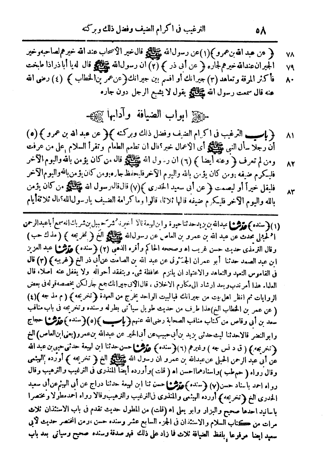 (باب الترغيب في إكرام الضيف وفضل ذلك وبركته) (عن عبد الله بن عمرو) (5) أن رجلا سأل النبي صلى الله عليه وسلم أي الأعمال خير؟ قال أن تطعم الطعام وتقرأ السلام على من عرفت ومن لم تعرف (وعنه أيضا) (6) أن رسول الله صلى الله عليه وسلم قال من كان يؤمن بالله واليوم الآخر فليكرم ضيفه ومن كان يؤمن بالله واليوم الآخر فليحفظ جاره ومن كان يؤمن بالله واليوم الآخر فليقل خيرا أو ليصمت (عن أبي سعيد الخدري) (7) قال قال رسول الله صلى الله عليه وسلم من كان يؤمن بالله واليوم الآخر فليكرم ضيفه قالها ثلاثا قالوا وما كرامة الضيف يا رسول الله؟ قال ثلاثة أيام