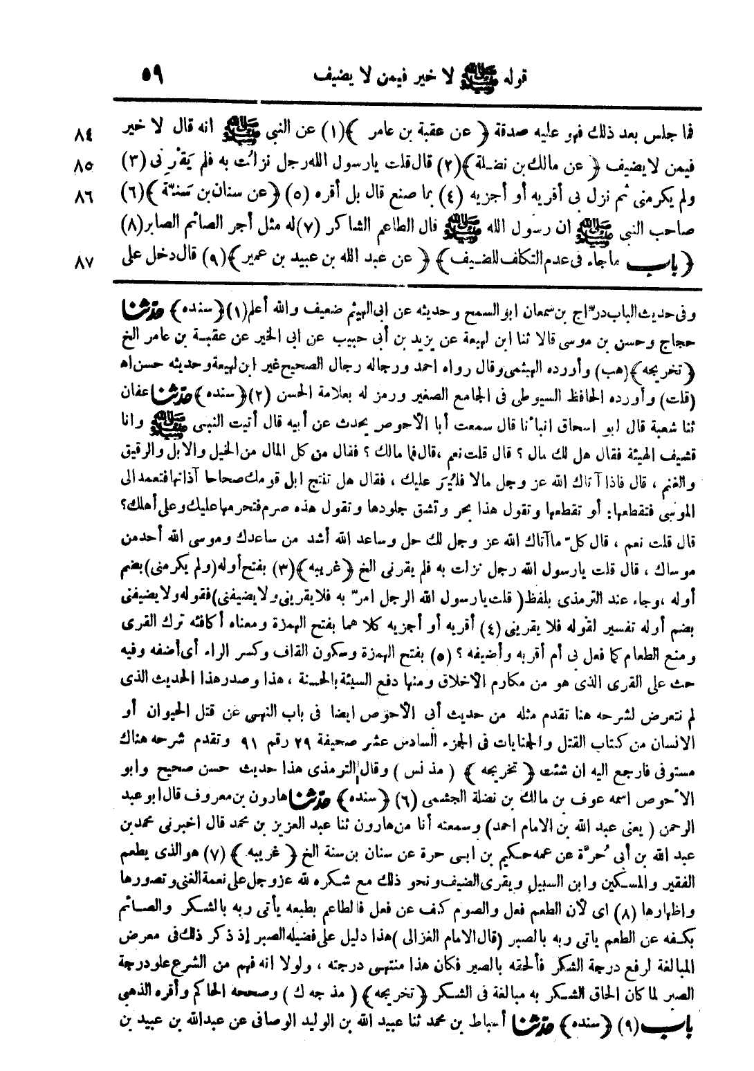 فما جلس بعد ذلك فهو عليه صدقة (عن عقبة بن عامر) (1) عن النبي صلى الله عليه وسلم أنه قال لا خير فيمن لا يضيف (عن مالك بن نضلة) (2) قال قلت يا رسول الله رجل نزلت به فلم يقرني (3) ولم يكرمني ثم نزل بي أقريه أو أجزيه (4) بما صنع قال بل أقره (5) (عن سنان بن سنة) (6) صاحب النبي صلى الله عليه وسلم أن رسول الله صلى الله عليه وسلم قال الطاعم الشاكر (7) له مثل أجر الصائم الصابر (8) (باب ما جاء في عدم التكلف للضيف) (عن عبد الله بن عبيد بن عمير) (9) قال دخل على