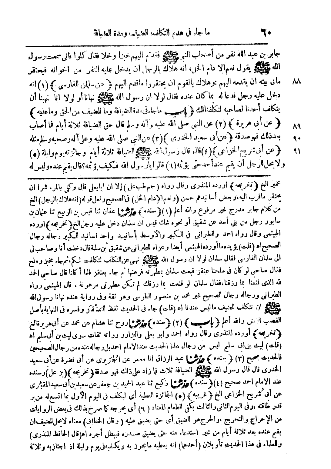 جابر بن عبد الله نفر من أصحاب النبي صلى الله عليه وسلم فقدم إليهم خبزا وخلا فقال كلوا فإني سمعت رسول الله صلى الله عليه وسلم يقوم نعم إلادام الخل أنه هلاك بالرجل أن يدخل عليه النفر من أخوانه فيحتقر ما في بيته أن يقدمه إليهم وهلاك بالقوم أن يحتقروا ما قدم اليهم (عن سلمان الفارسي) (1) أنه دخل عليه رجل فدعا له بما كان عنده فقال لولا أن رسول الله صلى الله عليه وسلم نهانا ولولا أنا نهينا أن يتكلف أحدنا لصاحبه لتكلفنا لك (باب ما جاء مدة الضيافة وما للضيف من الحق وما عليه) (عن أبي هريرة) (2) عن النبي صلى الله عليه وآله وسلم قال حق الضيافة ثلاثة أيام فما أصاب بعد ذلك فهو صدقة (عن أبي سعيد الخدري) (3) عن النبي صلى الله عليه وعلى آله وصحبه وسلم مثله (عن أبي شريح الخزاعي) (4) قال قال رسول الله صلى الله عليه وسلم الضيافة ثلاثة أيام وجائزته يوم وليلة (5) ولا يحل للرجل أن يقيم عند أحد حتى يؤثمه (6) قالوا يا رسول الله فكيف يؤثمه؟ قال يقيم عنده وليس له