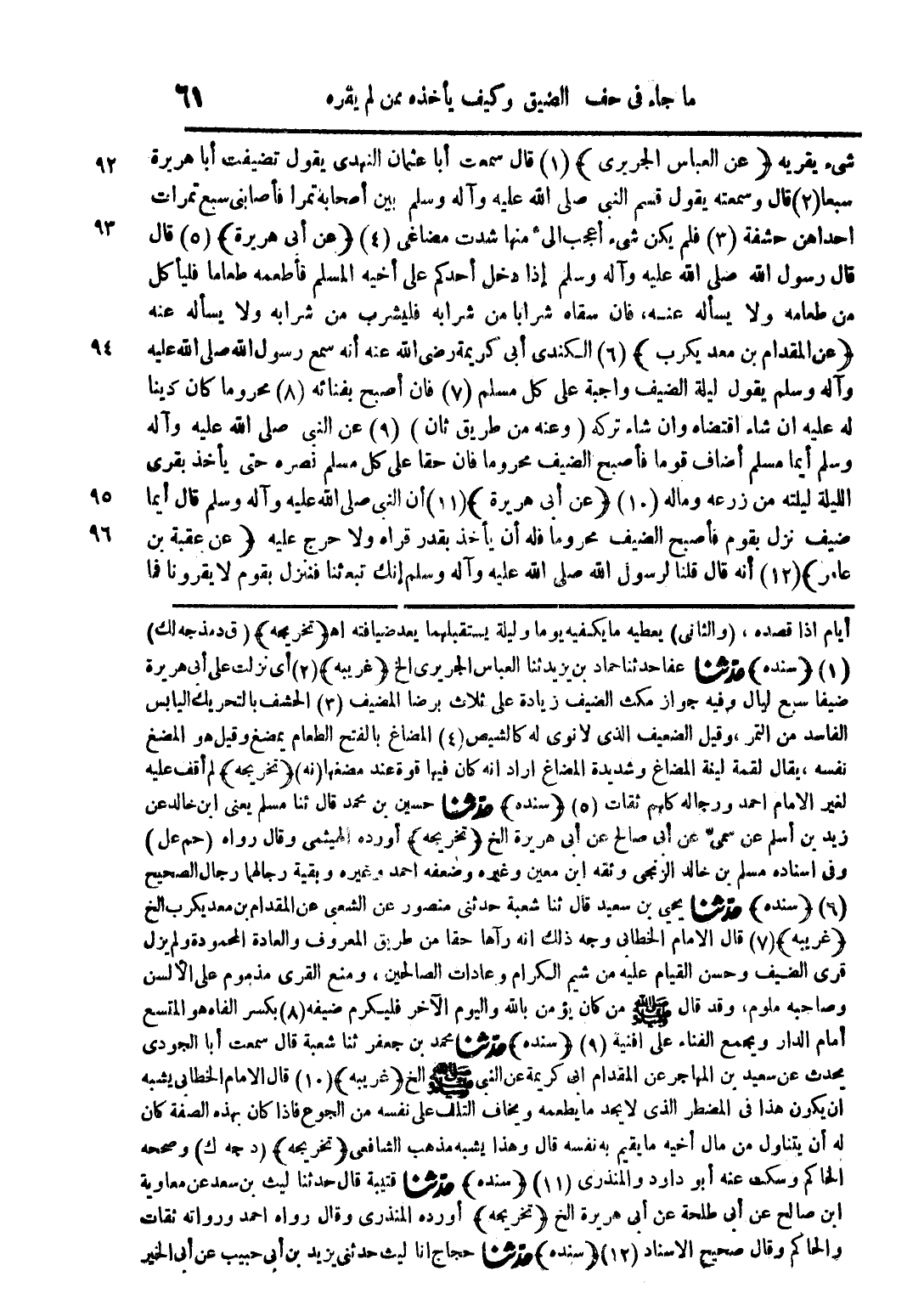 شيء يقريه (عن العباس الجريري) (1) قال سمعت أبا عثمان النهدي يقول تضيفت أبا هريرة سبعا (2) قال وسمعته يقول قسم النبي صلى الله عليه وآله وسلم بين أصحابه تمرا فأصابني سبع تمرات احداهن حشفة (3) فلم يكن شيء أعجب إلى منها شدت مضاغي (4) (عن أبي هريرة) (5) قال قال رسول الله صلى الله عليه وآله وسلم إذا دخل أحدكم على أخيه المسلم فأطعمه طعاما فليأكل من طعامه ولا يسأله عنه فإن سقاه شرابا من شرابه فليشرب من شرابه ولا يسأله عنه (عن المقدام بن معديكرب) (6) الكندي أبي كريمة رضي الله عنه أنه سمع رسول الله صلى الله عليه وآله وسلم يقول ليلة الضيف واجبة على كل مسلم (7) فإن اصبح بفنائه (8) محروما كان دينا له عليه إن شاء اقتضاه وان شاء تركه (وعنه من طريق ثان) (9) عن النبي صلى الله عليه وآله وسلم أيما مسلم أضاف قوما فأصبح الضيف محروما فإن حقا على كل مسلم نصره حتى يأخذ بقرى الليلة ليلته من زرعه وماله (10) (عن أبي هريرة) (11) أن النبي صلى الله عليه وآله وسلم قال أيما ضيف نزل بقوم فأصبح الضيف محروما فله أن يأخذ بقدر قراه ولا حرج عليه (عن عقبة بن عامر) (12) أنه قال قلنا لرسول الله صلى الله عليه وآله وسلم إنك تبعثنا فننزل بقوم لا يقرونا فما