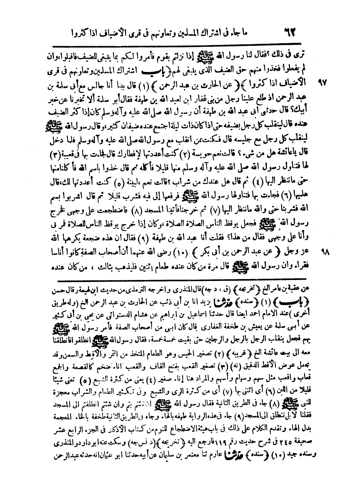 ترى في ذلك؟ فقال لنا رسول الله صلى الله عليه وسلم إذا نزلتم بقوم فأمروا لكم بما ينبغي للضيف فاقبلوا وان لم يفعلوا فخذوا منهم حق الضيف الذي ينبغي لهم (باب اشتراك المسلمين وتعاونهم في قرى الأضياف إذا كثروا) (عن الحارث بن عبد الرحمن) (1) قال بينما أنا جالس مع أبي سلمة بن عبد الرحمن إذ طلع علينا رجل من بني غفار ابن لعيد الله بن طهفة فقال أبو سلمة ألا تخبرنا عن خبر أبيك؟ قال حدثني أبي عبد الله بن طهفة أن رسول الله صلى الله عليه وآله وسلم كان إذا كثر الضيف عنده قال لينقلب كل رجل بضيفه حتى إذا كان ذات ليلة اجتمع عنده ضيفان كثير وقال رسول الله صلى الله عليه وسلم لينقلب كل رجل مع جليسه قال فكنت ممن انقلب مع رسول الله صلى الله عليه وآله وسلم فلما دخل قال يا عائشة هل من شيء؟ قالت نعم حويسة (2) كنت أعددتها لإفطارك قال فجاءت بها في قعيبة (3) لها فتناول رسول الله صلى الله عليه وآله وسلم منها قليلا فأكله ثم قال خذوا باسم الله فأكلنا منها حتى ما تنظر إليها (4) ثم قال هل عندك من شراب؟ قالت نعم لبينة (5) كنت أعددتها لك قال هلميها (6) فجاءت بها فتناولها رسول الله صلى الله عليه وسلم فرفعها إلى فيه فشرب قليلا ثم قال اشربوا بسم الله فشربنا حتى والله ما ننظر إليها (7) ثم خرجنا فأتينا المسجد (8) فاضطجعت على وجهي فخرج رسول الله صلى الله عليه وسلم فجعل يوقظ الناس الصلاة الصلاة وكان إذا خرج يوقظ الناس للصلاة فمر بي وأنا على وجهي فقال من هذا؟ فقلت أنا عبد الله بن طهفة (9) فقال أن هذه ضجعة يكرهها الله عز وجل (عن عبد الرحمن بن أبي بكر) (10) رضي الله عنهما أن أصحاب الصفة كانوا أناسا فقراء وأن رسول الله صلى الله عليه وسلم قال مرة من كان عنده طعام اثنين فليذهب بثالث من كان عنده