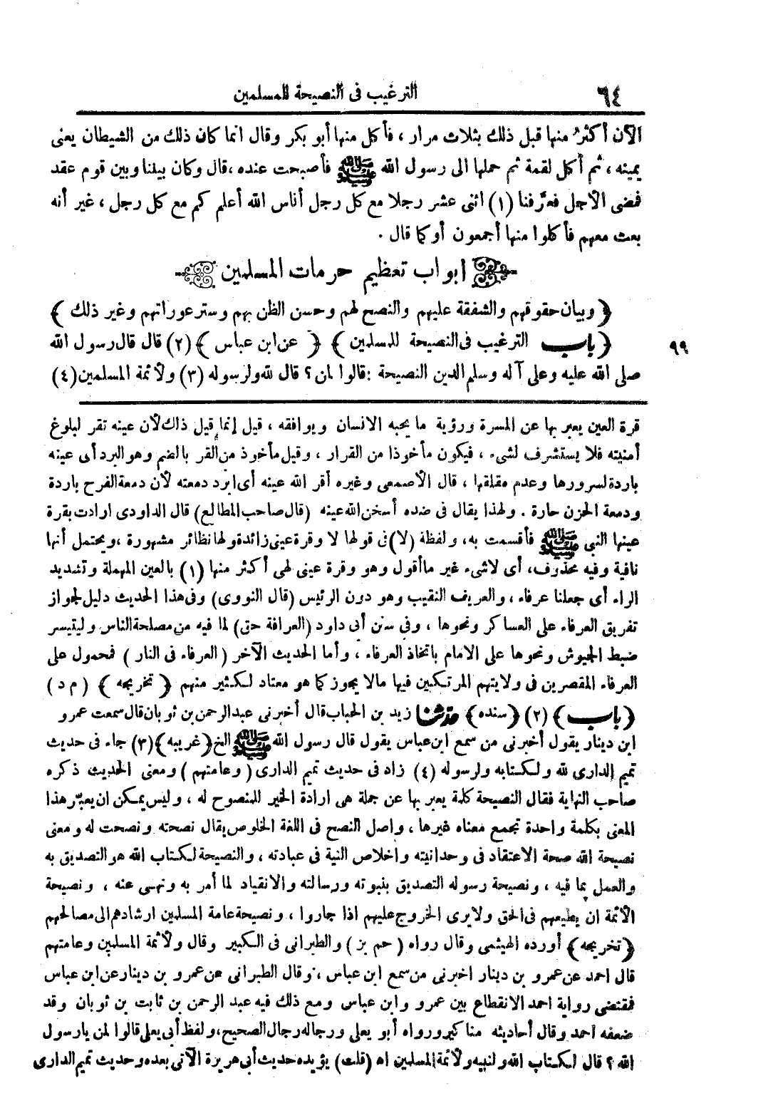 (وبيان حقوقهم والشفقة عليهم والنصح لهم وحسن الظن لهم وستر عوراتهم وغير ذلك) (باب الترغيب في النصيحة للمسلمين) (عن ابن عباس) (2) قال قال رسول الله صلى الله عليه وعلى آله وسلم الدين النصيحة قالوا لمن؟ قال لله ولرسوله (3) ولأئمة المسلمين (4)