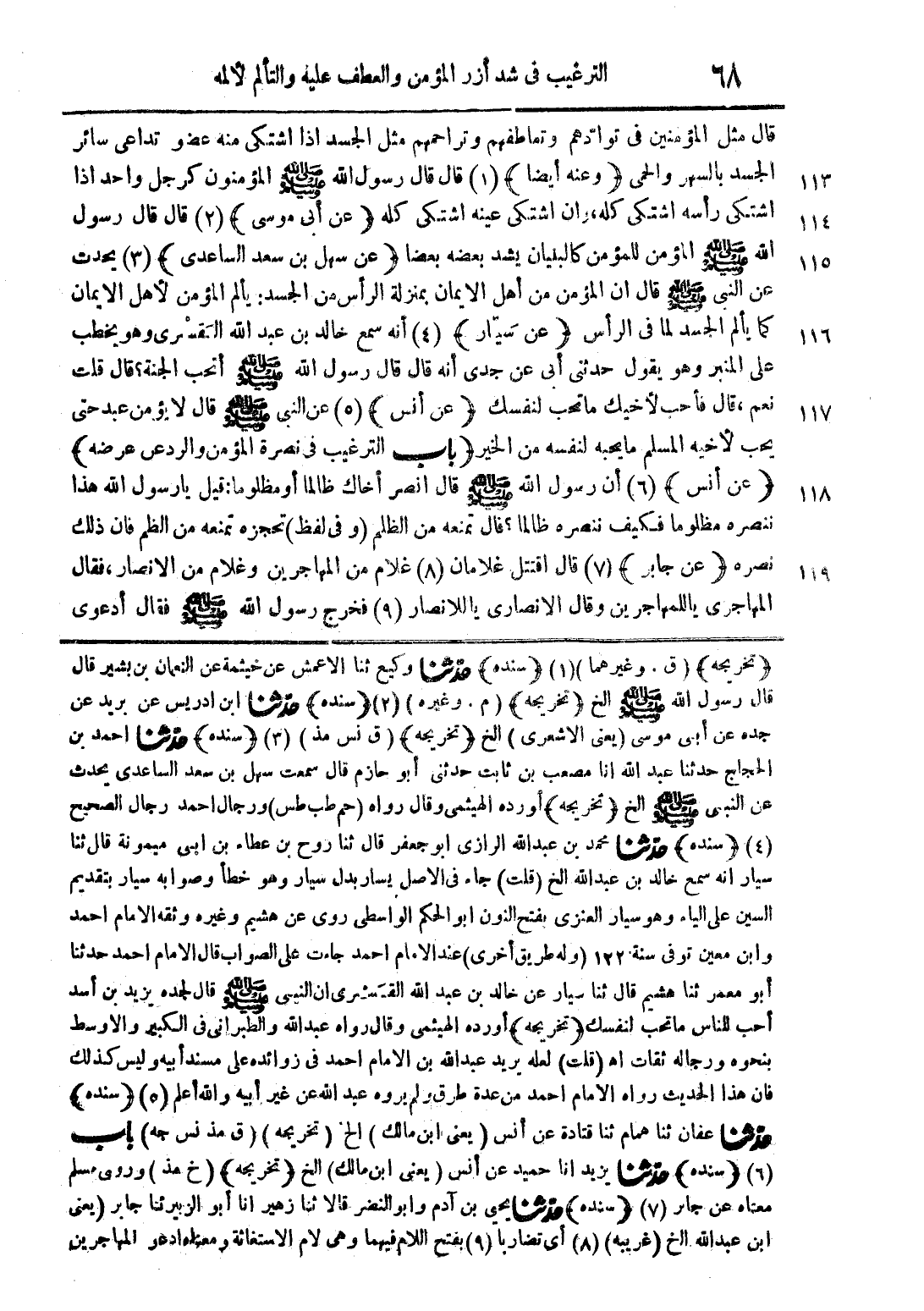 (تخريجه) (ق وغيرهما) (1) (سنده) حدثنا وكيع ثنا الأعمش عن خيثمة عن النعمان بن بشير قال قال رسول الله صلى الله عليه وسلم الخ (تخريجه) (م وغيره) (2) (سنده) حدثنا ابن ادريس عن يزيد عن جده أبي موسى (يعني الأشعري) الخ (تخريجه) (ق نس مذ) (3) (سنده) حدثنا احمد بن الحجاج حدثنا عبد الله انا مصعب بن ثابت حدثني أبو حازم قال سمعت سهل بن سعد الساعدي يحدث عن النبي صلى الله عليه وسلم الخ (تخريجه) أورده الهيثمي وقال رواه (حم طب طس) ورجال أحمد رجال الصحيح (4) (سنده) حدثنا محمد بن عبد الله الرازي أبو جعفر قال ثنا روح بن عطاء بن أبي ميمونة قال ثنا سيار أنه سمع خالد بن عبد الله الخ (قلت) جاء في الاصل يسار بدل سيار وهو خطأ وصوابه سيار بتقديم السين على الياء وهو سيار العنزى بفتح النون أبو الحكم الواسطى روى عن هشيم وغيره وثقه الامام احمد وابن معين توفي سنة 122 (وله طريق أخرى) عند الامام أحمد جاءت على الصواب قال الامام احمد حدثنا ابو معمر ثنا هشيم قال ثنا سيار عن خالد بن عبد الله القشري ان النبي صلى الله عليه وسلم قال لجده يزيد بن أسد أحب للناس ما تحب لنفسك (تخريجه) أورده الهيثمي وقال رواه عبد الله والطبراني في الكبير والأوسط بنحوه ورجاله ثقات اهـ (قلت) لعله يريد عبد الله بن الامام أحمد في زوائده على مسند أبيه وليس كذلك فإن هذا الحديث رواه الامام احمد من عدة طرق ولم يروه عبد الله عن غير أبيه والله أعلم (5) (سنده) حدثنا عفان ثنا همام ثنا قتادة عن أنس (يعني ابن مالك) الخ (تخريجه) (ق مذ نس جه) باب (6) (سنده) حدثنا يزيد انا حميد عن انس (يعني ابن مالك) الخ (تخريجه) (خ مذ) وروى مسلم معتاد عن جابر (7) (سنده) حدثنا يحيى بن آدم وابو النضر قالا ثنا زهير انا ابو الزبير ثنا جابر (يعني ابن عبد الله) الخ (غريبه) (8) أي تضاربا (9) بفتح اللام فيهما وهي لام الاستغاثة ومعناها أدعو المهاجرين