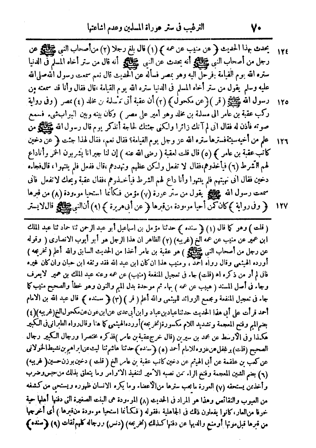 يحدث بهذا الحديث (عن منيب عن عمه) (1) قال بلغ رجلا (2) من أصحاب النبي صلى الله عليه وسلم عن رجل من أصحاب النبي صلى الله عليه وسلم أنه يحدث عن النبي صلى الله عليه وسلم أنه قال من ستر أخاه المسلم في الدنيا ستره الله يوم القيامة فرحل إليه وهو بمصر فسأله هذا الحديث قال نعم سمعت رسول الله صلى الله عليه وسلم يقول من ستر أخاه المسلم في الدنيا ستره الله يوم القيامة فقال وأنا قد سمعته من رسول الله صلى الله عليه وسلم (قر) (عن مكحول) (3) أن عقبة أتى مسلمة بن مخلد (4) بمصر (وفي رواية ركب عقبة بن عامر غلى مسلمة بن مخلد وهو أمير على مصر) وكان بينه وبين البواب شيء فسمع صوته فأذن له فقال اني لم آتك زائرا ولكني جئتك لحاجة أتذكر يوم قال رسول الله صلى الله عليه وسلم من علم من أخيه سيئة فسترها ستره الله عز وجل يوم القيامة؟ فقال نعم فقال لهذا جئت (عن دخين كاتب عقبة بن عامر) (5) قال قلت لعقبة (رضي الله عنه) إن لنا جيرانا يشربون الخمروأنا داع لهم الشرط (6) فيأخذوهم فقال لا تفعل ولكن عظهم وتهددهم قال ففعل فلم ينتهوا قال فجاءه دخين اني نهيتهم فلم ينتهوا وأنا داع لهم الشرط فيأخذوهم فقال عقبة ويحك لا تفعل فإني سمعت رسول الله صلى الله عليه وسلم يقول من ستر عورة (7) مؤمن فكأنما استحيا موءودة (8) من قبرها (وفي رواية) كان كمن احيا موءودة من قبرها (عن أبي هريرة) (9) أن النبي صلى الله عليه وسلم قال لا يستر