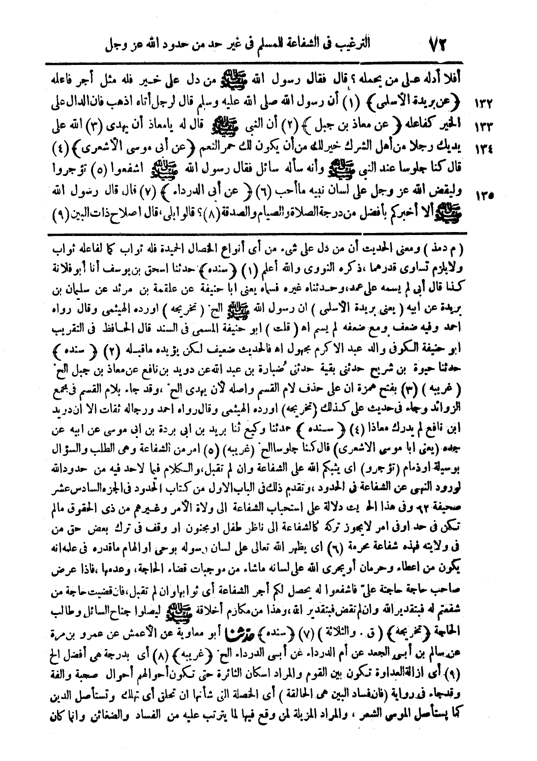 أفلا أدله على من يحمله؟ قال فقال رسول الله صلى الله عليه وسلم من دل على خير فله مثل أجر فاعله (عن بريدة الأسلمي) (1) أن رسول الله صلى الله عليه وسلم قال لرجل أتاه اذهب فإن الدال على الخير كفاعله (عن معاذ بن جبل) (2) أن النبي صلى الله عليه وسلم قال يا معاذ أن يهدى (3) الله على يديك رجلا من أهل الشرك خير لك من أن يكون لك حمر النعم (عن أبي موسى الأشعري) (4) قال كنا جلوسا عند النبي صلى الله عليه وسلم وأنه سأله سائل فقال رسول الله صلى الله عليه وسلم اشفعوا (5) تؤجروا وليقض الله عز وجل على لسان نبيه ما أحب (6) (عن ابي الدرداء) (7) قال قال رسول الله صلى الله عليه وسلم ألا أخبركم بأفضل من درجة الصلاة والصيام والصدقة (8)؟ قالوا بلى قال إصلاح ذات البين (9)