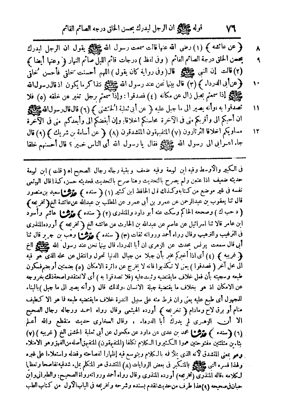 (عن عائشة) (1) رضي الله عنها قالت سمعت رسول الله صلى الله عليه وسلم يقول ان الرجل ليدرك يحسن الخلق بحسن الخلق درجة الصائم القائم (وفي لفظ) درجات قائم الليل صائم النهار (وعنها أيضا) (2) قالت إن النبي صلى الله عليه وسلم قال (وفي رواية كان يقول) اللهم احسنت خلقي فأحسن خلقي (عن أبي الدرداء) (3) قال بينما نحن عند رسول الله صلى الله عليه وسلم نتذاكر ما يكون إذ قال رسول الله صلى الله عليه وسلم إذا سمعتم بجبل زال عن مكانه (4) فصدقوا وإذا سمعتم برجل تغير عن خلقه (5) فلا تصدقوا به وأنه يصير إلى ما جبل عليه (عن أبي ثعلبة الخشنى) (6) قال قال رسول الله صلى الله عليه وسلم ان احبكم إلي واقربكم مني في الآخرة محاسنكم اخلاقا وان أبغضكم إلي وأبعدكم مني في الآخرة مساويكم اخلاقا الثرثارون (7) المتفيهقون المتشدقون (8) (عن اسامة بن شريك) (9) قال جاء اعرابي إلى رسول الله صلى الله عليه وسلم فقال يا رسول الله اي الناس خير؟ قال أحسنهم خلقا