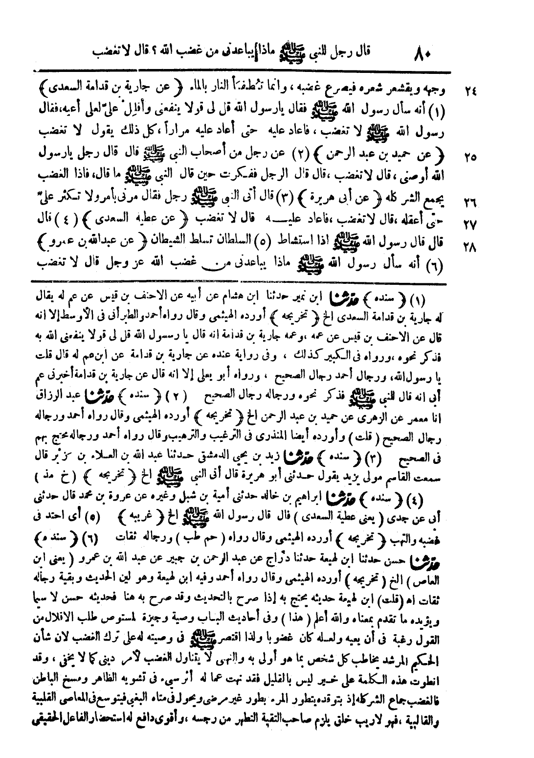 (1) (سنده) حدثنا ابن نيمر حدثنا ابن هشام عن أبيه عن الاحنف بن قيس عن عم له يقال له جارية بن قدامة السعدي الخ (تخريجه) أورده الهيثمي وقال رواه أحمد والطبراني في الأوسط إلا أنه قال عن الأحنف بن قيس عن عمه وعمه جارية بن قدامة أنه قال يا رسول الله صلى الله قل لي قولا ينفعني الله به فذكر نحوه ورواه في الكبير كذلك وفي رواية عنده عن جارية بن قدامة عن ابن عم له قال قلت يا رسول الله ورجال أحمد رجال الصحيح ورواه أبو يعلى إلا انه قال عن جارية بن قدامة أخبرني عم أبي أنه قال للنبي صلى الله عليه وسلم فذكر نحوه ورجاله رجال الصحيح (2) (سنده) حدثنا عبد الرزاق أنا معمر عن الزهري عن حميد بن عبد الرحمن الخ (تخريجه) أورده الهيثمي وقال رواه أحمد ورجاله رجال الصحيح (قلت) وأورده أيضا المنذري في الترغيب والترهيب وقال رواه أحمد ورجاله محتج بهم في الصحيح (3) (سنده) حدثنا زيد بن يحيى الدمشقى حدثنا عبد الله بن العلاء بن زبر قال سمعت القاسم مولى يزيد يقول حدثني أبو هريرة قال اتى النبي صلى الله عليه وسلم الخ (تخريجه) (خ مذ) (4) (سنده) حدثنا ابراهيم بن خالد حدثني أمية بن شبل وغيره عن عروة بن محمد قال حدثني أبي عن جدي (يعني عطية السعدي) قال قال رسول الله صلى الله عليه وسلم الخ (غريبه) (5) أي احتد في غضبه والتهب (تخريجه) أورده الهيثمي وقال رواه (حم طب) ورجاله ثقات (6) (سنده) حدثنا حسن حدثنا ابن لهيعة حدثنا دراج عن عبد الرحمن بن جبير عن عبد الله بن عمرو (يعني ابن العاص) الخ (تخريجه) أورده الهيثمي وقال رواه أحمد وفيه ابن لهيعة وهو لين الحديث وبقية رجاله ثقات اهـ (قلت) ابن لهيعة حديثه يحتج به إذا صرح بالتحديث وقد صرح به هنا فحديثه حسن لا سيما ويؤيده ما تقدم بمعناه والله أعلم (هذا) وفي أحاديث الباب وصية وجيزة لمستوص طلب الاقلال من القول رغبة في أن يعيه ولعله كان غضوبا ولذا اقتصر صلى الله عليه وسلم في وصيته على ترك الغضب لان شأن الحكيم المرشد يخاطب كل شخص بما هو أولى به والنهي لا يتناول الغضب لأمر ديني كما لا يخفى وقد انطوت هذه الكلمة على خير ليس بالقليل فقد نهت عما له أثر سيء في تشويه الظاهر ومسخ الباطن فالغضب جماع الشر كله إذ بتوقده يتطور المرء بطور غير ويحول في متاه البغي فيتوسع في المعاصي القلبية والقالبية فهو لا ريب خلق يلزم صاحب التقية التطهر من رجسه وأقوى دافع له استحضار الفاعل الحقيقي