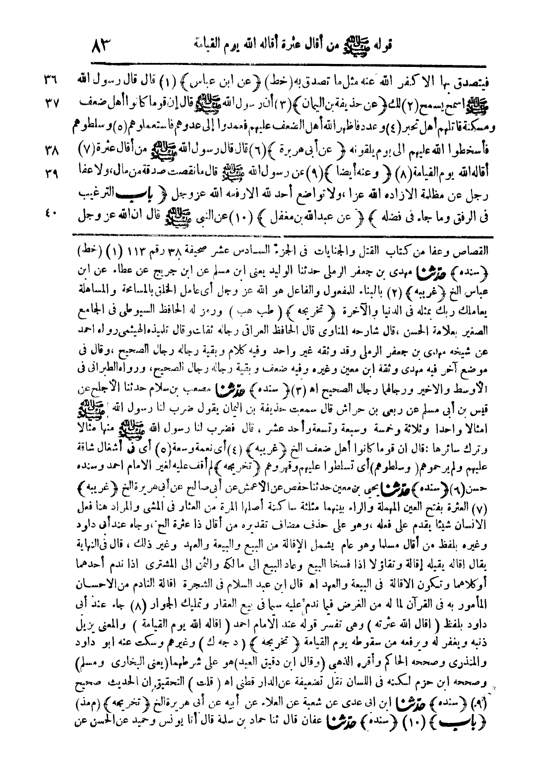 القصاص وعفا من كتاب القتل والجنايات في الجزء السادس عشر صحيفة 38 رقم 113 (1) (خط) (سنده) حدثنا مهدى بن جعفر الرملى حدثنا الوليد يعني ابن مسلم عن ابن جريج عن عطاء عن ابن عباس الخ (غريبه) (2) بالبناء للمفعول والفاعل هو الله عز وجل أي عامل الخلق بالمسامحة والمساهلة يعاملك ربك بمثله في الدنيا والآخرة (تخريجه) (طب هب) ورمز له الحافظ السيوطي في الجامع الصغير بعلامة الحسن قال شارحه المناوى قال الحافظ العراقي رجاله ثقات وقال تلميذه الهيثمي رواه أحمد عن شيخه مهدي بن جعفر الرملى وقد وثقه غير واحد وفيه كلام وبقية رجاله رجال الصحيح وقال في موضوع آخر فيه مهدي وثقه ابن معين وغيره وفيه ضعف وبقية رجاله رجال الصحيح ورواه الطبراني في الأوسط والأخير ورجالهما رجال الصحيح اهـ (3) (سنده) حدثنا مصعب بن سلام حدثنا الأجلح عن قيس بن أبي مسلم عن ربعى بن حراش قال سمعت حذيفة بن اليمان يقول ضرب لنا رسول الله صلى الله عليه وسلم أمثالا واحدا وثلاثة وخمسة وسبعة وتسعة وأحد عشر قال فضرب لنا رسول الله صلى الله عليه وسلم منها مثالا وترك سائرها قال ان قوما كانوا أهل ضعف الخ (غريبه) (4) أي نعمة وسعة (5) أي في اشغال شاقة عليهم ولم يرحموهم (وسلطوهم) أي تسلطوا عليهم وقهروهم (تخريجه) لم أقف عليه لغير الامام أحمد وسنده حسن (6) (سنده) حدثنا يحيى بن معين حدثنا حفص عن الأعمش عن أبي صالح عن أبي هريرة الخ (غريبه) (7) العثرة بفتح العين المهملة والراء بينهما مثلثة ساكنة أصلها المرة من العثار في المشي والمراد هنا فعل الإنسان شيئا يقدم على فعله وهو على حذف مضاف تقديره من أقال ذا عثرة الخ وجاء عند أبي داود وغيره بلفظ من أقال مسلما وهو عام يشمل الإقالة من البيع والبيعة والعهد وغير ذلك قال في النهاية يقال اقاله يقيله إقالة وتقاؤلا إذا فسخا البيع وعاد البيع إلى مالكه والثمن إلى المشترى إذا ندم أحدهما أو كلاهما وتكون الإقالة في البيعة والعهد اهـ قال ابن عبد السلام في الشجرة اقاله النادم من الاحسان المأمور به في القرآن لما له من الغرض فما ندم عليه سما في بيع العقار وتمليك الجوار (8) جاء عن أبي داود بلفظ (اقال الله عثرته) وهي تفسر قوله عند الامام احمد (اقاله الله يوم القيامة) والمعنى يزيل ذنبه ويغفر له ويرفعه من سقوطه يوم القيامة (تخريجه) (د جه ك) وغيرهم وسكت عنه أبو داود والمنذري وصححه الحاكم وأقره الذهبي (وقال ابن دقيق العيد) هو على شرطهما (يعني البخاري ومسلم) وصححه ابن حزم لكنه في اللسان نقل تضعيفه عن الدار قطنى اهـ (قلت) التحقيق ان الحديث صحيح (9) (سنده) حدثنا ابن ابي عدي عن شعبة عن العلاء عن أبيه عن ابي هريرة الخ (تخريجه) (م مذ) (باب) (10) (سنده) حدثنا عفان قال ثنا حماد بن سلمة قال أنا يونس وحميد عن الحسن عن