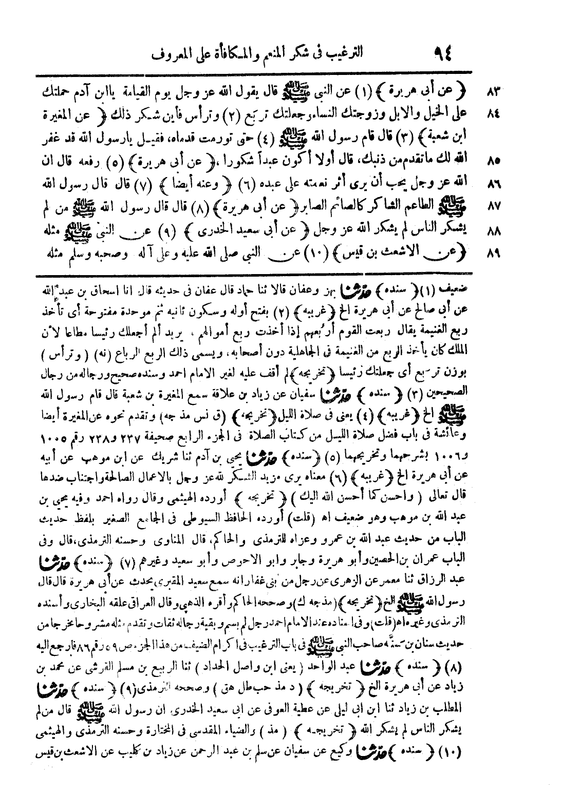 (عن أبي هريرة) (1) عن النبي صلى الله عليه وسلم قال يقول الله عز وجل يوم القيامة يا ابن آدم حملتك على الخيل والابل وزوجتك النساء وجعلتك تربع (2) وترأس فأين شكر ذلك (عن المغيرة ابن شعبة) (3) قال قام رسول الله صلى الله عليه وسلم (4) حتى تورمت قدماه فقيل يا رسول الله قد غفر الله لك ما تقدم من ذنبك قال أولا أكون عبدا شكورا (عن أبي هريرة) (5) رفعه قال ان الله عز وجل يحب أن يرى أثر نعمته على عبده (6) (وعنه أيضا) (7) قال قال رسول الله صلى الله عليه وسلم الطاعم الشاكر كالصائم الصابر (عن أبي هريرة) (8) قال قال رسول الله صلى الله عليه وسلم من لم يشكر الناس لم يشكر الله عز وجل (عن أبي سعيد الخدري) (9) عن النبي صلى الله عليه وسلم مثله (عن الأشعث بن قيس) (10) عن النبي صلى الله عليه وعلى آله وصحبه وسلم مثله