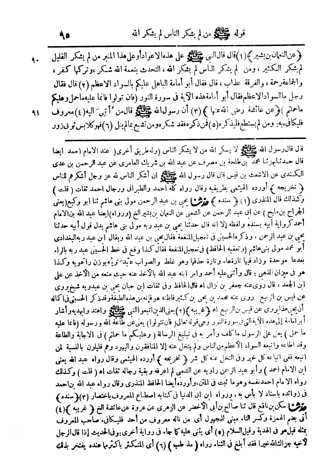 (عن النعمان بن بشير) (1) قال قال النبي صلى الله عليه وسلم على هذه الأعواد أو على هذا المنبر من لم يشكر القليل لم يشكر الكثير ومن لم يشكر الناس لم يشكر الله التحدث بنعمة الله شكر وتركها كفر والجماعة رحمة والفرقة عذاب قال فقال أبو أمامة الباهلي عليكم بالسواد الأعظم (2) قال فقال رجل ما السواد الأعظم فقال أبو أمامة هذه الآية في سورة النور (فإن تولوا فإنما عليه ما حمل وعليكم ما حملتم) (عن عائشة رضي الله عنها) (3) أن رسول الله صلى الله عليه وسلم قال من أتى إليه (4) معروف فليكافئ به ومن لم يستطع فليذكره (5) فمن ذكره فقد شكره ومن تشبع بما لم ينل (6) فهو كلابس ثوبي زور