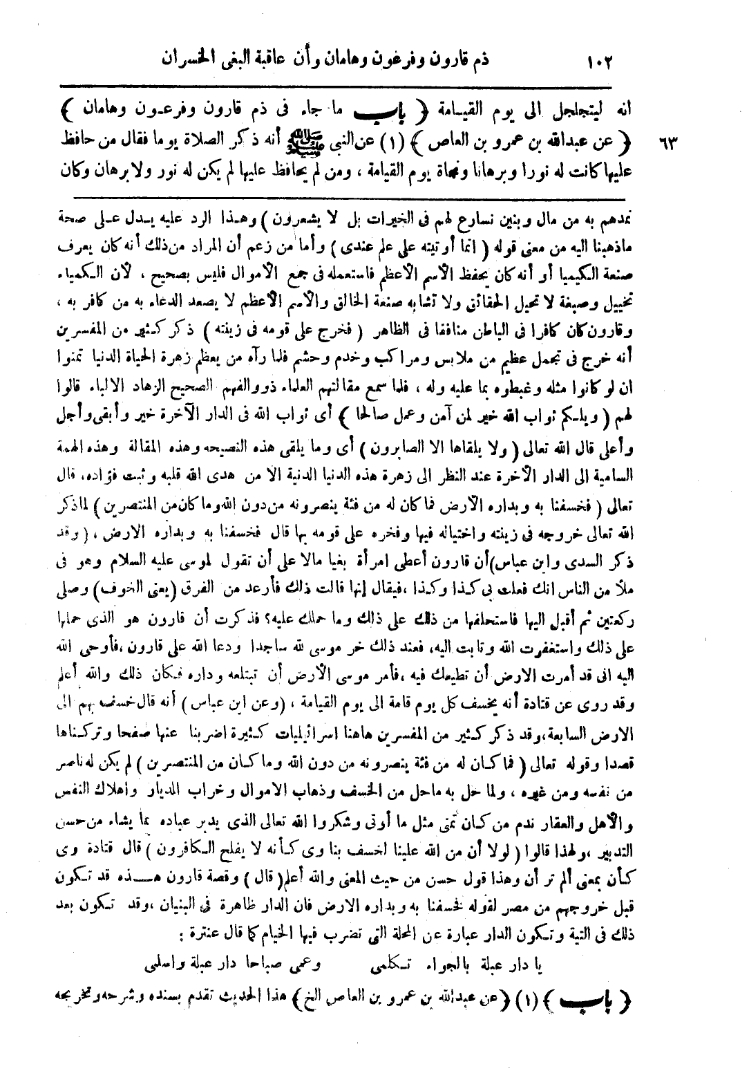إنه ليتجلجل الى يوم القيامة (باب ما جاء فى ذم قارون وفرعون وهامان) (عن عبد الله بن عمرو بن العاص) (1) عن النبى صلي الله عليه وسلم أنه ذكر الصلاة يوما فقال من حافظ عليها كانت له نورا وبرهانا ونجاة يوم القيامة، ومن لم يحافظ عليها لم يكن له نور ولا برهان وكان