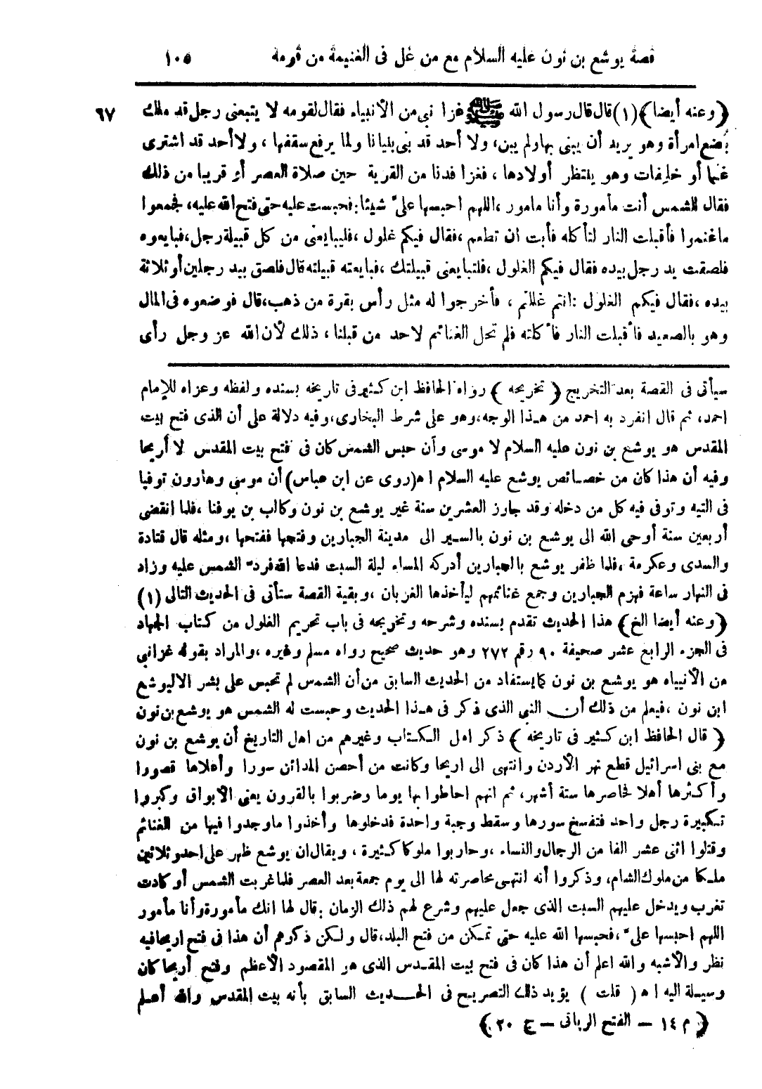 سيأتي في القصة بعد التخريج (تخريجه) رواه الحافظ ابن كثير فى تاريخه بسنده ولفظه وعزاه للإمام احمد، ثم قال انفرد به احمد من هذا الوجه، وهو على شرط البخارى، وفيه دلالة على أن الذى فتح بيت المقدس هو يوشع بن نون عليه السلام لا موسى وأن حبس الشمس كان فى فتح بيت المقدس لا أريحا وفيه أن هذا كان من خصائص يوشع عليه السلام إه (روى عن ابن عباس) أن موسى وهارون توفيا فى التيه وتوفى فيه كل من دخله وقد جاوز العشرين سنة غير يوشع بن نون وكالب بن يوفنا، فلما انقضى أربعين سنة أوحى الله الى يوشع بن نون بالسير الى مدينة الجبارين وفتحها ففتحها، ومثله قال قتادة والسدى وعكرمة، فلما ظفر يوشع بالجبارين أدركه المساء ليلة السبت فدعا الله فردّ الشمس عليه وزاد فى النهار ساعة فهزم الجبارين وجمع غنائمهم ليأخذها الغربان، وبقية القصة ستأتى فى الحديث التالى (1) (وعنه أيضا الخ) هذا الحديث تقدم بسنده وشرحه وتخريجه فى باب تحريم الغلول من كتاب الجهاد فى الجزء الرابع عشر صحيفة 90 رقم 272 وهو حديث صحيح رواه مسلم وغيره، والمراد بقوله غزا نبى من الأنبياء هو يوشع بن نون كما يستفاد من الحديث السابق من أن الشمس لم تحبس على بشر الا ليوشع ابن نون، فيعلم من ذلك أن النبى ذكر فى هذا الحديث وحبست له الشمس هو يوشع بن نون (قال الحافظ ابن كثير فى تاريخه) ذكر اهل الكتاب وغيرهم من اهل التاريخ أن يوشع بن نون مع بنى اسرائيل قطع نهر الأردن وانتهى الى اريحا وكانت من أحصن المدائن سورا وأعلاها قصورا وأكثرها أهلا فحاصرها ستة أشهر، ثم انهم احاطوا بها يوما وضربوا بالقرون يعنى الأبواق وكبروا تكبيرة رجل واحد فتفسخ سورها وسقط وجبة واحدة فدخلوها وأخذوا ما وجدوا فيها من الغنائم وقتلوا اثنى عشر الفا من الرجال والنساء، وحاربوا ملوكا كثيرة، ويقال ان يوشع ظهر على احد وثلاثين ملكا من ملوك الشام، وذكروا أنه انتهى محاصرته لها الى يوم جمعة بعد العصر فلما غربت الشمس أو كادت تغرب ويدخل عليهم السبت الذى جعل عليهم وشرع لهم ذلك الزمان: قال لها انك مأمورة وأنا مأمور اللهم احبسها علىَّ، فحبسها الله عليه حتى تمكن من فتح البلد، قال ولكن ذكرهم أن هذا فى فتح اريحا فيه نظر والأشبه والله أعلم أن هذا كان فى فتح بيت المقدس الذى هو المقصود الأعظم وفتح أريحا كان وسيلة اليه اه (قلت) يؤيد ذلك التصريح فى الحديث السابق بأنه بيت المقدس والله أعلم