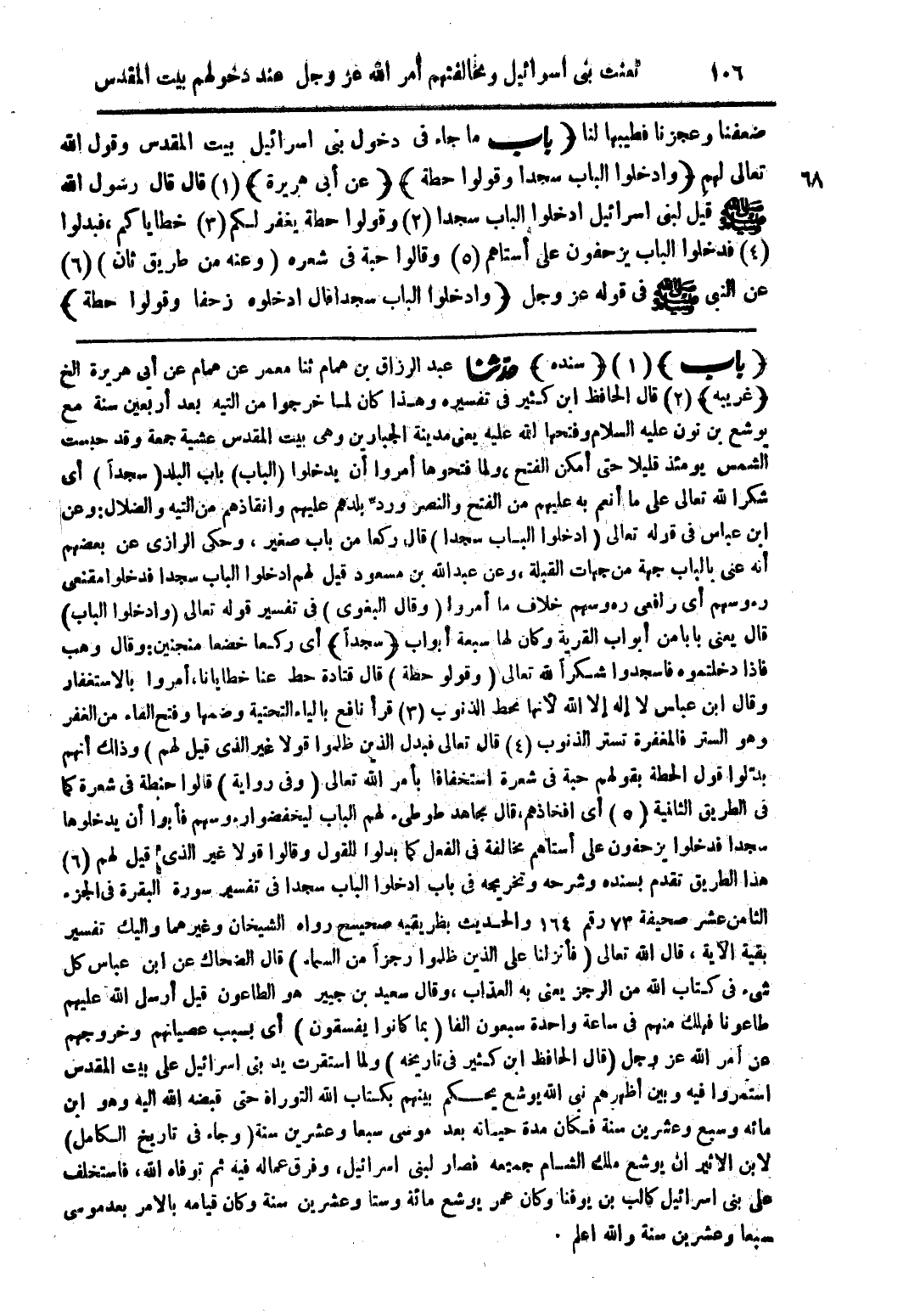 (باب) (1) (سنده) حدثنا عبد الرزاق بن همام ثنا معمر عن همام عن أبى هريرة الخ (غريبه) (2) قال الحافظ ابن كثير فى تفسيره وهذا كان لما خرجوا من التيه بعد أربعين سنة مع يوشع بن نون عليه السلام وفتحها الله عليه يعنى مدينة الجبارين وهى بيت المقدس عشية جمعة وقد حبست الشمس يومئذ قليلا حتى أمكن الفتح، ولما فتحوها أمروا أن يدخلوا (الباب) باب البلد (سجداَ) أى شكرا لله تعالى على ما أنعم به عليهم من الفتح والنصر وردِّ بلدهم عليهم وانقاذهم من التيه والضلال: وعن ابن عباس فى قوله تعالى (أدخلوا الباب سجدا) قال ركعا من باب صغير، وحكى الرازى عن بعضهم أنه عنى بالباب جهة من جهات القبلة، وعن عبد الله بن مسعود قيل لهم ادخلوا الباب سجدا فدخلوا مقنعى رءوسهم أى رافعى رءوسهم خلاف ما أمروا (وقال البغوى) فى تفسير قوله تعالى (وادخلوا الباب) قال يعنى بابا من أبواب القرية وكان لها سبعة أبواب (سجداَ) أى ركعا خضعا منحنين: وقال وهب فاذا دخلتموه فاسجدوا شكراً لله تعالى (وقولو حطة) قال قتادة حط عنا خطايانا، أمروا بالاستغفار وقال ابن عباس لا إله إلا الله لأنها محط الذنوب (3) قرأ نافع بالياء التحتية وضمها وفتح الفاء من الغفر وهو الستر فالمغفرة تستر الذنوب (4) قال تعالى فبدل الذين ظلموا قولا غير الذى قيل لهم) وذلك أنهم بدّلوا قول الحطة بقولهم حبة فى شعرة استخفافا بأمر الله تعالى (وفى رواية) قالوا حنطة فى شعرة كما فى الطريق الثانية (5) أى افخاذهم، قال مجاهد طوطئ لهم الباب ليخفضوا رءوسهم فأبوا أن يدخلوها سجدا فدخلوا يزحفون على أستاهم مخالفة فى الفعل كما بدلوا القول وقالوا قولا غير الذى قيل لهم (6) هذا الطريق تقدم بسنده وشرحه وتخريجه فى باب ادخلوا الباب سجدا فى تفسير سورة البقرة فى الجزء الثامن عشر صحيفة 73 رقم 164 والحديث بطريقيه صحيح رواه الشيخان وغيرهما واليك تفسير بقية الآية، قال الله تعالى (فأنزلنا على الذين ظلموا رجزاً من السماء) قال الضحاك عن أبن عباس كل شئ فى كتاب الله من الرجز يعنى به العذاب، وقال سعيد بن جبير هو الطاعون قيل أرسل الله عليهم طاعونا فهلك منهم فى ساعة واحدة سبعون الفا (بما كانوا يفسقون) أى بسبب عصيانهم وخروجهم عن أمر الله عز وجل (قال الحافظ ابن كثير فى تاريخه) ولما استقرت يد بنى اسرائيل على بيت المقدس استمروا فيه وبين أزهرهم نبى الله يوشع يحكم بينهم بكتاب الله التوراة حتى قبضه الله اليه وهو ابن مائة وسبع وعشرين سنة فكان مدة حياته بعد موسى سبعا وعشرين سنة (وجاء فى تاريخ الكامل) لابن الأثير ان يوشع ملك الشام جمعه فصار لبنى اسرائيل، وفرق عماله فيه ثم توفاه الله، فاستخلف على بنى اسرائيل كالب بن يوفنا وكان عمر يوشع مائة وستا وعشرين سنة وكان قيامه بالامر بعد موسى سبعا وعشرين سنة والله اعلم.