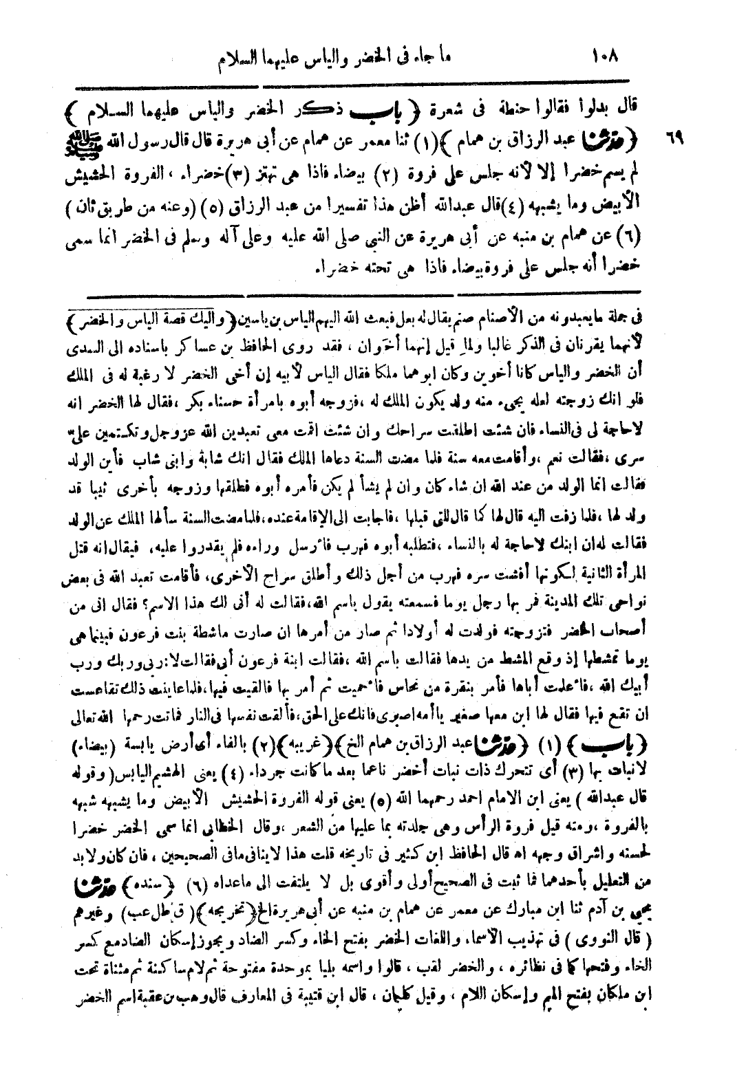 في جملة ما يعبدونه من الأصنام صنم يقال له بعل فبعث الله اليهم الياس بن ياسين (واليك قصة الياس والخضر) لأنهما يقرنان فى الذكر غالبا ولماِ قيل إنهما أخَوان، فقد روى الحافظ بن عساكر بأسناده الى السدى أن الخضر والياس كانا أخوين وكان ابوهما ملكا فقال الياس لأبيه إن أخى الخضر لا رغبة له فى الملك فلو انك زوجته لعله يجئ منه ولد يكون الملك له، فزوجه أبوه بامرأة حسناء بكر، فقال لها الخضر انه لا حاجة لى فى النساء فان شئت اطلقت سراحك وان شئت اقمت معى تعبدين الله عز وجل وتكتمين علىّ سرى، فقالت نعم، وأقامت معه سنة فلما مضت السنة دعاها الملك فقال انك شابة وابنى شاب فأين الولد فقالت انما الولد من عند الله ان شاء كان وان لم يشأ لم يكن فأمره أبوه فطلقها وزوجه بأخرى ثيبا قد ولد لها، فلما زفت اليه قال لها كما قال للتى قبلها، فاجابت الى الإقامة عنده، فلما مضت السنة سألها الملك عن الولد فقالت له ان ابنك لا حاجة له بالنساء، فتطلبه أبوه فهرب فأرسل وراءه فلم يقدروا عليه، فيقال انه قتل المرأة الثانية لكونها أفشت سره فهرب من أجل ذلك وأطلق سراح الأخرى، فأقامت تعبد الله فى بعض نواحى تلك المدينة فمر بها رجل يوما فسمعته يقول باسم الله، فقالت له أنى لك هذا الاسم؟ فقال انى من الخضر فتزوجته فولدت له أولادا ثم صار من أمرها ان صارت ماشطة بنت فرعون فبينما هى يوما تمشطها إذ وقع المشط من يدها فقالت باسم الله، فقالت ابنة فرعون أبى فقالت لا: ربى وربك ورب أبيك الله، فأعلمت أباها فأمر بنقرة من نحاس فأحميت ثم أمر بها فالقيت فيها، فلما عاينت ذلك تقاعست ان تقع فيها فقال لها ابن معها صغير يا أمه اصبرى فانك على الحق، فألقت نفسها فى النار فماتت رحمها الله تعالى (باب) (1) (حدثنا عبد الرازق بن همام الخ) (غريبه) (2) بالفاء أى أرض يابسة (بيضاء) لا نبات بها (3) أى تتحرك ذات نبات أخضر ناعما بعد ما كانت جرداء (4) يعنى الهشيم اليابس (وقوله قال عبد الله) يعنى ابن الامام احمد رحمها الله (5) يعنى قوله الفروة الحشيش الأبيض وما يشبهه شبهه بالفروة، ومنه قيل فروة الرأس وهى جلدته بما عليها من الشعر، وقال الخطابى انما سمى الخضر خضرا لحسنه واشراق وجهه اه قال الحافظ ابن كثير فى تاريخه قلت هذا لا ينافى ما فى الصحيحين، فان كان ولا بد من التعليل بأحدهما فى الصحيح أولى وأقوى بل لا يلتفت الى ما عداه (6) (سنده) حدثنا يحي بن آدم ثنا ابن مبارك عن معمر عن همام بن منبه عن أبى هريرة الخ (تخريجه) (ق طل عب) وغيرهم (قال النووى) فى تهذيب الأسماء واللغات الخضر بفتح الخاء وكسر الضاد ويجوز إسكان الضاد مع كسر الخاء وفتحها كما فى نظائره، والخضر لقب، قالوا واسمه بليا بموحدة مفتوحة ثم لام ساكنة ثم مثناة تحت ابن ملكان بفتح الميم وإسكان اللام، وقيل كليمان، قال ابن قتيبة فى المعارف قال وهب بن عقبة اسم الخضر