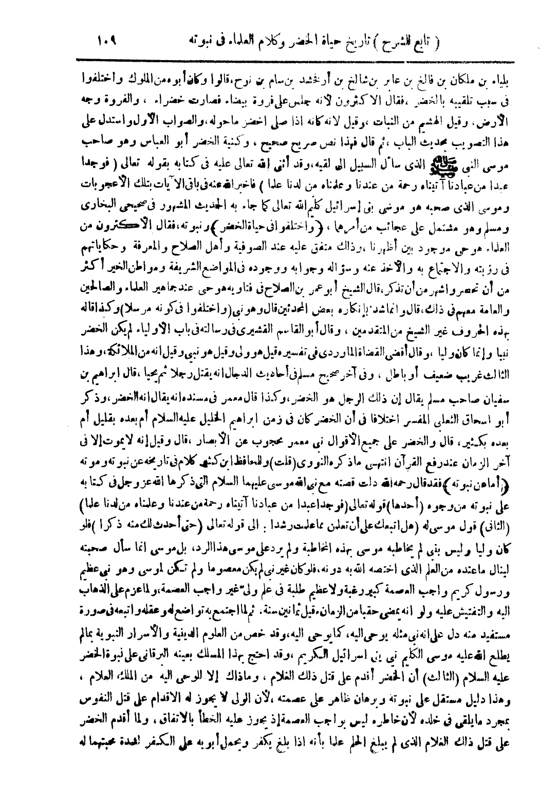 فهذا نص صريح صحيح، وكنية الخضر أبو العباس وهو صاحب موسى النبى صلى الله عليه وسلم الذى سأل السبيل الى لقيه، وقد أثنى الله تعالى عليه فى كتابه بقوله تعالى (فوجدا عبدا من عبادنا آتيناه رحمة من عندنا وعلمناه من لدنا علما) فاخبر الله عنه فى باقى الآيات بتلك الأعجوبات وموسى الذى صحبه هو موسى بنى إسرائيل كليم الله تعالى كما جاء به الحديث المشهور فى صحيحى البخارى ومسلم وهو مشتمل على عجائب من أمرهما، (واختلفوا فى حياة الخضر) ونبوته، فقال الأكثرون من العلماء هو حى موجود بين أظهرنا، وذلك متفق عليه عند الصوفية وأهل الصلاح والمعرفة وحكاياتهم فى رؤيته والاجتماع به والأخذ عنه وسؤاله وجوابه ووجوده فى المواضع الشريفة ومواطن الخير أكثر من أن تحصر واشهر من أن تذكر، قال الشيخ أبو عمر بن الصلاح فى فتاويه هو حى عند جماهير العلماء والصالحين والعامة معهم فى ذلك، قال وانما شد بإنكاره بعض المحدثين قال وهو نبى (واختلفوا فى كونه مرسلا) وكذا قاله بهذه الحروف غير الشيخ من المتقدمين، وقال أبو القاسم القشيرى فى رسالته فى باب الأولياء لم يكن الخضر نبيا وإنما كان وليا، وقال أقضى القضاة الماوردى فى تفسيره قيل هو ولى وقيل هو نبي وقيل انه من الملائكة، وهذا الثالث غريب ضعيف أو باطل، وفى آخر صحيح مسلم فى أحاديث الدجال انه يقتل رجلا ثم يحيا، قال ابراهيم بن سفيان صاحب مسلم يقال إن ذلك الرجل هو الخضر، وكذا قال معمر فى مسنده انه يقال انه الخضر، وذكر أبو اسحاق الثعلبى المفسر اختلافا فى أن الخضر كان فى زمن ابراهيم الخليل عليه السلام أم بعده بقليل أم بعده بكثير، قال والخضر على جميع الأقوال نبى معمر محجوب عن الأبصار، قال وقيل إنه لا يموت إلا فى آخر الزمان عند رفع القرآن انتهى ما ذكره النووى (قلت) وللمحافظ ابن كثير كلام فى تاريخه عن نبوته وموته (أما عن نبوته) فقد قال رحمه الله دلت قصته مع نبى الله موسى عليهما السلام التى ذكرها الله عز وجل فى كتابه على نبوته من وجوه (أحدها) قوله تعالى (فوجدا عبدا من عبادنا آتيناه رحمة من عندنا وعلمناه من لدنا علما) (الثانى) قول موسى له (هل اتبعك على أن تعلمن مما علمت رشدا: الى قوله تعالى (حتى أحدث لك منه ذكرا) فلو كان وليا وليس بنبي لم يخاطبه موسى بهذه المخاطبة ولم يرد على موسى هذا الرد، بل موسى انما سأل صحبته لينال ما عنده من العلم الذى اختصه الله به دونه، فلو كان غير نبى لم يكن معصوما ولم تكن لموسى وهو نبى عظيم ورسول كريم واجب العصمة كبير رغبة ولا عظيم طلبة فى علم ولىّ غير واجب العصمة، ولما عزم على الذهاب اليه والتفتيش عليه ولو انه يمضى حقبا من الزمان قيل ثمانين سنة، ثم لما اجتمع به تواضع له وعقله واتبعه فى صورة مستفيد منه دل على انه نبى مثله يوحى اليه، كما يوحى اليه، وقد خص من العلوم الدينية والأسرار النبوية بما لم يطلع عليه موسى الكليم نبى بنى اسرائيل الكريم، وقد احتج بهذا المسلك بعينه البرقانى على نبوة الخضر عليه السلام (الثالث) أن الخضر أقدم على قتل ذلك الغلام، وما ذاك إلا للوحى اليه من الملك العلام، وهذا دليل مستقل على نبوته وبرهان ظاهر على عصمته، لأن الولى لا يجوز له الاقدام على قتل النفوس بمجرد ما يلقى فى خلده لأن خاطره ليس بواجب العصمة إذ يجوز عليه الخطأ بالاتفاق، ولما أقدم الخضر على قتل ذلك الغلام الذى لم يبلغ الحلم علما بأنه اذا بلغ يكفر ويحمل أبويه على الكفر لشدة محبتهما له