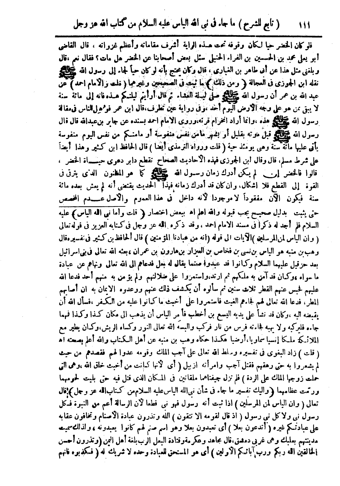 تطرف، قال ابن عمر فوُهِل الناس فى مقالة رسول الله صلى الله عليه وسلم هذه، وانما أراد انخرام قرئه، وروى الامام احمد بسنده عن جابر بن عبد الله قال قال رسول الله صلى الله عليه وسلم قبل موته بقليل أو بشهر ما من نفس منفوسة أو ما منكم من نفس اليوم منفوسة يأتى عليها مائة سنة وهى يومئذ حية (قلت ورواه الترمذى أيضا) قال الحافظ ابن كثير وهذا أيضاً على شرط مسلم، قال وقال ابن الجوزى فهذه الأحاديث الصحاح دابر دعوى حياة الخضر، قالوا فالخضر إن لم يكن أدرك زمان رسول الله صلى الله عليه وسلم كما هو المظنون الذى يترقى فى القوة إلى القطع فلا اشكال، وان كان قد أدرك زمانه فهذا الحديث يقتضى أنه لم يعش بعده مائة سنة فيكون الآن مفقوداً لا موجودا لأنه داخل فى هذا العموم والأصل عدم المخصص حتى يثبت بدليل صحيح يجب قبوله والله اعلم اه ببعض اختصار (قلت واما نبى الله الياس) عليه السلام فلم أجد له ذكرا فى مسند الامام احمد، وقد ذكره الله عز وجل فى كابه العزيز فى قوله تعالى (وان الياس لمن المرسلين) الآيات الى قوله (أنه من عبادنا المؤمنين) قال الحافظ بن كثير فى تفسيره قال وهب بن منبه هو الياس بن نسى بن فخاص بن العيزار بن هارون بن عمران، بعثه الله تعالى فى بنى اسرائيل بعد حزقيل عليهما السلام وكانوا قد عبدوا صنما يقال له بعل فدعاهم الى الله تعالى ونهاهم عن عبادة ما سواه، وكان قد آمن به ملكهم ثم ارتد، واستمروا على ضلالتهم ولم يؤمن به منهم أحد فدعا الله عليهم فحبس عنهم القطر ثلاث سنين ثم سألوه أن يكشف ذلك عنهم ووعدوه الايمان به ان أصابهم المطر، فدعا الله تعالى لهم فجاءهم الغيث فاستمروا على أخبث ما كانوا عليه من الكفر، فسأل الله أن يقبضه اليه، وكان قد نشأ على يديه اليسع بن أخطب فأمر الياس أن يذهب الى مكان كذا وكذا فمهما جاءه فليركبه ولا يهبه فجاءته فرس من نار فركب والبسه الله تعالى النور وكساه الريش، وكان يطير مع الملائكة ملكا إنسيا سماويا، أرضيا هكذا حكاه وهب بن منبه عن أهل الكتاب والله أعلم بصحته اه (قلت) زاد البغوى فى تفسيره وسلط الله تعالى على آجب الملك وقومه عدوا لهم فقصدهم من حيث لم يشعروا به حتى رهقهم فقتل آجب وامرأته ازبيل (أى لأنها كانت من أخبث خلق الله، وهى التى حملت زوجها الملك على الردة) فلم تزل جيفتاهما ملقاتين فى المكان الذى قتل فيه حتى بليت لحومها ورّمت عظامهما (واليك تفسير ما جاء فى شأن نبى الله الياس عليه السلام من كتاب الله عز وجل): قال تعالى (وان الياس لمن المرسلين) اذا ثبت أنه رسول فهو نبى قطعا لأن الرسالة أعم من النبوة فكل رسول نبى ولا كل نبى رسول (اذ قال لقومه الا تتقون) الله وتذرون عبادة الأصنام وتخافون عقابه على عبادتكم غيره (أتدعون بعلا) أى تعبدون بعلا وهو اسم صنم لهم كانوا يعبدونه، ولذلك سميت مدينتهم بعلبك وهى غربى دمشق، قال مجاهد وعكرمة وقتادة البعل الرب بلغة أهل اليمن (وتذرون أحسن الخالقين الله ربكم ورب آبائكم الأولين) أى هو المستحق للعبادة وحده لا شريك له (فكذبوه فإنهم