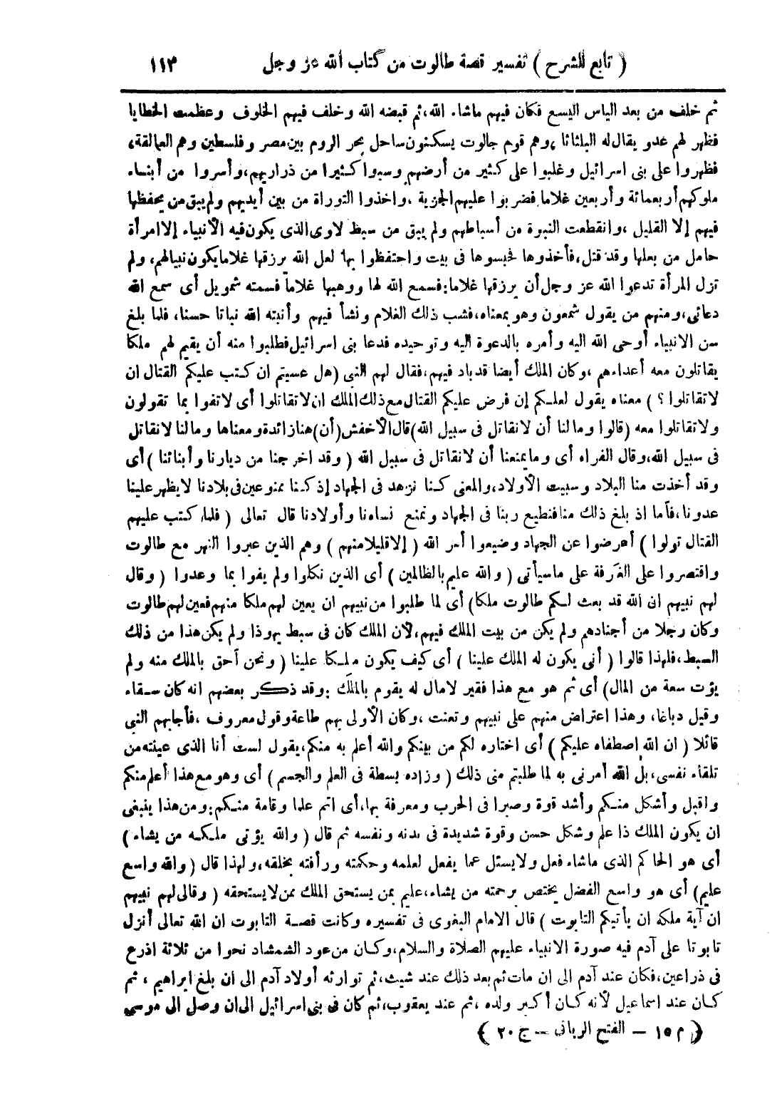 ثم خلف من بعد الياس اليسع فكان فيهم ما شاء الله، ثم قبضه الله وخلف فيهم الخلوف وعظمت الخطايا فظهر لهم عدو يقال له البلثائا، وهو قوم جالوت يسكنون ساحل بحر الروم بين مصر وفلسطين وهم العمالقة، فظهروا على بنى اسرائيل وغلبوا على كثير من أرضهم وسبوا كثيرا من ذرأريهم، وأسروا من أبناء ملوكهم أربعمائة وأربعين غلاما فضربوا عليهم بالجزية، واخذوا التوراة من بين أيديهم ولم يبق من يحفظها فيهم إلا القليل، وانقطعت النبوة من أسباطهم ولم يبق من سبط لاوى الذى يكون فيه الأنبياء إلا امرأة حامل من بعلها وقد قتل، فأخذوها فحبسوها فى بيت واحتفظوا بها لعل الله يرزقها غلاما يكون نبيا لهم، ولم تزل المرأة تدعوا الله عز وجل أن يرزقها غلاما: فسمع الله لها ووهبها غلاماً فسمته شمويل أى سمع الله دعائى، ومنهم من يقول شمعون وهو بمعناه، فشب ذلك الغلام ونشأ فيهم وأنبته الله نباتاً حسنا، فلما بلغ سن الانبياء أوحى الله اليه وأمره بالدعوة اليه وتوحيده فدعا بنى اسرائيل فطلبوا منه أن يقيم لهم ملكا يقاتلون معه أعداءهم، وكان الملك أيضا قد باد فيهم، فقال لهم النبى (هل عسيتم ان كتب عليكم القتال ان لا تقاتلوا؟) معناه يقول لعلكم إن فرض عليكم القتال مع ذلك الملك أن لا تقاتلوا أى لا تفوا بما تقولون ولا تقاتلوا معه (قالوا وما لنا أن لا نقاتل فى سبيل الله) قال الأخفش (أن) هنا زائدة ومعناها ومالنا لا نقاتل فى سبيل الله، وقال الفراء أى وما يمنعنا أن لا نقاتل فى سبيل الله (وقد اخرجنا من ديارنا وأبنائنا) أى وقد أخذت منا البلاد وسبيت الأولاد، والمعنى كنا نزهد فى الجهاد إذ كنا ممنوعين فى بلادنا لا يظهر علينا عدونا، فأما اذ بلغ ذلك منا فنطيع ربنا فى الجهاد ونمنع نساءنا وأولادنا قال تعالى (فلما كتب عليهم القتال تولوا) أعرضوا عن الجهاد وضيعوا أمر الله (إلا قليلا منهم) وهم الذين عبروا النهر مع طالوت واقتصروا على الغَرفة على ما سيأتى (والله عليم بالظالمين) أى الذين نكلوا ولم يفوا بما وعدوا (وقال لهم نبيهم ان الله قد بعث لكم طالوت ملكا) أى لما طلبوا من نبيهم ان يعين لهم ملكا منهم فعين لهم طالوت وكان رجلا من أجنادهم ولم يكن من بيت الملك فيهم، لأن الملك كان فى سبط يهوذا ولم يكن هذا من ذلك السبط، فلهذا قالوا (أنى يكون له الملك علينا) أى كيف يكون ملكا علينا (ونحن أحق بالملك منه ولم يؤت سعة من المال) أى ثم هو مع هذا فقير لا مال له يقوم الملَك: وقد ذكر بعضهم انه كان سقاء وقيل دباغا، وهذا اعتراض منهم على نبيهم وتعنت، وكان الأولى بهم طاعة وقول معروف، فأجابهم النبى قائلا (ان الله اصطفاه عليكم) أى اختاره لكم من بينكم والله أعلم به منكم، يقول لست أنا الذى عينته من تلقاء نفسى، بل الله أمرنى به لما طلبتم منى ذلك (وزاده بسطة فى العلم والجسم) أى وهو مع هذا أعلم منكم واقبل وأشكل منكم وأشد قوة وصبرا فى الحرب ومعرفة بها، أى اتم علما وقامة منكم: ومن هذا ينبغى ان يكون الملك ذا علم وشكل حسن وقوة شديدة فى بدنه ونفسه ثم قال (والله يؤتى ملكه من يشاء) أى هو الحاكم الذى ما شاء فعل ولا يسئل عما يفعل لعلمه وحكمته ورأفته بخلقه، ولهذا قال (والله واسع عليم) أى هو واسع الفضل يختص برحمته من يشاء، عليم بمن يستحق الملك ممن لا يستحقه (وقال لهم نبيهم ان آية ملكه ان يأتيكم التابوت) قال الامام البغوى فى تفسيره وكانت قصة التابوت ان الله تعالى أنزل تابوتا على آدم فيه صورة الانبياء عليهم الصلاة والسلام، وكان من عود الشمشاد نحوا من ثلاثة اذرع فى ذراعين، فكان عند آدم الى ان مات ثم بعد ذلك عند شيث، ثم توارثه أولاد آدم الى ان بلغ ابراهيم، ثم كان عند اسماعيل لأنه كان أكبر ولده، ثم عند يعقوب، ثم كان فى بنى اسرائيل إلى أن وصل إلى موسى