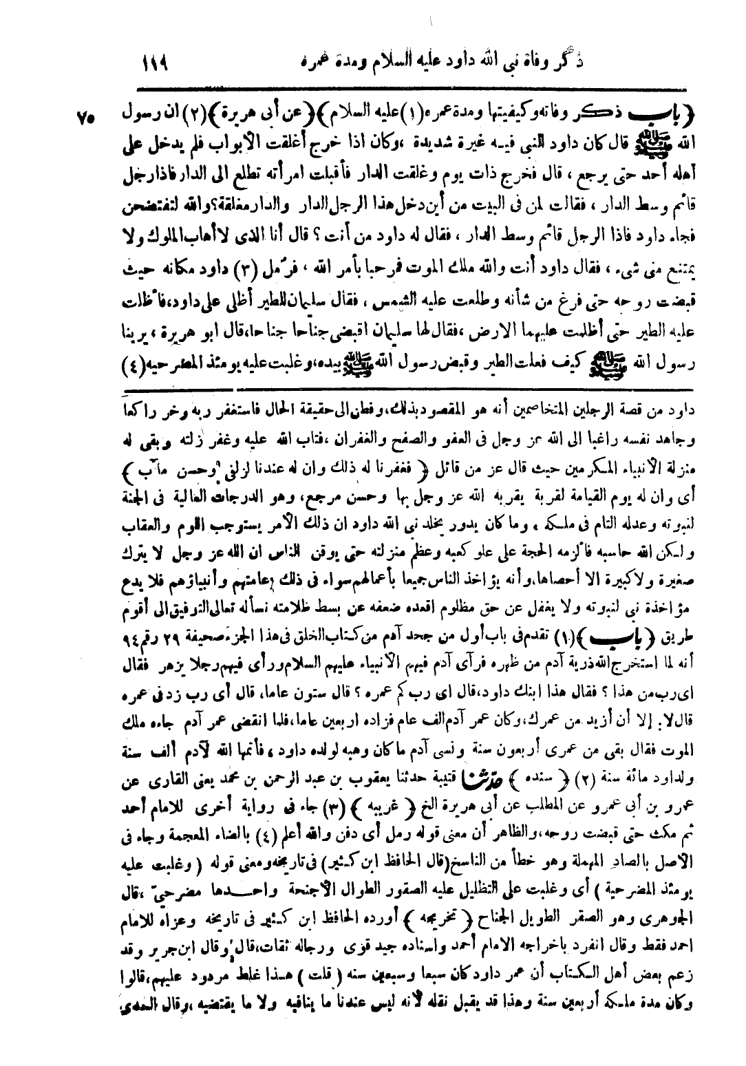 داود من قصة الرجلين المتخاصمين أنه هو المقصود بذلك، وفطن الى حقيقة الحال فاستغفر ربه وخر راكعا وجاهد نفسه راغبا الى الله عز وجل فى العفو والصفح والغفران، فتاب الله عليه وغفر زلته وبقى له منزلة الأنبياء المكرمين حيث قال عز من قائل (فغفرنا له ذلك وان له عندنا لزلفى وحسن مآب) أى وان له يوم القيامة لقربة يقربه الله عز وجل بها وحسن مرجع، وهو الدرجات العالية فى الجنة لنبوته وعدله التام فى ملكه، وما كان يدور يخلد نبى الله داود أن ذلك الأمر يستوجب اللوم والعقاب ولكن الله حاسبه فألزمه الحجة على علو كعبه وعظم منزلته حتى يوقن الناس ان الله عز وجل لا يترك صغيرة ولا كبيرة ألا أحصاها، وأنه يؤاخذ الناس جميعا بأعمالهم سواء فى ذلك زعامتهم وأنبياؤهم فلا يدع مؤاخذة نبى لنبوته ولا يغفل عن حق مظلوم أقعده ضعفه عن بسط ظلامته نسأله تعالى التوفيق الى أقوم طريق (باب) (1) تقدم فى باب أول من جحد آدم من كتاب الخلق فى هذا الجزء صحيفة 29 رقم 94 أنه لما استخرج الله ذرية آدم من ظهره فرآى آدم فيهم الأنبياء عليهم السلام ورأى فيهم رجلا يزهر فقال اى رب من هذا؟ فقال هذا؟ فقال هذا ابنك داود، قال أى رب كم عمره؟ قال ستون عاما، قال أى رب زد فى عمره قال لا: إلا أن أزيد من عمرك، وكان عمر آدم ألف عام فزاده أربعين عاما، فلما إنقضى عمر آدم جاءه ملك الموت فقال بقى من عمرى أربعون سنة ونسى آدم ما كان وهبه لولده داود، فأتمها الله لآدم ألف سنة ولداود مائة سنة (2) (سنده) حدثنا قتيبة حدثنا يعقوب بن عبد الرحمن بن محمد يعنى القارى عن عمرو بن أبى عمرو عن المطلب عن أبى هريرة الخ (غريبه) (3) جاء فى رواية أخرى للامام أحمد ثم مكث حتى قبضت روحه، والظاهر أن معنى قوله رمل أى دفن والله أعلم (4) بالضاد المعجمة وجاء فى الأصل بالصاد المهملة وهو خطأ من الناسخ (قال الحافظ ابن كثير) فى تاريخه ومعنى قوله (وغلبت عليه يومئذ المضر حية) أى وغلبت على التظليل عليه الصقور الطوال الأجنحة وأحدها مضر حيّ، قال الجوهرى وهو الصقر الطويل الجناح (تخريجه) أورده الحافظ ابن كثير فى تاريخه وعزاه للامام احمد فقط وقال انفرد باخراجه الامام أحمد واسناده جيد قوى ورجاله ثقات، قال وقال ابن جرير وقد زعم بعض أهل الكتاب أن عمر داود كان سبعا وسبعين سنه (قلت) هذا غلط مردود عليهم، قالوا وكان مدة ملكه أربعين سنة وهذا قد يقبل نقله لأنه ليس عندنا ما ينافيه ولا ما يقتضيه، وقال السعدى
