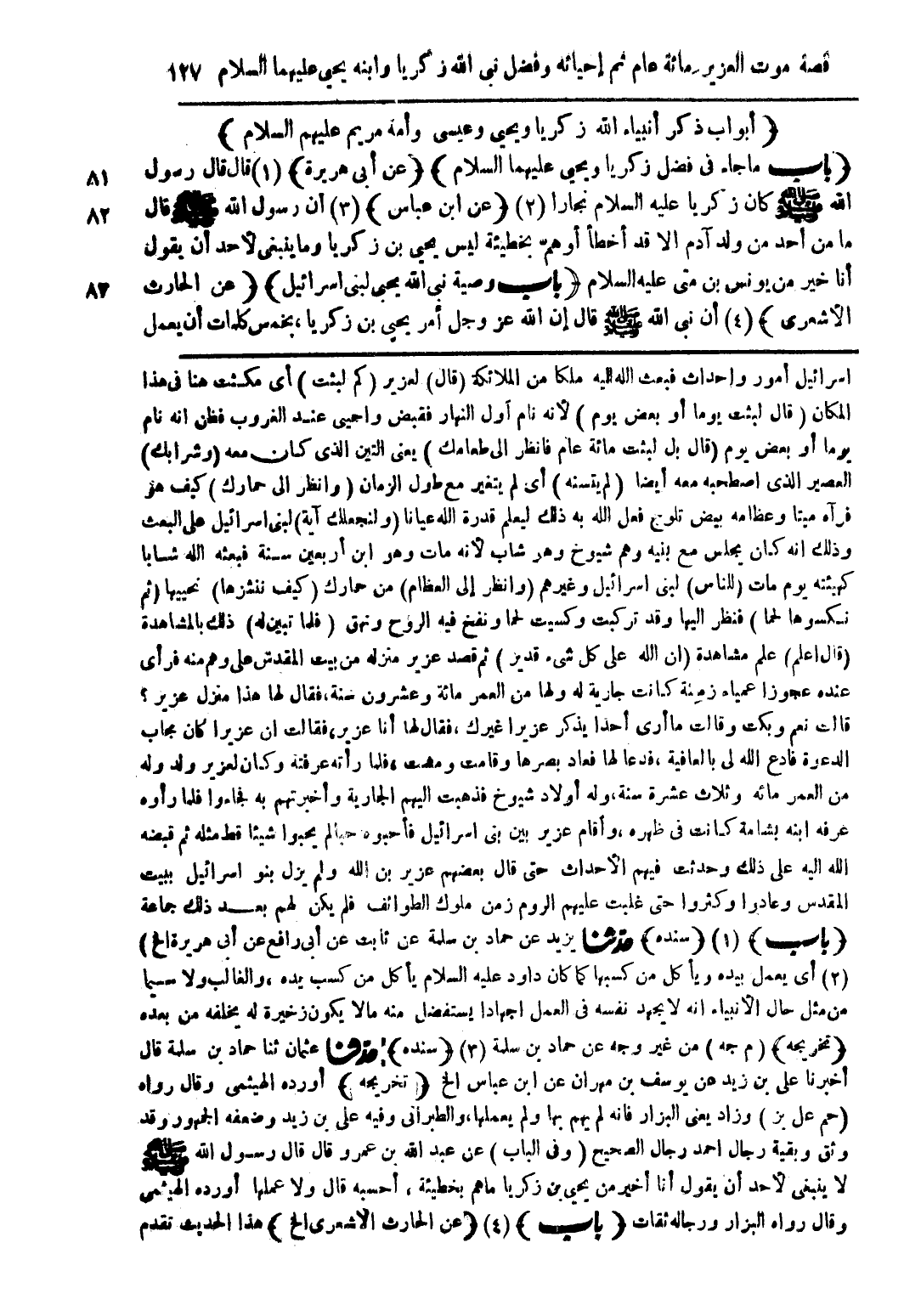 إسرائيل أمور وأحداث فبعث الله أليه ملكا من الملائكة (قال) لعزير (كم لبثت) أى مكثت هنا فى هذا المكان (قال لبثت يوما أو بعض يوم) لأنه نام أول النهار فقبض واحي عند الغروب فظن أنه نام يوما أو بعض يوم (قال بل لبثت مائة عام فانظر إلى طعامك) يعنى التين الذى كان معه (وشرابك) العصير الذى اصطحبه معه أيضا (لم يتسنه) أى لم يتغير مع طول الزمان (وانظر إلى حمارك) كيف هو فرآه ميتا وعظامه بيض تلوج فعل الله به ذلك ليعلم قدرة الله عيانا (ولنجعلك آية) لبنى اسرائيل على البعث وذلك انه كان يجلس مع بنيه وهم شيوخ وهو شاب لأنه مات أبن أرعين سنة فبعثه الله شابا كهيئته يوم مات (للناس) لبنى اسرائيل وغيرهم (وأنظر إلى العظام) من حمارك (كيف ننشزها) نحييها (ثم نكسوها لحما) فنظر اليها وقد تركبت وكسيت لحما ونفخ فيه من الروح ونهق (فلما تبين له) ذلك بالمشاهدة (قال اعلم) علم مشاهدة (ان الله على كل شئ قدير) ثم قصد عزير منزله من بيت المقدس على وهم منه فرأى عنده عجوزا عمياء زمِنة كانت جارية له ولها من العمر مائة وعشرون سنة، فقال لها هذا منزل عزير؟ قالت نعم وبكت وقالت ما أرى أحدا يذكر عزيرا غيرك، فقال لها أنا عزير، فقالت ان عزيرا كان مجاب الدعوة فادع الله لى بالعافية، فدعا لها فعاد بصرها وقامت ومشت، فلما رأته عرفته وكان لعزير ولد وله من العمر مائه وثلاث عشرة سنة، وله أولاد شيوخ فذهبت اليهم الجارية وأخبرتهم به فجاءوا فلما رأوه عرفه ابنه بشامة كانت فى ظهره، وأقام عزير بين بنى اسرائيل فأحبوه حبا لم يحبوا شيئا قط مثله ثم قبضه الله اليه على ذلك وحدثت فيهم الأحداث حتى قال بعضهم عزير بن الله ولم يزل بنو اسرائيل ببيت المقدس وعادوا وكثروا حتى غلبت عليهم الروم زمن ملوك الطوائف فلم يكن لهم بعد ذلك جماعة (باب) (1) (سنده) حدثنا يزيد عن حماد بن سلمة عن ثابت عن أبى رافع عن أبى هريرة الخ) (2) أى يعمل بيده ويأكل من كسبها كما كان داود عليه السلام يأكل من كسب يده، والغالب ولاسيما من مثل حال الأنبياء أنه لا يجهد نفسه فى العمل إجهادا يستفضل منه مالا يكون زخيرة له يخلفه من بعده (تخريجه) (م جه) من غير وجه عن حماد بن سلمة (3) (سنده) حدثنا عثمان ثنا حماد بن سلمة قال أخبرنا على بن زيد عن يوسف بن مهران عن أبن عباس الخ (تخريجه) أورده الهيثمى وقال رواه (حم عل بز) وزاد يعنى البزار فانه لم يهم بها ولم يعلمها، والطبرانى وفيه على بن زيد وضعفه الجمهور وقد وثق وبقية رجال أحمد رجال الصحيح (وفى الباب) عن عبد الله بن عمرو قال قال رسول الله صلى الله عليه وسلم لا ينبغى لأحد أن يقول أنا أخير من يحي بن زكريا ما هم بخطيئة، أحسبه قال ولا علمها أورده الهيثمى وقال رواه البزار ورجاله ثقات (باب) (4) (عن الحارث الأشعرى الخ) هذا الحديث تقدم