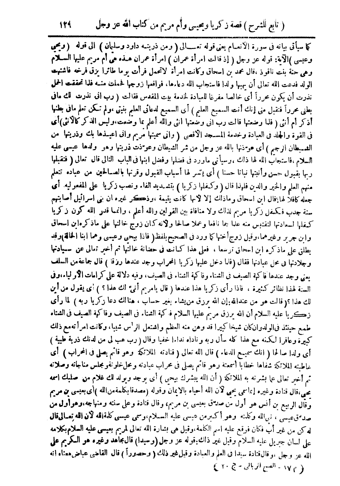 كما سيأتي بيانه فى سورة الأنعام يعنى قوله تعالى (ومن ذريته داود وسليمان) الى قوله (ويحي وعيسى) الآية: قوله عز وجل (إذ قالت امرأة عمران) امرأة عمران هذه هى أم مريم عليها السلام وهى حنة بنت ناقوذ، قال محمد بن اسحاق وكانت امرأة لا تحمل فرأت يوما طائرا يزق فرخه فاشتهت الولد فدعت الله تعالى أن يهبها ولدا فاستجاب الله دعاءها، فواقعها زوجها فحملت منه فلما تحققت الحمل نذرت أن يكون محرراً أى خالصا مفرغا للعبادة لخدمة بيت المقدس فقالت (رب أنى نذرت لك ما فى بطنى محرراً فتقبل منى إنك أنت السميع العليم) أى السميع لدعائى العليم بنيتى، ولم تكن تعلم ما فى بطنها أذكر أم أنثى (فلما وضعتها قالت رب انى وضعتها انثى والله أعلم بما وضعت، وليس الذكر كالأنثى) أى فى القوة والجلد فى العبادة وخدمة المسجد الأقصى (وانى سميتها مريم وانى أعيذها بك وذريتها من الشيطان الرجيم) أى عوَذتها بالله عز وجل من شر الشيطان وعوَذت ذريتها وهو ولدها عيسى عليه السلام، فاستجاب الله لها ذلك، وسيأتى ما ورد فى فضلها وفضل ابنها فى الباب التالى قال تعالى (فتقبلها ربها بقبول حسن وأنبتها نباتا حسنا) أى يسَر لها أسباب القبول وقرنها بالصالحين من عباده تتعلم منهم العلم والخير والدين فلهذا قال (وكفلها زكريا) بتشديد الفاء ونصب زكريا على المفعوليه أى جعله كافلا لها: قال ابن اسحاق وما ذلك إلا لأنها كانت يتيمة، وذكر غيره ان بنى اسرائيل أصابتهم سنة جدب فكفل زكريا مريم لذلك ولا منافاة بين القولين والله أعلم، وانما قدر الله كون زكريا كفلها لسعادتها لتقتبس منه علما جما نافعا وعملا صالحا ولأنه كان زوج خالتها على ما ذكره ابن اسحاق وابن جرير وغيرهما، وقيل زوج أختها كما ورد فى الصحيح بلفظ (فاذا بيحي وعيسى وهما ابنا الخالة) وقد يطلق على ما ذكره ابن اسحاق توسعا، فعلى هذا كانت فى حضانة خالتها ثم أخبر تعالى عن سيادتها وجلادتها فى محل عبادتها فقال (فلما دخل عليها زكريا المحراب وجد عندها رزقا) قال جماعة من السلف يعنى وجد عندها فاكهة الصيف فى الشتاء وفاكهة الشتاء فى الصيف، وفيه دلالة على كرامات الأولياء، وفى السنة لهذا نظائر كثيرة، فاذا رأى زكريا هذا عندها (قال يا مريم أنىَّ لك هذا؟) أى يقول من أين لك هذا؟ (قالت هو من عند الله: إن الله يرزق من يشاء بغير حساب، هنا لك دعا زكريا ربه) لما رأى زكريا عليه السلام أن الله يرزق مريم عليها السلام فاكهة الشتاء فى الصيف وفاكهة الصيف فى الشتاء طمع حينئذ فى الولد وان كان شيخا كبيرا قد وهن منه العظم واشتعل الرأس شيبا، وكانت امرأته مع ذلك كبيرة وعاقرا لكنه مع هذا كله سأل ربه وناداه نداءا خفيا وقال (رب هب لى من لدنك ذرية طيبة) أى ولدا صالحا (انك سميع الدعاء) قال الله تعالى (فنادته الملائكة وهو قائم يصلى فى المحراب) أى خاطبته الملائكة شفاها خطابا أسمعته وهو قائم يصلى فى محراب عبادته ومحل خلوتة ومجلس مناجاته وصلاته ثم أخبر تعالى عما بشرته به الملائكة (أن الله يبشرك بيحي) أى يوجد ويولد لك غلام من صلبك اسمه يحي، قال قتادة وغيره إنما سمى يحي لأن الله أحياه بالإيمان وقوله (مصدقا بكلمة من الله) أى بعيسى بن مريم وقال الربيع بن أنس هو أول من صدّق بعيسى بن مريم، وقال قتادة وعلى سنته ومناهجه، وهو أول من صدَق عيسى، بنى الله وكلمته وهو أكبر من عيسى عليه السلام، وسمى عيسى كلمة الله لأن الله تعالى قال له كن من غير أب فكان فوقع عليه اسم الكلمة، وقيل هى بشارة الله تعالى لمريم بعيسى عليه السلام بكلامه على لسان جبريل عليه السلام وقيل غير ذلك: قوله عز وجل (وسيدا) قال مجاهد وغيره هو الكريم على الله عز وجل، وقال قتادة سيدا فى العلم والعبادة وقيل غير ذلك (وحصوراً) قال القاضى عياض معناه أنه