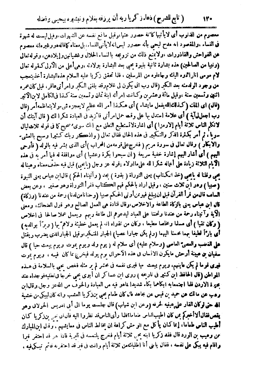 معصوم من الذنوب أى لا يأتيها كأنه حصور عنها، وقيل مانع نفسه عن الشهوات، وقيل ليست له شهوة فى النساء، والمقصود أنه مدح ليحي بأنه حصور ليس انه لا يأتى للنساء، بل معناه كما قاله هو وغيره انه معصوم عن الفواحش والقاذورات، ولا يمنع ذلك من تزويجه بالنساء الحلال وغشيانهن وإيلادهن، وقوله تعالى (ونبيا من الصالحين) هذه بشارة ثانية بنبوة يحي بعد البشارة بولادته، وهى أعلى من الأولى كقوله تعالى لام موسى أنا راّدوه أليك وجاعلوه من المرسلين، فلما تحقق زكريا عليه السلام هذه البشارة أخذ يتعجب من وجود الولد منه بعد الكبر (قال رب انى يكون لى غلام وقد بلغنى الكبر وامرأتى عاقر، قيل كان عمره اثنين وتسعين سنة، وقيل مائة وعشرين وكانت امرأته ابنة ثمان وتسعين سنة كذا فى الكامل لابن الأثير (قال) أى الملك (كذلك الله يفعل ما يشاء) أى هكذا أمر الله عظيم لا يعجزه شئ ولا يتعاظمه أمر (قال رب اجعل لى آية) أى علامة استدل بها على وقت حمل امرأتى فأزيد فى العبادة شكرا لك (قال آيتك أن لا تكلم الناس ثلاثة أيام إلا رمزا) أى اشارة لا تستطيع النطق مع انك سوئ صحيح كما فى قوله ثلاث ليال سويا، ثم أمر بكثرة الذكر والتكبير فى هذه الحال فقال تعالى (واذكر ربك كثيرا وسبح بالعشىّ والأبكار) وقال تعالى فى سورة مريم (فخرج على قومه من المحراب) أى الذى بشر فيه بالولد (فأوحى اليهم) أى أشار اليهم إشارة خفية سريعة (أن سبحوا بكرة وعشيا) أى موافقة له فيما أمر به فى هذه الأيام الثلاثة زيادة على أعماله شكرا لله على ما اولاه: قوله عز وجل (يا يحي) قيل فيه حذف معناه وهبنا له يحي وقلنا له يا يحي (خذ الكتاب) يعنى التوراة (بقوة) يجد (وآتيناه الحكم) قال ابن عباس يعنى النبوة (صبيا) وهو ابن ثلاث سنين، وقيل أراد بالحكم فهم الكتاب فقرأ التوراة وهو صغير، وعن بعض السلف قال من قرأ القرآن قبل أن يبلغ فهو ممن أوتى الحكم صبيا (وحنانا من لدنا) رحمة من عندنا (وزكاة) قال ابن عباس يعنى بالزكاة الطاعة والاخلاص، وقال قتادة هى العمل الصالح وهو قول الضحاك، ومعنى الآية وآتيناه رحمة من عندنا وتحتنا على العباد ليدعوهم الى طاعة ربهم ويعمل عملا صالحا فى اخلاص (وكان تقيا) أى مسلما ومخلصا مطيعا، وكان من تقواه أنه لم يعمل خطيئة ولا همّ بها (وبرّأ بوالديه) أى بارْاَ لطيفا بهما محسنا إليهما (ولم يكن جبارا عصيا) الجبار المتكبر، وقيل الجبار الذى يضرب ويقتل على الغضب والعصىّ العاصى (وسلام عليه) أى سلام له (يوم ولد ويوم يموت ويوم يبعث حيا) قال سفيان بن عيينة أوحش ما يكون الانسان فى هذه الأحوال يوم يولد فيخرج ما كان فيه، ويوم يموت فيرى قوما لم يكن عاينهم، ويوم يبعث حيا فيرى نفسه فى محشر لم ير مثله فخص يحي بالسلامة فى هذه المواطن (قال الحافظ ابن كثير فى تاريخه) روى ابن عساكر ان أبوى يحي خرجا فى تطلبه فوجداه عند بحيرة الأردن فلما اجتمعا به أبكاهما بكاء شديدا لما هو فيه من العبادة والخوف من الله عز وجل. وقال ابن وهب عن مالك عن حميد بن قيس عن مجاهد قال كان طعام يحي بن زكريا العشب وانه كان ليبكى من خشية الله حتى لو كان القار على عينيه لخرقه (وعن ابن شهاب) قال جلست يوما الى أبى إدريس الخولانى وهو يقص فقال ألا أخبركم بمن كان أطيب الناس طعاما؟ فلما رأى الناس قد نظروا اليه قال ان يحي بن زكريا كان أطيب الناس طعاما، إنما كان يأكل مع الوحش كراهة ان يخالط الناس فى معايشهم، وقال ابن المبارك عن وهيب بن الورد قال فقد زكريا ابنه يحي ثلاثة أيام فخرج يلتمسه فى البرية فاذا هو قد احتقر قبرا وأقام فيه يبكى على نفسه، فقال يا بنى أنا أطلبك من ثلاثة أيام وانت فى قبر قد احتفر به قائم تبكي فيه،