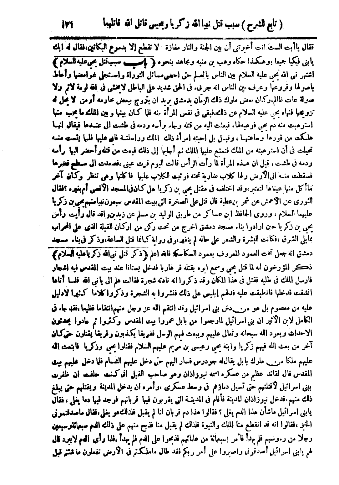 فقال يا أبت الست أنت أخبرتنى أن بين الجنة والنار مفازة لا تقطع إلا بدموع البكائين، فقال له ابك يا بنى فيكيا جميعا: وهكذا حكاه وهب بن منبه ومجاهد بنحوه (باب سبب قتل يحي عليه السلام) اشتهر نبى الله يحي عليه السلام بين الناس بالعلم حتى احصى مسائل التوراة واستجلى غوامضها وأحاط باصولها وفروعها وعرف بين الناس أنه جريء فى الحق شديد على الباطل لا يخشى فى الله لومة لائم ولا صولة عات ظالم، وكان بعض ملوك ذلك الزمان بدمشق يريد أن يتزوج ببعض محارمه أو من لا يحل له تزويجها فنهاه يحي عليه السلام عن ذلك، فبقى فى نفس المرآة منه فلما كان بينها وبين الملك ما يحب منها استو هبت منه دم يحي فوهبه لها، فبعثت اليه من قتله وجاء برأسه ودمه فى طشت إلى عندها فيقال إنها هلكت من فورها وساعتها، وقيل بل أحبته امرأة ذلك الملك وراسلته فأبى عليها فلما يئست منه تحيلت فى أن أستوهبته من الملك فتمنع عليها الملك ثم أجابها إلى ذلك فبعثت من قتله وأحضر اليها رأسه ودمه فى طشت، قيل ان هذه المرأة لما رأت الرأس قالت اليوم قرت عينى، فصعدت إلى سطح قصرها فسقطت منه الى الأرض ولما كلاب ضارية تحته فوثبت الكلاب عليها فأكلتها وهى تنظر وكان آخر مَا أكل منها عيناها لتعتبر، وقد اختلف فى مقتل يحي بن زكريا هل كان فى المسجد الأقصى أم بغيره؟ فقال الثورى عن الأعمش عن شمر بن عطية قال قتل على الصخرة التى ببيت المقدس سبعون نبيا منهم يحي بن زكريا عليهما السلام، وروى الحافظ ابن عساكر من طريق الوليد بن مسلم عن زيد بن واقد قال رأيت رأس يحي بن زكريا حين أرادوا بناء مسجد دمشق أخرج من تحت ركن من أركان القبلة الذى على المحراب مما يلى الشرق، فكانت البشرة والشعر على حاله لم يتغير، وفى رواية كأنما قتل الساعة، وذكر فى بناء مسجد دمشق أنه جعل تحت العمود المعروف بعمود السكاسكة فالله أعلم (ذكر قتل نبى الله زكريا عليه السلام) ذكر المؤرخون أنه لما قتل يحي وسمع أبوه بقتله فر هاربا فدخل بستانا عند بيت المقدس فيه أشجار فأرسل الملك فى طليه فقتل فى هذا المكان وقد ذكروا انه نادته شجرة فقالت هلم الى يا نبى الله فلما أتاها انشقت فدخلها فانطبقت عليه فدلهم إبليس على ذلك فنشروا به الشجرة وذكروا كلاما كثيرا لا دليل عليه من معصوم بل هو من دم بنى اسرائيل وقد انتقم الله عز وجل منهم انتقاما فظيعا، فقد جاء فى الكامل لابن الأثير ان بنى اسرائيل لما رجعوا من بابل عمروا بيت المقدس وكثروا ثم عادوا يحدثون الاحداث ويعود الله سبحانه وتعالى عليهم ويبعث فيهم الرسل ففريقا يكذبون وفريقا يقتلون حتى كان آخر من بعث الله فيهم زكريا وابنه يحي وعيسى بن مريم عليهم السلام فقتلوا يحي وزكريا فابتعث الله عليهم ملكا من ملوك بابل يقال له جودرس فسار اليهم حتى دخل عليهم الشام فلما دخل عليهم بيت المقدس قال لقائد عظيم من عسكره اسمه نبوزاذان وهو صاحب الفيل انى كنت حلفت ان ظفرت ببنى اسرائيل لأقتلهم حتى تسيل دماؤهم فى وسط عسكرى، وأمره أن يدخل المدينة ويقتلهم حتى يبلغ ذلك منهم، فدخل نبوزاذان المدينة فأقام فى المدينة التى يقربون فيها قربانهم فوجد فيها دما يغلى، فقال يا بنى اسرائيل ما شأن هذا الدم يغلى؟ فقالوا هذا دم قربان لنا لم يقبل فلذلك هو يغلى، فقال ما صدقتمونى الخبز، فقالوا انه قد انقطع منا الملك والنبوة فلذلك لم يقبل منا فذبح منهم على ذلك الدم سبعمائة وسبعين رجلا من رءوسهم فلم يهدأ فأمر بسبعمائة من علمائهم فذبحوا على الدم فلم يهدأ، فلما رأى الدم لا يبرد قال لهم يا بنى اسرائيل أصدقونى واصبروا على أمر ربكم فقد طال ما ملكتم فى الأرض تفعلون ما شئتم قبل