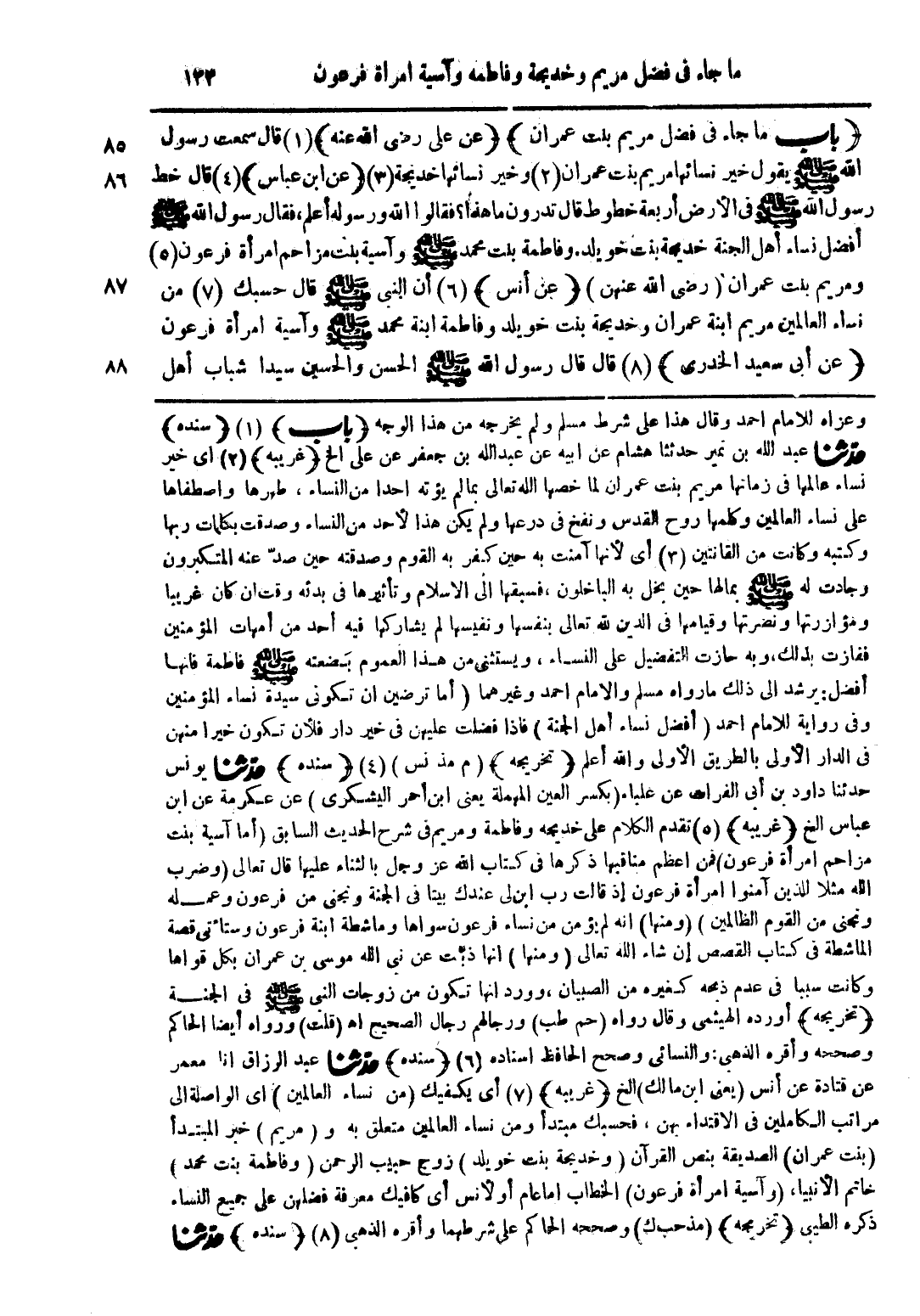 (باب ما جاء فى فضل مريم بنت عمران) (عن على رضى الله عنه) (1) قال سمعت رسول الله صلي الله عليه وسلم يقول خير نسائها مريم بنت عمران (2) وخير نسائها خديجة (3) (عن ابن عباس) (4) قال خط رسول الله صلي الله عليه وسلم فى الأرض أربعة خطوط قال تدرون ما هذا؟ فقالوا الله ورسوله أعلم، فقال رسول الله صلي الله عليه وسلم أفضل نساء أهل الجنة خديجة بنت خويلد، وفاطمة بنت محمد صلي الله عليه وسلم وآسية بنت مزاحم امرأة فرعون (5) ومريم بنت عمران (رضى الله عنهن) (عن أنس) (6) أن النبى صلي الله عليه وسلم قال حسبك (7) من نساء العالمين مريم أبنة عمران وخديجة بنت خويلد وفاطمة ابنة محمد صلي الله عليه وسلم وآسية امرأة فرعون (عن أبى سعيد الخدرى) (8) قال قال رسول الله صلي الله عليه وسلم الحسن والحسين سيدا شباب أهل.