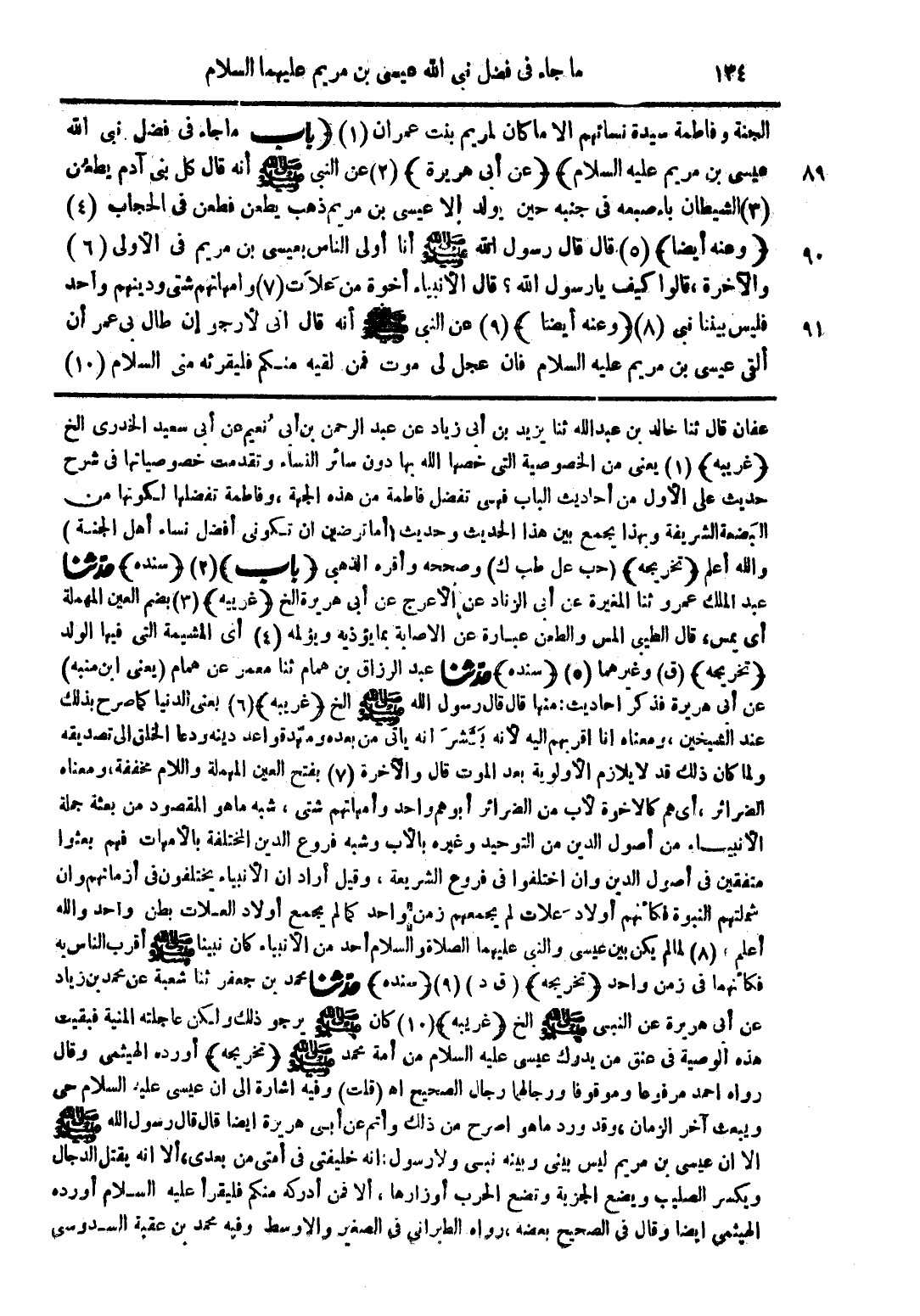 الجنة وفاطمة سيدة نسائهم الا ما كان لمريم بنت عمران (1) (باب ما جاء فى فضل نبى الله عيسى بن مريم عليه السلام) (عن أبى هريرة) (2) عن النبى صلي الله عليه وسلم أنه قال كل بنى آدم يطعُن (3) الشيطان بإصبعه فى جنبه حين يولد إلا عيسى بن مريم ذهب يطعن فطعن فى الحجاب (4) (وعنه أيضا) (5) قال قال رسول الله صلي الله عليه وسلم أنا أولى الناس بعيسى بن مريم فى الأولى (6) والآخرة، قالوا كيف يا رسول الله؟ قال الأنبياء أخوة من عَلاَت (7) وأمهاتهم شتى ودينهم واحد فليس بيننا نبى (8) (وعنه أيضا) (9) عن النبى صلي الله عليه وسلم أنه قال انى لأرجو إن طال بى عمر أن ألقى عيسى بن مريم عليه السلام فان عجل لى موت فمن لقيه منكم فليقرئه مني السلام (10).