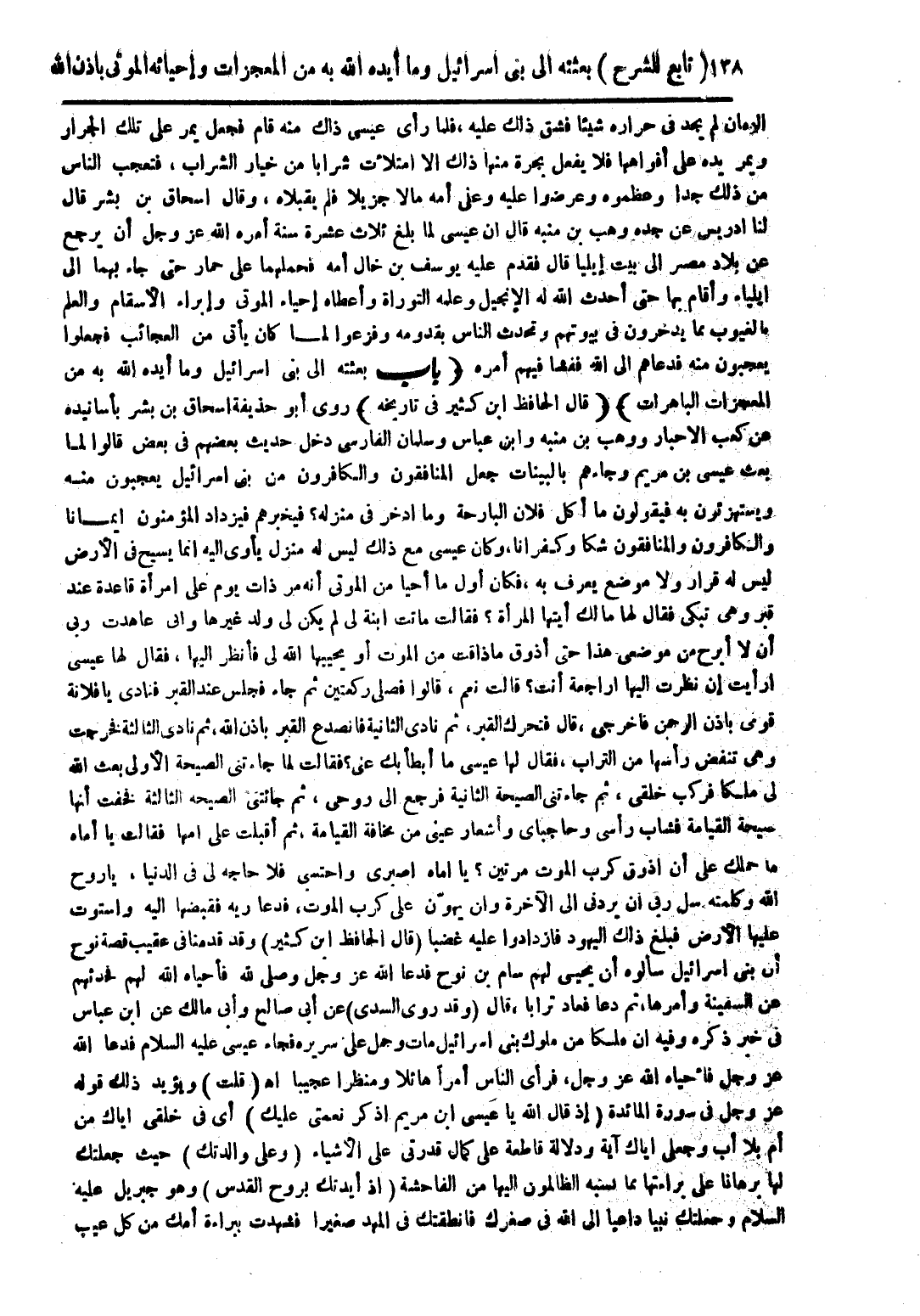 الزمان لم يجد فى حراره شيئا فشق ذلك عليه، فلما رأى عيسى ذلك منه قام فجعل يمر على تلك الجرار ويمر يده على أفواهها فلا يفعل بجرة منها ذلك الا امتلأت شرابا من خيار الشراب، فتعجب الناس من ذلك جدا وعظموه وعرضوا عليه وعلى أمه مالا جزيلا فلم يقبلاه، وقال اسحاق بن بشر قال لما إدريس عن جده وهب بن منبه قال ان عيسى لما بلغ ثلاث عشرة سنة أمره الله عز وجل أن يرجع عن بلاد مصر الى بيت إيليا قال فقدم عليه يوسف بن خال أمه فحملهما على حمار حتى جاء بهما الى إيلياء وأقام بها حتى أحدث الله له الإنجيل وعلمه التوراة وأعطاه إحياء الموتى وإبراء الأسقام والعلم بالغيوب مما يدخرون فى بيوتهم وتحدث الناس بقدومه وفزعوا لما كان يأتى من العجائب فجعلوا يعجبون منه فدعاهم الى الله ففشا فيهم أمره (باب بعثته الى بنى اسرائيل وما أيده الله به من المعجزات الباهرات) (قال الحافظ ابن كثير فى تاريخه) روى أبو حذيفة اسحاق بن بشر بأسانيده عن كعب الأحبار ووهب بن منبه وابن عباس وسلمان الفارسى دخل حديث بعضهم فى بعض قالوا لما بعث عيسى بن مريم وجاءهم بالبينات جعل المنافقون والكافرون من بنى اسرائيل يعجبون منه ويستهزئون به فيقولون ما أكل فلان البارحة وما أدخر فى منزله؟ فيخبرهم فيزداد المؤمنون أيمانا والكافرون والمنافقون شكا وكفرانا، وكان عيسى مع ذلك ليس له منزل يأوى أليه انما يسبح فى الأرض ليس له قرار ولا موضع يعرف به، فكان أول ما أحيا من الموى أنه مر ذات يوم على امرأة قاعدة عند قبر وهى تبكى فقال لما مالك أيتها المرأة؟ فقالت ماتت ابنة لى لم يكن لى ولد غيرهما وأنى عاهدت ربى أن لا أبرح من موضعى هذا حتى أذوق ما ذاقت من الموت أو يحييها الله لى فأنظر اليها، فقال لها عيسى ارأيت إن نظرت اليها أراجعة أنت؟ قالت نعم، قالوا فصلى ركعتين ثم جاء فجلس عند القبر فنادى يا فلانة قومى باذن الرحمن فاخرجى، قال فتحرك القبر، ثم نادى الثانية فانصدع القبر باذن الله، ثم نادى الثالثة فخرجت وهى تنفض رأسها من التراب، فقال لها عيسى ما أبطأ بك عنى؟ فقالت لما جاءتنى الصيحة الأولى بعث الله لى ملكا فركب خلقى، ثم جاءتنى الصيحة الثانية فرجع الى روحى، ثم جائتنى الصيحة الثالثة فجفت أنها صيحة القيامة فشاب رأسى وحاجباى وأشعار عينى من مخافة القيامة، ثم أقبلت على امها فقالت يا أماه ما حملك على أن أذوق كرب الموت مرتين؟ يا أماه اصبرى وأحتسبى فلا حاجة لى فى الدنيا، يا روح الله وكلمته سل ربى ان يردنى الى الآخرة وان يهوّن على كرب الموت، فدعا ربه فقبضها اليه واستوت عليها الأرض فبلغ ذلك اليهود فازدادوا عليه غضبا (قال الحافظ ابن كثير) وقد قدمنا فى عقيب قصة نوح أن بنى اسرائيل سألوه أن يحي لهم سام بن نوح فدعا الله عز وجل وصلى الله فأحياه الله لهم فحدثهم عن السفينة وأمرها، ثم دعا فعاد ترابا، قال (وقد روى السدى) عن أبى صالح وأبى مالك عن ابن عباس فى خبر ذكره وفيه أن ملكا من ملوك بنى اسرائيل مات وحمل على سريره فجاء عيسى عليه السلام فدعا الله عز وجل فأحياه الله عز وجل، فرأى الناس أمراً هائلا ومنظرا عجيبا اه (قلت) ويؤيد ذلك قوله عز وجل فى سورة المائدة (إذ قال الله يا عيسى ابن مريم أذكر نعمتى عليك) أى فى خلقى أياك من أم بلا أب وجعلى أياك آية ودلالة قاطعة على كمال قدرتى على الأشياء (وعلى والدتك) حيث جعلتك لها برهانا على براءتها مما نسبه الظالمون اليها من الفاحشة (اذ أيدنك بروح القدس) وهو جبريل عليه السلام وجعلتك نبيا داعيا الى الله فى صغرك فانطقتك فى المهد صغيرا فشهدت ببراءة أمك من كل عيب