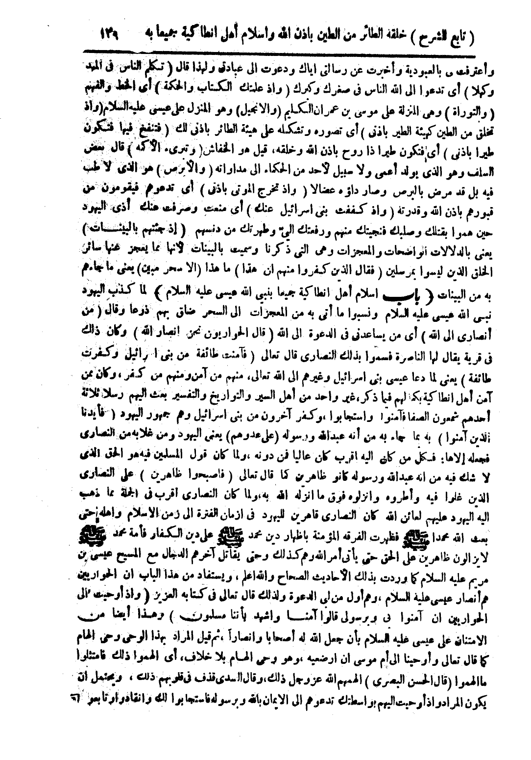 واعترفت لي بالعبودية وأخبرت عن رسالتى أياك ودعوت الى عبادتى ولهذا قال (تكلم الناس فى المهد وكهلا) أى تدعوا الى الله الناس فى صغرك وكبرك (وإذ علمتك الكتاب والحكمة) أى الخط والفهم (والتوراة) وهى المنزلة على موسى بن عمران الكليم (والانجيل) وهو المنزل على عيسى عليه السلام (وأذ تخلق من الطين كهيئة الطير باذنى) أى تصوره وتشكله على هيئة الطائر باذنى لك (فتنفخ فيها فتكون طيراً باذنى) أى فتكون طيرا ذا روح بأذن الله وخلقه، قيل هو الخفاش (وتبرئ الأكمه) قال بعض السلف وهو الذى يولد أعمى ولا سبيل لأحد من الحكماء الى مداواته (والأبرص) هو الذى لا طب فيه بل قد مرض بالبرص وصار داؤه عضالا (واذ تخرج الموتى باذنى) أى تدعوهم فيقومون من قبورهم بأذن الله وقدرته (واذ كففت بنى اسرائيل عنك) أى منعت وصرفت عنك أذى اليهود حين هموا بقتلك وصلبك فنجيتك منهم ورفعتك اليّ وطهرتك من دنسهم (إذ جئتهم بالبينات) يعنى بالدلالات الواضحات والمعجزات وهى التى ذكرنا وسميت بالبينات لأنها ما يعجز عنها سائر الخلق الذين ليسوا بمرسلين (فقال الذين كفروا منهم أن هذا) ما هذا (ألا سحر مبين) يعنى ما جاءهم به من البينات (باب أسلام أهل أنطاكية جميعا بنبي الله عيسى عليه السلام) لما كذب اليهود نبى الله عيسى عليه السلام ونسبوا ما أتى به من المعجزات الى السحر ضاق بهم ذرعا وقال (من أنصارى الى الله) أى من يساعدنى فى الدعوة الى الله (قال الحواريون نحن أنصار الله) وكان ذلك فى قرية يقال لها الناصرة فسموا بذلك النصارى قال تعالى (فآمنت طائفة من بنى اسرائيل وكفرت طائفة) يعنى لما دعا عيسى بنى اسرائيل وغيرهم الى الله تعالى، منهم من آمن ومنهم من كفر، وكان من آمن أهل أنطاكية بكما لهم فيما ذكر، غير واحد من أهل السير والتواريخ والتفسير بعث اليهم رسلا ثلاثة أحدهم شمعون الصفا فآمنوا واستجابوا، وكفر آخرون من بنى اسرائيل وهو جمهور اليهود (فأيدنا الذين آمنوا) به بما جاء به من أنه عبد الله ورسوله (على عدوهم) يعنى اليهود ومن غلابه من النصارى فجعله إلاها: فكل من كان اليه أقرب كان عاليا فمن دونه، ولما كان قول المسلمين فيه هو الحق الذى لا شك فيه من انه عبد الله ورسوله كانو ظاهرين كما قال تعالى (فاصبحوا ظاهرين) على النصارى الذين غلوا فيه وأطروه وأنزلوه فوق ما انزله الله به، ولما كان النصارى أقرب فى الجملة مما ذهب اليه اليهود عليهم لعائن الله كان النصارى قاهرين لليهود فى ازمان الفترة الى زمن الاسلام وأهله حتى بعث الله محمدا صلى الله عليه وسلم فظهرت الفرقة المؤمنة باظهار دين محمد صلى الله عليه وسلم على دين الكفار فأمة محمد صلى الله عليه وسلم لا يزالون ظاهرين على الحق حتى يأتى أمر الله وهم كذلك وحق يقاتل آخرهم الدجال مع المسيح عيسى بن مريم عليه السلام كما وردت بذلك الأحاديث الصحاح والله أعلم، ويستفاد من هذا الباب أن الحواريين هم أنصار عيسى عليه السلام، وهم أول من لبى الدعوة ولذلك قال تعالى فى كتابه العزيز (واذ أوحيت الى الحواريين أن آمنوا بى وبرسولى قالوا آمنا واشهد بأننا مسلمون) وهذا أيضا من الامتنان على عيسى عليه السلام بأن جعل الله له أصحابا وأنصاراَ، ثم قيل المراد بهذا الوحى وحى الهام كما قال تعالى وأوحينا الى أم موسى أن أرضعيه، وهو وحى الهام بلا خلاف، أى الهموا ذلك فامتثلوا ما ألهموا (قال الحسن البصرى) ألهمهم الله عز وجل ذلك، وقال السدى قذف فى قلوبهم ذلك، ويحتمل أن يكون المراد واذ أوحيت أليهم بواسطتك تدعوهم الى الأيمان بالله وبرسوله فاستجابوا لك وانقادوا وتابعوا