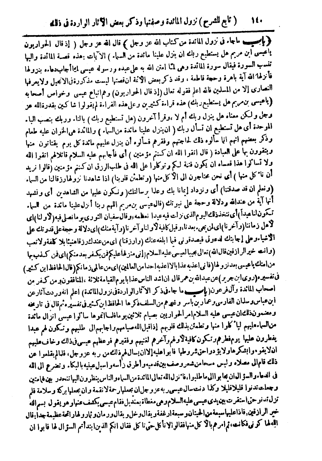 (باب ما جاء فى نزول المائدة من كتاب الله عز وجل) قال الله عز وجل (إذ قال الحواريون يا عيسى ابن مريم هل يستطيع ربك أن ينزل علينا مائدة من السماء) الآيات: هذه قصة المائدة وأليها تنسب السورة فيقال سورة المائدة وهى لمّا امتن الله به على عبده ورسوله عيسى لما أجاب دعاءه بنزولها فأنزلها الله آية باهرة وحجة قاطعة، وقد ذكر بعض الأئمة أن قصتها ليست مذكورة فى الانجيل ولا يعرفها النصارى إلا من المسلمين فالله أعلم فقوله تعالى (إذ قال الحواريون) وهم أتباع عيسى وخواص أصحابه (يا عيسى بن مريم هل يستطيع ربك) هذه قراءة كثيرين وعلى هذه القراءة لم يقولوا شاكين بقدرة الله عز وجل ولكن معناه هل ينزل ربك أم لا، وقرأ آخرون (هل تستطيع ربك) بالتاء وربك بنصب الباء الموحدة أى هل تستطيع أن تسأل ربك (أن ينزل علينا مائدة من السماء) والمائدة هى الخوان عليه طعام وذكر بعضهم أنهم أنما سألوه ذلك لحاجتهم وفقرهم فسألوه أن ينزل عليهم مائدة كل يوم يقتاتون منها ويتقوون بها على العبادة (قال اتقوا الله ان كنتم مؤمنين) أى فأجابهم عليه السلام قائلا لهم اتقوا الله ولا تسألوا هذا فعساه ان يكون فتنة لكم وتوكلوا على الله فى طلب الرزق أن كنتم مؤمنين (قالوا نريد أن نأكل منها) أى نحن محتاجون الى الأكل منها (وتطمئن قلوبنا) اذا شاهدنا نزولها رزقا لنا من السماء (ونعلم ان قد صدقتنا) أى ونزداد إيمانا بك وعلما برسالتك (ونكون عليها من الشاهدين أى ونشهد أنها آية من عند الله ودلالة وحجة على نبوتك (قال عيسى بن مريم اللهم ربنا أنزل علينا مائدة من السماء تكون لنا عبداً) أى نتخذ ذلك اليوم الذى نزلت فيه عبدا نعظمه، وقال سفيان الثورى يوما ما نصلى فيه (لأولنا) اى لأهل زماننا (وآخرنا) أى لمن يجئ بعدنا، وقيل كافة لأولنا وآخرنا (وآية منك) أى دلالة وحجة على قدرتك على الأشياء وعلى إجابتك لدعوتى فيصدقونى فيما ابلغه عنك (وأرزقنا) أى من عندك رزقا هنيئا بلا كلفة ولا تعب (وأنت خير الرازقين قال الله) تعالى مجيبا لعيسى عليه السلام (إنى منزلهما عليكم فمن يكفر بعد منكم) أى فمن كذب بها من أمتك يا عيسى بعد نزولها (فانى أعذبه عذابا بالا أعذبه أحدا من العالمين) أى من عالمى زمانكم (قال الحافظ ابن كثير) فى تفسيره (روى ابن جرير) عن عبد الله بن عمر قال أن أشد الناس عذابا يوم القيامة ثلاثة، المنافقون ومن كفر من أصحاب المائدة وآل فرعون (باب ما جاء فى ذكر الآثار الواردة فى نزول المائدة) أعلم أنه وردت آثار عن أبن عباس وسلمان الفارسى وعمار بن ياسر وغيرهم من السلف ذكرها الحافظ ابن كثير فى تفسيره ثم قال فى تاريخه ومضمون ذلك أن عيسى عليه السلام أمر الحواريين بصيام ثلاثين يوما فلما أتموها سألوا عيسى أنزال مائدة من السماء عليهم ليأكلوا منها وتطمئن بذلك قلوبهم إذا قبل الله صيامهم وأجابهم الى طلبهم وتكون لهم عبادا يفطرون عليها يوم فطرهم وتكون كافية لأولهم وآخرهم لغنيهم وفقيرهم فوعظهم عيسى فى ذلك وخاف عليهم أن لا يقوه وابشكرها ولا يؤدوا حتى شروطها فأبوا عليه إلا ان يسال لهم ذلك من ربه عز وجل، فلما لم يقلعوا عن ذلك قام الى مصلاه ولبس مسحا من شعر وصف بين قدميه وأطرق رأسه وأسبل عينيه بالبكاء وتضرع إلى الله فى الدعاء والسؤال أن يجابوا الى ما طلبوا، فأنزل الله تعالى المائدة من السماء والناس ينظرون اليها تنحدر بين غمامتين وجعلت تدنوا قليلا قليلا وكلما دنت سأل عيسى ربه عز وجل أن يجعلها رحمة لا نقمة وأن يجعلها بركة وسلامة فلم تزل تدنو حتى أستقرت بين يدى عيسى عليه السلام وهى مغطاة بمنديل فقام عيسى يكشف عنها وهو يقول بسم الله خير الرازقين، فاذا عليها سبعة من الحيتان وسبعة أرغفة ويقال وخل ويقال ورمان وثمار ولها رائحة عظيمة جدا: قال الله لها كونى فكانت، ثم أمرهم بالآكل منها فقالوا الا نأكل حتى تأكل فقال أنكم الذين ابتدأتم السؤال لها فأبوا أن