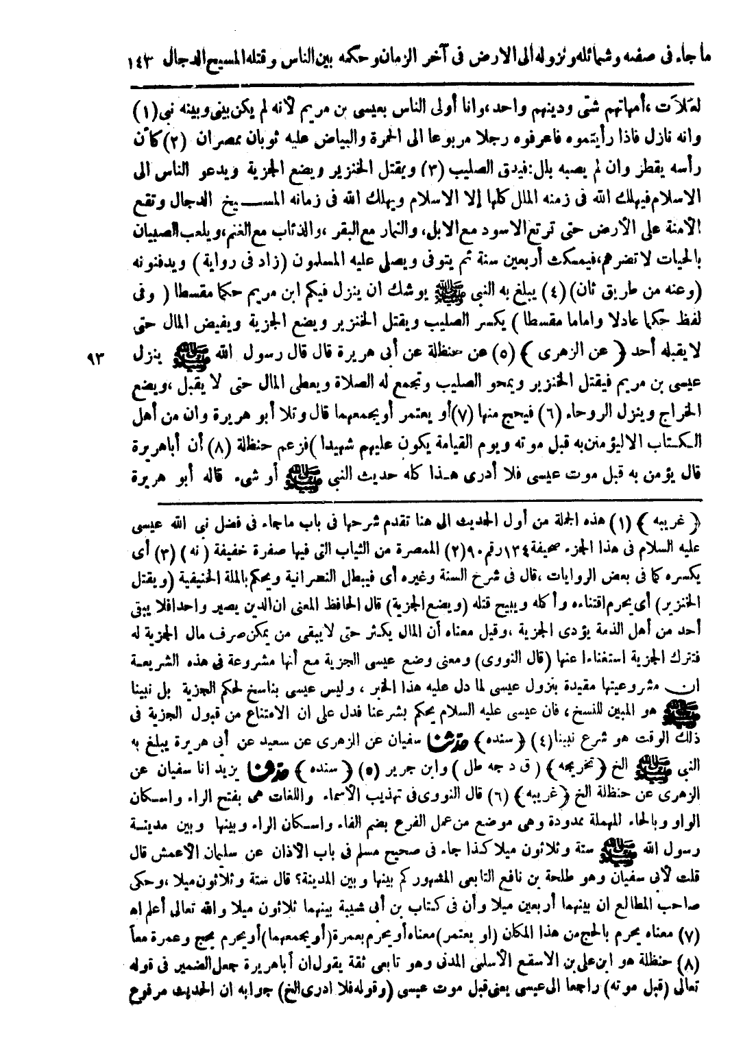 (غريبه) (1) هذه الجملة من أول الحديث إلى هنا تقدم شرحها فى باب ما جاء فى فضل نبى الله عيسى عليه السلام فى هذا الجزء صحيفة 134 رقم 90 (2) الممصرة من الثياب التى فيها صفرة خفيفة (نه) (3) أى يكسره كما فى بعض الروايات، قال فى شرح السنة وغيره أى فيبطل النصرانية ويحكم بالملة الحنيفية (ويقتل الخنزير) أى يحرم اقتناءه وأكله ويبيح قتله (ويضع الجزية) قال الحافظ المعنى أن الدين يصير واحدا فلا يبقى أحد من أهل الذمة يؤدى الجزية، وقيل معناه أن المال يكثر حتى لا يبقى من يمكن صرف مال الجزية له فتترك الجزية استغناءا عنها (قال النووى) ومعنى وضع عيسى الجزية مع أنها مشروعة فى هذه الشريعة أن مشروعيتها مقيدة بنزول عيسى لما دل عليه هذا الخبر، وليس عيسى بناسخ لحكم الجزية بل نبينا صلى الله عليه وسلم هو المبين للنسخ، فأن عيسى عليه السلام يحكم بشرعنا فدل على أن الامتناع عن قبول الجزية فى ذلك الوقت هو شرع نبينا (4) (سنده) حدثنا سفيان عن الزهرى عن سعيد عن أبى هريرة يبلغ به النبى صلى الله عليه وسلم الخ (تخريجه) (ق د جه طل) وأبن جرير (5) (سنده) حدثنا يزيد أنا سفيان عن الزهرى عن حنظلة الخ (غريبه) (6) قال النووى فى تهذيب الأسماء واللغات هى بفتح الراء وإسكان الواو وبالحاء المهملة ممدودة وهى موضع من عمل الفرع بضم الفاء وإسكان الراء وبينها وبين مدينة رسول الله صلى الله عليه وسلم سنة وثلاثون ميلا كذا جاء فى صحيح مسلم فى باب الأذان عن سليمان الأعمش قال قلت لأبى سفيان وهو طلحة بن نافع التابعى المشهور كم بينها وبين المدينة؟ قال ستة وثلاثون ميلا، وحكى صاحب المطالع أن بينهما أربعين ميلا وأن فى كتاب بن أبى شيبة بينهما ثلاثون ميلا والله تعالى أعلم اه (7) معناه يحرم بالحج من هذا المكان (أو يعتمر) معناه أو يحرم بعمرة (أو يجمعهما) أو يحرم بحج وعمرة معاً (8) حنظلة هو أبن على بن الاسقع الأسلمى المدنى وهو تابعى ثقة يقول ان أبا هريرة جعل الضمير فى قوله تعالى (قبل موته) راجعا الى عيسى يعنى قبل موت عيسى (وقوله فلا أدرى الخ) جوابه أن الحديث مرفوع