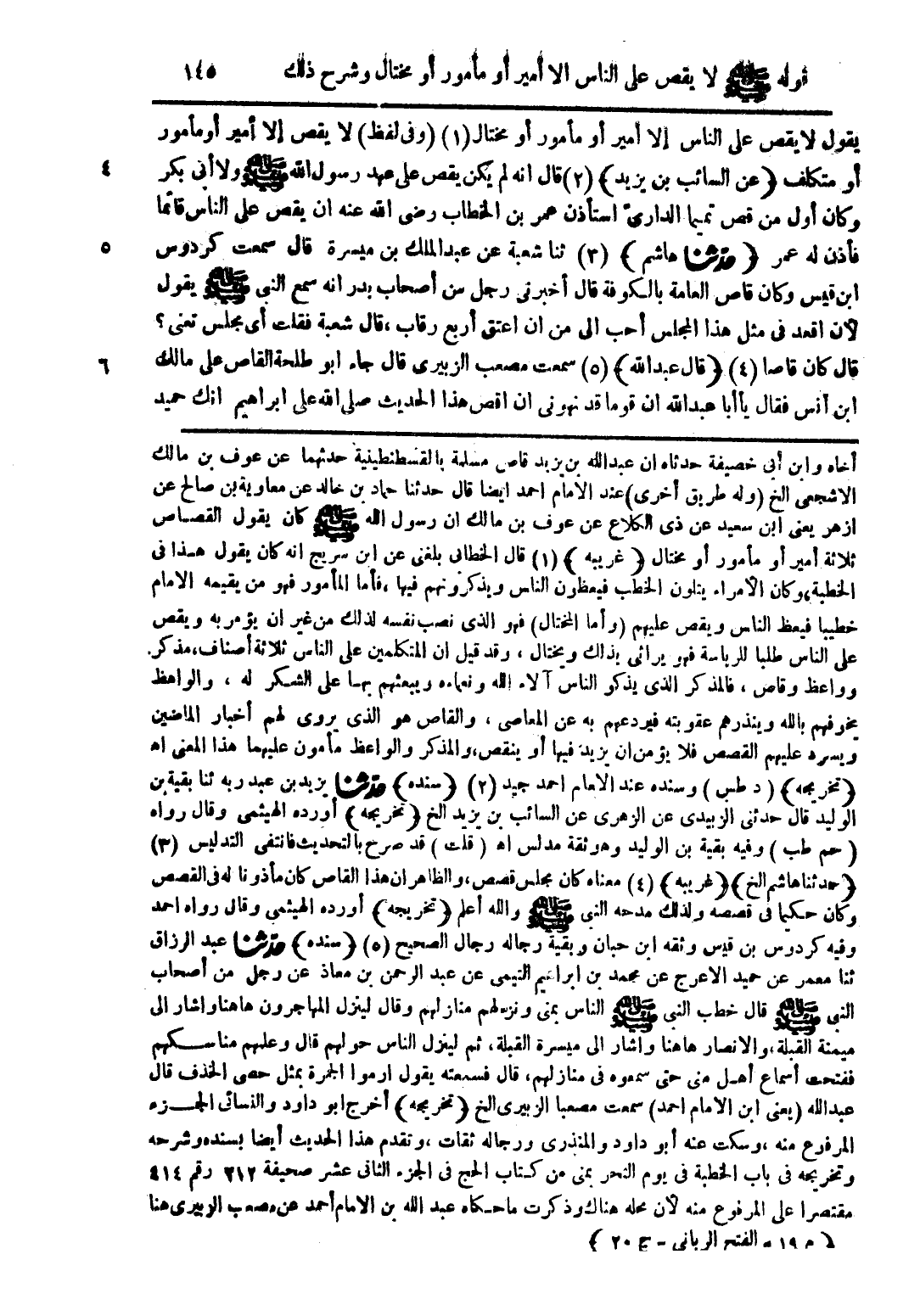 أخاه وابن أبي خصيفة حدثاه أن عبد الله بن يزيد قاص مسلمة بالقسطنطينية حدثهما عن عوف بن مالك الأشجعى الخ (وله طريق أخرى) عند الامام أحمد أيضا قال حدثنا حماد بن خالد عن معاوية بن صالح عن ازهر يعنى أبن سعيد عن ذى الكلاع عن عوف بن مالك أن رسول الله صلى الله عليه وسلم كان يقول القصاص ثلاثة أمير أو مأمور أو مختال (غريبه) (1) قال الخطابى بلغنى عن ابن سريج أنه كان يقول هذا فى الخطبة، وكان الأمراء يتلون الخطب فيعظون الناس ويذكرونهم فيها، فأما المأمور فهو من يقيمه الامام خطيبا فيعظ الناس ويقص عليهم (وأما المختال) فهو الذى نصب نفسه لذلك من غي أن يؤمر به ويقص على الناس طلبا للرياسة فهو يراثى بذلك ويختال، وقد قيل أن المتكلمين على الناس ثلاثة أصناف، مذكر وواعظ وقاص، فالمذكر الذى يذكر الناس آلاء الله ونعماءه ويبعثهم بها على الشكر له، والواعظ يخوفهم بالله وينذرهم عقوبته فيردعهم به عن المعاصى، والقاص هو الذى يروى لهم أخبار الماضين ويسرد عليهم القصص فلا يؤمن أن يزيد فيها أو ينقص، والمذكر والواعظ مأمون عليهما هذا المعنى اه (تخريجه) (د طس) وسنده عند الامام أحمد جيد (2) (سنده) حدثنا يزيد بن عبد ربه ثنا بقية بن الوليد قال حدثنى الزبيدى عن الزهرى عن السائب بن يزيد الخ (تخريجه) أورده الهيثمى وقال رواه (حم طب) وفيه بقية بن الوليد وهو ثقة مدلس اه (قلت) قد صرح بالتحديث فانتفى التدليس (3) (حدثنا هاشم الخ) (غريبه) (4) معناه كان مجلس قصص، والظاهران هذا القاص كان مأذونا له فى القصص وكان حكيما فى قصصه ولذلك مدحه النبى صلى الله عليه وسلم والله أعلم (تخريجه) أورده الهيثمى وقال رواه أحمد وفيه كردوس بن قيس وثقه أبن حبان وبقية رجاله رجال الصحيح (5) (سنده) حدثنا عبد الرزاق ثنا معمر عن حميد الاعرج عن محمد بن ابراهيم النيمى عن عبد الرحمن بن معاذ عن رجل من أصحاب النبى صلى الله عليه وسلم قال خطب النبى صلى الله عليه وسلم الناس بمنى ونزّلهم منازلهم وقال لينزل المهاجرون هاهنا وأشار الى ميمنة القبلة، والانصار هاهنا وأشار الى ميسرة القبلة، ثم لينزل الناس حولهم قال وعلمهم مناسكهم ففتحت أسماع أهل منى حتى سمعوه فى منازلهم، قال فسمعته يقول أرموا الحمرة بمثل حصى الخذف قال عبد الله (يعنى أبن الأمام أحمد) سمعت مصعبا الزبيرى الخ (تخريجه) أخرج أبو داود والنسائى الجزء المرفوع منه، وسكت عنه أبو داود والمنذرى ورجاله ثقات، وتقدم هذا الحديث أيضا بسنده وشرحه وتخريجه فى باب الخطبة فى يوم النحر بمنى من كتاب الحج فى الجزء الثانى عشر صحيفة 212 رقم 414 مقتصرا على المرفوع منه لأن محله هناك وذكرت ما حكاه عبد الله بن الامام أحمد عن مصعب الزبيري هنا