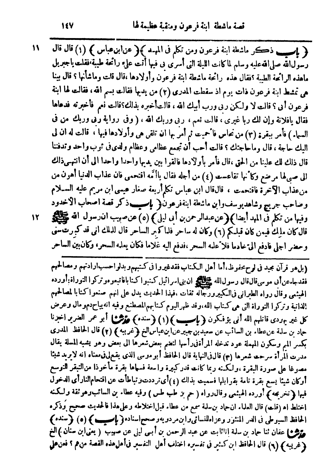 (باب ذكر ماشطة ابنة فرعون ومن تكلم فى المهد) (عن ابن عباس) (1) قال قال رسول الله صلى الله عليه وسلم لما كانت الليلة التى أسرى بى فيها أتت علىّ رائحة طيبة، فقلت يا جبريل ما هذه الرائحة الطيبة؟ فقال هذه رائحة ماشطة أبنة فرعون وأولادها، قال قلت وما شأنها؟ قال بينا هى تمشط ابنة فرعون ذات يوم اذ سقطت المدرى (2) من يديها فقالت بسم الله، فقالت لها أبنة فرعون أبى؟ قالت لا ولكن ربى ورب أبيك الله، قالت أخبره بذلك؟ قالت نعم فأخبرته فدعاها فقال يا فلانة وإن لك ربا غيرى، قالت نعم، ربى وربك الله، (وفى رواية ربى وربك من فى السماء) فأمر ببقرة (3) من نحاس فأحميت ثم أمر بها أن تلقى هى وأولادها فيها، قالت له أن لى اليك حاجة، قال وما حاجتك؟ قالت أحب أن تجمع عظامى وعظام ولدى فى ثوب واحد وتدفننا قال ذلك لك علينا من الحق، قال فأمر بأولادها فالقوا بين يديها واحداً واحداً إلى أن انتهى ذلك إلى صبى لها مرضع وكأنها تقاعست (4) من أجله فقال يا أمَّه اقتحمى فان عذاب الدنيا أهون من من عذاب الآخرة فاقتحمت، قال قال أبن عباس تكلم أربعة صغار عيسى أبن مريم عليه السلام وصاحب جريج وشاهد يوسف وأبن ماشطة ابنة فرعون (باب ذكر قصة أصحاب الأخدود وفيها من تكلم فى المهد أيضاً) (عن عبد الرحمن بن أبى ليلى) (5) عن صهيب أن رسول الله صلي الله عليه وسلم قال كان ملِك فيمن كان قبلكم (6) وكان له ساحر فلما كبِر الساحر قال للملك أنى قد كبِرت سنى وحضر أجلى فادفع الىّ خادما فلأعلمه السحر، فدفع اليه غلاما فكان يعلمه السحر، وكان بين الساحر