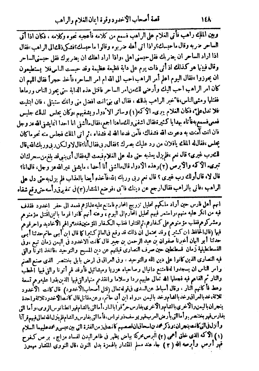 وبين الملِك راهب فأتى الغلام على الراهب فسمع من كلامه فأعجبه نحوه وكلامه، فكان أذا أتى الساحر ضربه وقال ما حبسك؟ واذا أتى أهله ضربوه وقالوا ما حبسك؟ فشكى ذلك الى الراهب، فقال أذا أراد الساحر أن يضربك فقل حبسنى أهلى، وأذا أراد أهلك أن يضربوك فقل حبسنى الساحر وقال فبينما هو كذلك اذ أتى ذات يوم على دابة فظيعة عظيمة وقد حبست الناس فلا يستطيعون أن يجوزوا، فقال اليوم أعلم أمر الراهب أحب الى الله أم أمر الساحر، فأخذ حجراً فقال اللهم أن كان أمر الراهب أحب أليك وأرضى لك من أمر الساحر فاقتل هذه الدابة حتى يجوز الناس ورماها فقتلها ومشى الناس، فأخبر الراهب بذلك، فقال أى نبى أنت أفضل منى وأنك ستبتلى، فان ابتليت فلا تدل علىّ، فكان الغلام يبرئ الأكمة (1) وسائر الأدواء ويشفيهم، وكان يجلس للملك جليس فعمى فسمع به فأتاه بهدايا كثيرة فقال أشفنى ولك ما هنا أجمع، فقال ما أشفى أنا أحدا إنما يشفى الله عز وجل فان أنت آمنت به دعوت الله فشفاك، فآمن فدعا الله له فشفاه، ثم أتى الملك فجلس منه نحو ما كان يجلس، فقال له الملك يا فلان من رد عليك بصرك؟ فقال ربى فقال أنا؟ قال لا ولكن ربى وربك الله، قال لك رب غيرى؟ قال نعم، فلم يزل يعذبه حتى دله على الغلام فبعث اليه فقال أى بنى قد بلغ من سحرك أن تبرئ الأكمة والأبرص (2) وهذه الأدواء قال ما أشفى أنا أحدا، ما يشفى غير الله عز وجل، قال أنا؟ قال لا، قال أولك رب غيرى؟ قال نعم ربى وربك الله، فآخذه أيضا بالعذاب فلم يزل به حتى دل على الراهب، فأنى بالراهب فقال ارجع عن دينك فأبى، فوضع المنشار (3) فى مَفِرق رأسه حتى وقع شقاه