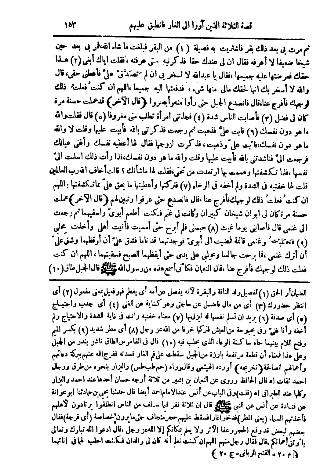 الضمان أو الحق (1) الفصيل ولد الناقة والبقرة لأنه يفصل عن أمه أي يفطم فهو فعيل بمعنى مفعول (2) أي انتظر حضورك (3) أي من مال فاضل عن حاجتي وهو كناية عن الغنى (4) أي جدب واحتياج (5) أي صدقة (6) يريد أن تسلم نفسها له ليزني بها (7) معناه خفتيه وأنت في غاية الشدة والاحتياج ولم أخفه وأنا غنى وفي بحبوحه من العيش فتركها خوفًا من الله عز وجل (8) أي مطر شديد (9) بكسر الميم وفتح اللام بينهما حاه ساكنة الوعاء الذي يحلب فيه (10) قال في القاموس الطاق ناشز يندر من الحبل وعلى هذا فمعناه أن قطعة مرتفعة بارزة من الجبل سقطت على فم الغار فسدته ففرج الله عنه ببركة دعائهم وأعمالهم الصالحة (تخريجه) أورده الهيثمي وقال رواه (حم طب طس) رالبزار بنحوه من طرق ورجال أحمد ثقات أه قال الحافظ وروى عن النعمان بن بشير من ثلاثة أوجه حسان أحدها عند أحمد والبزار وكلها عند الطبراني أه (قلت) وفي الباب عن أنس عند الإمام أحمد أيضًا قال حدثنا يحيى بن حادثنا أبو عوانة عن قتادة عن أنس عن النبي صلى الله عليه وسلم قال أن ثلاثة نفر فيما سلف من الناس انطلقوا يرتادون لأهلهم فأخذتهم السماء (يعني المطر) فدخلوا غارا فسقط عليهم حجر متجاف حتى ما يرون خصاصة (أي فرجة) فقال بعضهم لبعض قد وقع الحجر وعفا الأثر ولا يعلم بمكانكم إلا الله عز وجل، قال ادعوا الله تبارك وتعالى بأوثق أعمالكم، فقال رجل منهم اللهم أن كنت تعلم أنه كان لي والدان فكنت أحلب لهما في إنائهما