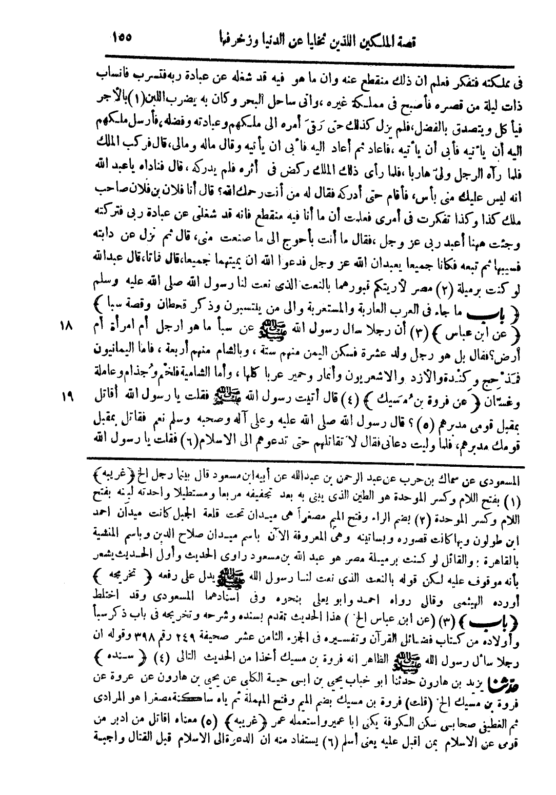 في مملكته فتفكر فعلم إن ذلك منقطع عنه وأن ما هو فيه قد شغله عن عبادة ربه فتسرب فانساب ذات ليلة من قصره فأصبح في مملكة غيره، وأتى ساحل البحر وكان به يضرب اللبن (1) بالأجر فيأكل ويتصدق بالفضل، فلم يزل كذلك حتى رقى أمره إلى ملكهم وعبادته وفضله، فأرسل ملكهم إليه أن يأتيه فأبى أن يأتيه، فأعاد ثم أعاد إليه فأبى أن يأتيه وقال ماله ومالي، قال فركب الملك فلما رآه الرجل ولى هاربًا، فلما رأى ذلك الملك ركض في أثره فلم يدركه، قال فناداه يا عبد الله أنه ليس عليك مني بأس، فأقام حتى أدركه فقال له من أنت رحمك الله؟ قال أن فلان بن فلان صاحب ملك كذا وكذا تفكرت في أمري فعلمت أن ما أنا فيه منقطع فأنه قد شغلني عن عبادة ربي فتركته وجئت ههنا أعبد ربي عز وجل، فقال ما أنت بأحوج إلي ما صنعت مني، قال ثم نزل عن دابته فسيبها ثم تبعه فكانا جميعًا يعبدان الله عز وجل فدعوا الله أن يميتهما جميعا، قال فماتا، قال عبد الله لو كنت برميلة (2) مصر لأريتكم قبورهما بالنعت الذي نعت لنا رسول الله صلى الله عليه وسلم (باب ما جاء في العرب العاربة والمستعربة وإلى من يتسبون وذكر قحطان وقصة سبا) (عن عباس) (3) أن رجلا سال رسول الله صلى الله عليه وسلم عن سبأ ما هو أرجل أم امرأة أم أرض؟ فقال بل هو رجل ولد عشرة فسكن اليمن منهم ستة، وبالشام منهم أربعة، فأما اليمانيون فمذحج وكندة والأزد والأشعريون وأنمار وحمير عربا كلها، وأما الشامية فلخم وجدام وعمالة وغسان (عن فروة بن مسيك) (4) قال أتيت رسول الله صلى الله عليه وسلم فقلت يا رسول الله أقاتل بمقبل قومي مدبرهم (5)؟ قال رسول الله صلى الله عليه وسلم وعلى آله وصحبه أجمعين وصحبه وسلم نعم فقاتل بمقبل قومك مدبرهم، فلما وليت دعاني فقال لا تقاتلهم حتى تدعوهم إلى الإسلام (6) فقلت يا رسول الله