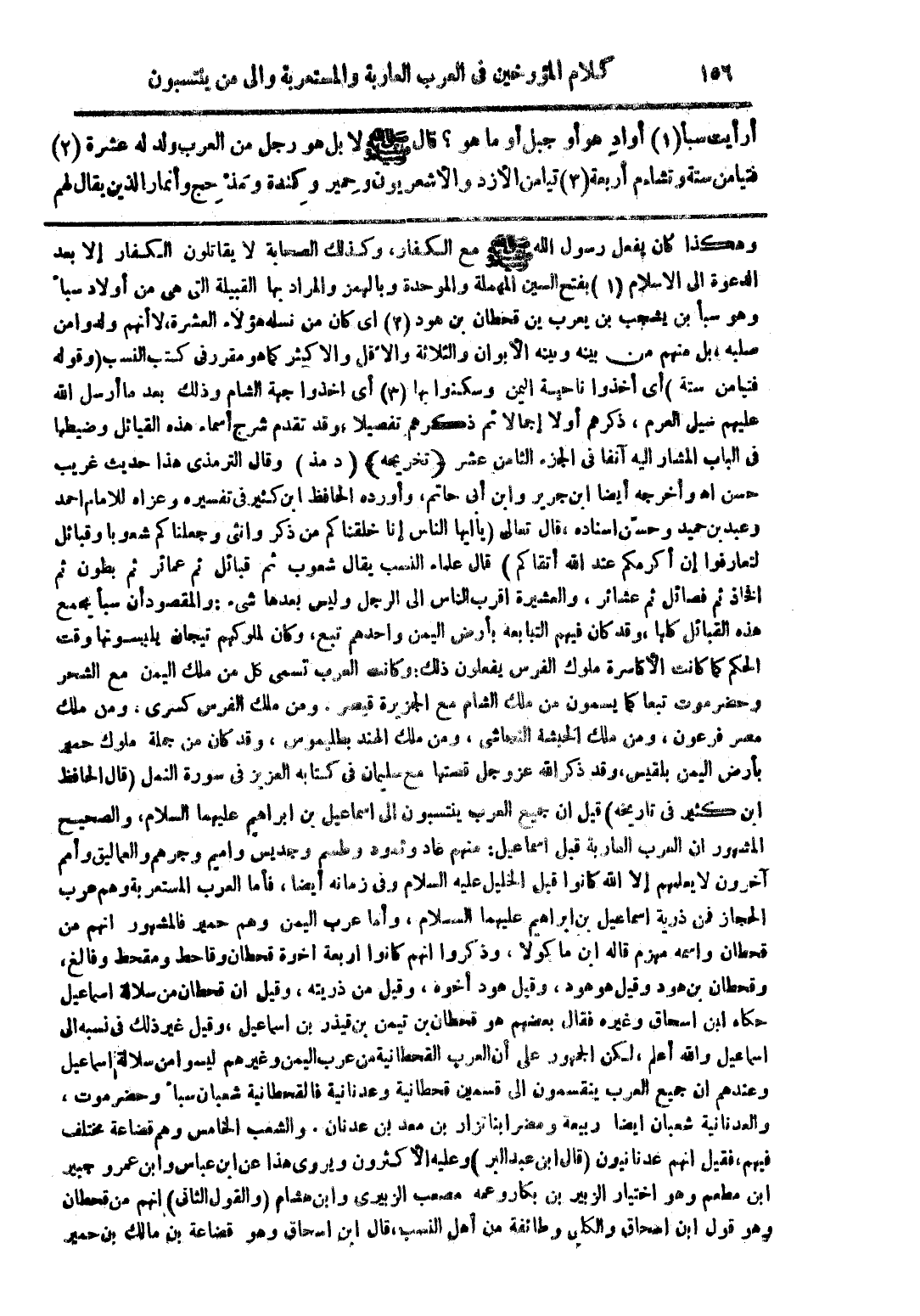 وهكذا كان يفعل رسول الله صلى الله عليه وسلم مع الكفار، وكذلك الصحابة لا يقاتلون الكفار إلا بعد الدعوة إلى الإسلام (1) بفتح السين المهملة والموحدة وبالهمز والمراد بها القبيلة التي هي من أولاد سبأ وهو سبأ بن يشجب بن يعرب بن قحطان بن هود. (2) أي كان من نسله هؤلاء العشرة، لأنهم ولدوا من صلبه، بل منهم من بينه وبينه الأبوين والثلاثة والأقل والأكثر هو مقرر في كتب النسب (وقوله فتيامن ستة) أي أخذوا ناحية اليمن وسكنوا بها. (3) أي أخذوا جهة الشام وذلك بعد ما أرسل الله عليهم سيل العرم، ذكر أولًا إجمالا ثم ذكرهم تفصيلا، وقد تقدم شرج أسماء هذه القبائل وضبطها في الباب المشار إليه آنفًا في الجزء الثامن عشر (تخريجه) (د مذ) وقال الترمذي هذا حديث غريب حسن أهـ وأخرجه أيضًا ابن جرير وابن أبي حاتم، وأورده الحافظ ابن كثير في تفسيره وعزاه للأمام أحمد وعبد بن حميد وحسن إسناد، قال تعالى (يا أيها الناس إنا خلقناكم من ذكر وأنثى وجعلناكم شعوبًا وقبائل لتعارفوا إن أكرمكم عند الله أتقاكم) قال علماء النسب يقال شعوب ثم قبائل ثم عمائر ثم بطون ثم أفخاذ ثم فصائل ثم عشائر، والعشيرة أقرب الناس إلى الرجل وليس بعدها شيء: والمقصود أن سبأ يجمع هذه القبائل كلها، وقد كان فيهم التبابعة بأرض اليمن وأحدهم تبع، وكان لملوكهم تيجان يلبسونها وقت الحكم كما كانت الأكاسرة ملوك الفرس يفعلون ذلك: وكانت العرب تسمى كل من ملك اليمن مع الشحر وحضر موت تبعًا كما يسمون من ملك الشام مع الجزيرة قيصر. ومن ملك الفرس كسرى، ومن ملك مصر فرعون، ومن ملك الحبشة النجاشي، ومن ملك الهند بطليموس، وقد كان من جملة ملوك حمير بأرض اليمن بلقيس، وقد ذكر الله عز وجل قصتها مع سليمان في كتابه العزيز في سورة النمل (قال الحافظ ابن كثير في تاريخه) قيل أن جميع العرب ينتسبون إلى إسماعيل بن إبراهيم عليهما السلام، والصحيح المشهور أن العرب العاربة قبل إسماعيل: منهم عاد وثمود وطسم وجديس واميم وجرهم والعماليق وأمم آخرون لا يعلهم إلا الله كانوا قبل الخليل عليه السلام وفي زمانه أيضًا، فأما العرب المستعربة وهم عرب الحجاز فمن ذرية إسماعيل بن إبراهيم عليهما السلام، وأما عرب اليمن وهم حمير فالمشهور أنهم من قحطان واسمه مهزم قاله ابن ماكولا، وذكروا أنهم كانوا أربعة أخوة قحطان وقاحط ومقحط وفالغ، وقحطان بن هود وقيل هو هود، وقيل هود أخوة، وقيل من ذريته، وقيل أن قحطان من سلالة إسماعيل حكاه ابن إسحاق وغيره فقال بعضهم هو قحطان بن تيمن بن قيذر بن إسماعيل، وقيل غير ذلك في نسبه إلى إسماعيل والله أعلم، لكن الجمهور على أن العرب القحطانية من عرب اليمن وغيرهم ليسوا من سلالة إسماعيل وعندهم أن جميع العرب ينقسمون إلى قسمين قحطانية وعدنانية فالقحطانية شعبان سبأ وحضر موت، والعدنانية شعبان أيضًا ربيعة ومضر ابنا تزاد بن معد بن عدنان. والشعب الخامس وهو قضاعة مختلف فيهم، فقيل إنهم عدنانيون (قال ابن عبد البر) وعليه الأكثرون ويروى هذا عن ابن عباس وابن عمرو وجبير ابن مطعم وهو اختيار الزبير بن بكار وعمه مصعب الزبيري وابن هشام (والقول الثاني) إنهم من قحطان وهو قول ابن إسحاق والكلبي وطائفة من أهل النسب، قال ابن إسحاق وهو قضاعة بن مالك بن حمير