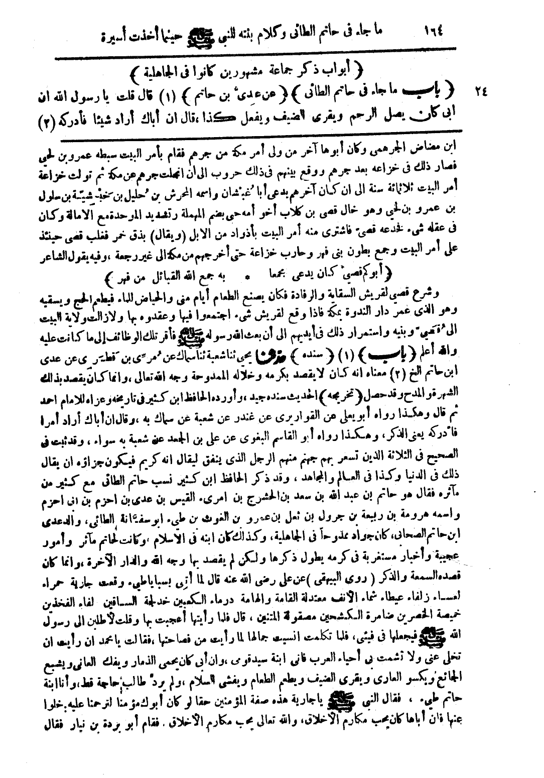 (باب ما جاء في حاتم الطائي) (عن عدى بن حاتم) (1) قال قلت يا رسول الله أن أبي كان يصل الرحم وبقرى للضيف ويفعل كذا، قال أن أباك أراد شيئًا فأدركه (2)