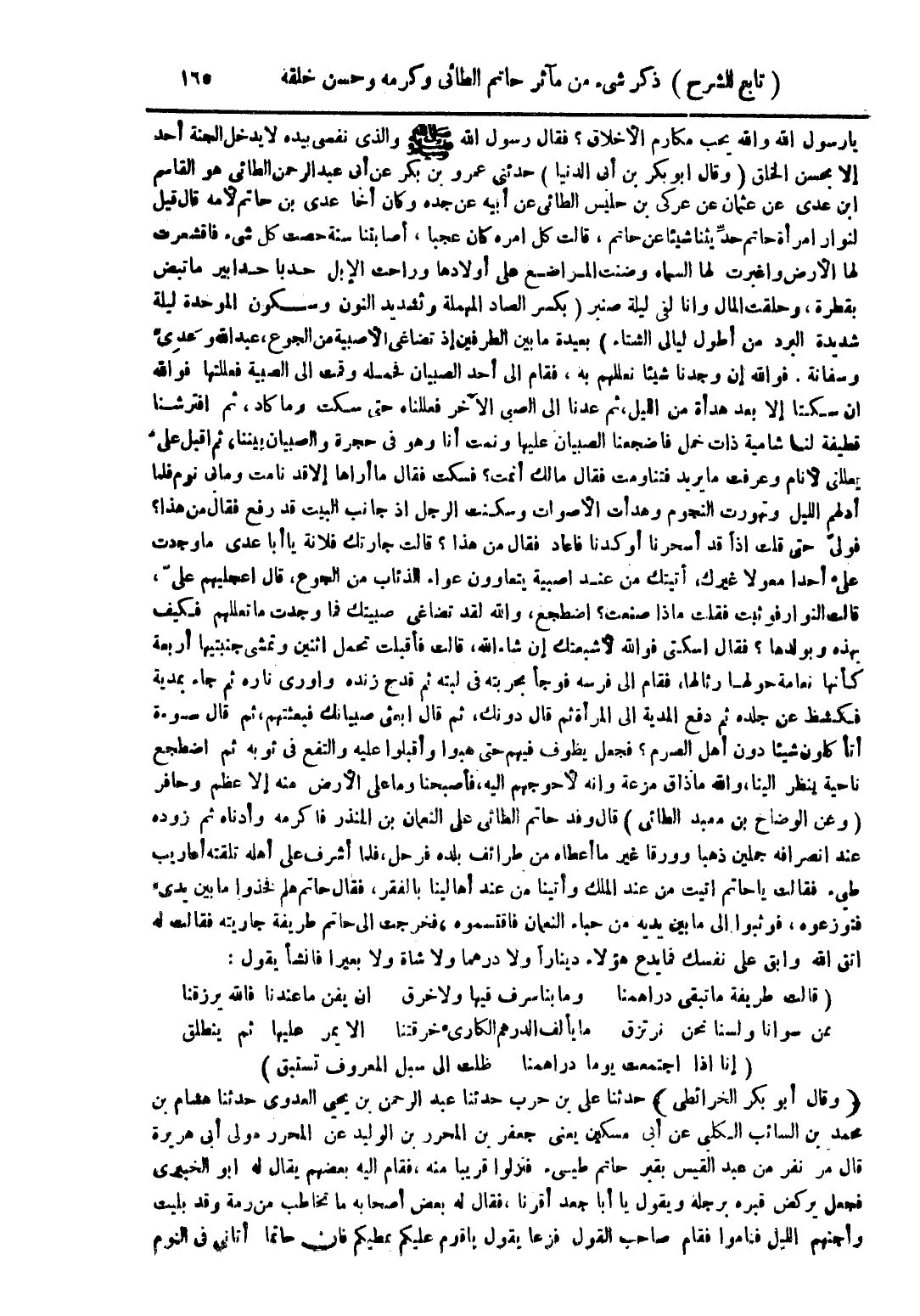يا رسول الله والله يحب مكارم الأخلاق؟ فقال رسول الله صلى الله عليه وسلم والذي نفسي بيده لا يدخل الجنة أحد إلا بحسن الخلق (وقال أبو بكر بن أبي الدنيا) حدثني عمرو بن بكر عن أبي عبد الرحمن الطائي هو القاسم ابن عدي عن عثمان عن عركى بن حليس الطائي عن أبيه عن جده وكان أخا عدي بن حاتم لأمه قال قيل لنوار امرأة حاتم حديثنا شيئًا عن حاتم، قالت كل أمره كان عجبًا، أصابتنا سنة حصت كل شيء فاقشعرت لها الأرض واغبرت لها السماء وضنت المراضع على أولادها وراحت الإبل حدبا حدابير ما تبض بقطرة، وحلقت المال وأنا لفي ليلة صنبر (بكسر الصاد المهملة وتشديد النون وسكون الموحدة ليلة شديد البرد من أطول ليالي الشتاء) بعيدة ما بين الطرفين إذ تضاغى الأصبية من الجوع، عبد الله وعدى وسفانة. فوالله إن وجدنا شيئًا نعللهم به، فقام إلى أحد الصبيان فحمله وقمت إلى الصبية فعللتها فوالله إن سكتا إلا بعد هدأة من الليل، ثم عدنا إلى الصبي الآخر فعللناه حتى سكت وما كاد، ثم افترقنا قطيفة لنا شامية ذات حمل فأضجعنا الصبيان عليها ونمت أنا وهو في حجرة والصبيان بيننا، ثم أقبل عل يعللني لأنام وعرفت ما يريد فتناومت فقال مالك أنمت؟ فسكت فقال ما أراها إلا قد نامت وما بي نوم فلما أدلهم الليل وتهورت النجوم وهدأت الأصوات وسكنت الرجل إذا جاب البيت قد رفع فقال من هذا؟ فولى حتى قلت إذًا قد أسحرنا أوكدنا فاعاد فقال من هذا؟ قالت جارتك فلانة يا أبا عدي ما وجدت على أحد معولًا غيرك، أتيتك من عند أصبية يتعاوون عواء الذئاب من الجوع، قال أعجليهم على، قالت النوارفو ثبت فقلت ماذا صنعت؟ اضطجع، والله لقد تضاغى صبيتك فما وجدت ما تعللهم فكيف بهذه وبولدها؟ فقال اسكتي فوالله لأشبعتك إن شاء الله، قالت فأقبلت تحمل اثنين وتمشي جنبتيها أربعة كأنها نعامة حولها رئالها، فقام إلى فرسه فوجأ بجربته في لبته ثم قدح زنده واورى ناره ثم جاء بمدية فكشظ عن جلده ثم دفع المدية إلى المرأة ثم قال دونك، ثم قال ابعثي صبيانك فبعثتهم، ثم قال سوءة أتأكلون شيئًا دون أهل الصوم؟ فجعل يطوف فيهم حتى هبوا وأقبلوا عليه والتفع في ثوبه ثم اضطجع ناحية ينظر إلينا، والله ما ذاق مزعة وأنه لأحوجهم إليه، فأصبحنا وما على الأرض منه إلا عظم وحافر (وعن الوضاح بن معبد الطائي) قال وفد حاتم الطائي على النعمان بن المنذر فاكرمه وأدناه ثم زوده عند انصرافه جملين ذهبًا وورقا غير ما أعطاه من طرائف بلده فرحل، فلما أشرف على أهله تلقته أعاريب طيء فقالت يا حاتم اتيت من عند الملك وأتينا من عند أهالينا بالفقر، فقال حاتم هلم فخذوا ما بين يدي فتوزعوه، فوثبوا إلى ما بين يديه من حباء النعمان فاقتسموه، فخرجت إلى حاتم طريفة جاريته فقالت له اتق الله وابق على نفسك فما يدع هؤلاء دينارًا ولا درهما ولا شاة ولا بعير فانشأ يقول: