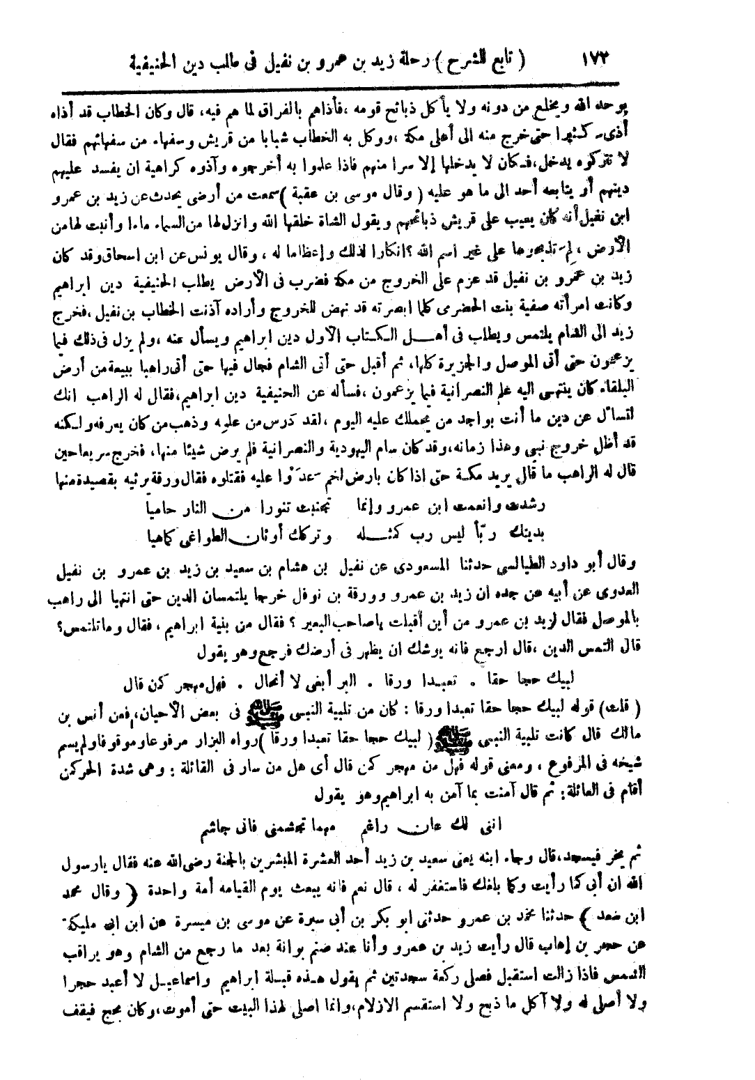يوحد الله ويخلع من دونه ولا يأكل ذبائح قومه، فأذاهم بالفراق لما هم فيه، قال وكان الخطاب قد أذاه أذى كثيرًا حتى خرج منه إلى أهلي مكة، ووكل به الخطاب شبابًا من قريش وسفهاء من سفهائهم فقال لا تتركوه يدخل، فكان لا يدخلها إلا سرًا منهم فإذا علموا به أخرجوه وآذوه كراهية أن يفسد عليهم دينهم أو يتابعه أحد إلى ما هو عليه (وقال موسى بن عقبة) سمعت من أرضى يحدث عن زيد بن عمرو ابن نفيل أنه كان يعيب على قريش ذبائحهم ويقول الشاة خلقها الله وانزل لها من السماء ماءًا وأنبت لها من الأرض، لم تذبحوها على غير أسم الله؟ إنكار لذلك وإعظامًا له، وقال يونس ابن إسحاق وقد كان زيد بن عمرو بن نفيل قد عزم على الخروج من مكة فضرب في الأرض يطلب الحنيفية دين إبراهيم وكانت امرأته صفية بنت الحضرمي كلما أبصرته قد نهض للخروج وأراده آذنت الخطاب بن نفيل، فخرج زيد إلى الشام يلتمس ويطلب في أهل الكتاب الأول دين إبراهيم ويسأل عنه، لم يزل في ذلك فيما يزعمون حتى أتى الموصل والجزيرة كلها، ثم أقبل حتى أتى الشام فجال فيها حتى أتى راهبًا ببيعة من أرض البلقاء كان ينتهي إليه علم النصرانية فيما يزعمون، فسأله عن الحنيفية دين إبراهيم، فقال له الراهب انك لتسأل عن دين ما أنت بواجد من يحملك عليه اليوم، لقد درس من علمه وذهب من كان يعرفه ولكنه قد أظل خروج نبي وهذا زمانه، وقد كان سام اليهودية والنصرانية فلم يرض شيئًا منها، فخرج سريعًا حين قال له الراهب ما قال يريد مكة حتى إذا كان بأرض لحم عدوا عليه فقتلوه فقالوا ورقة يرثيه بقصيدة منها