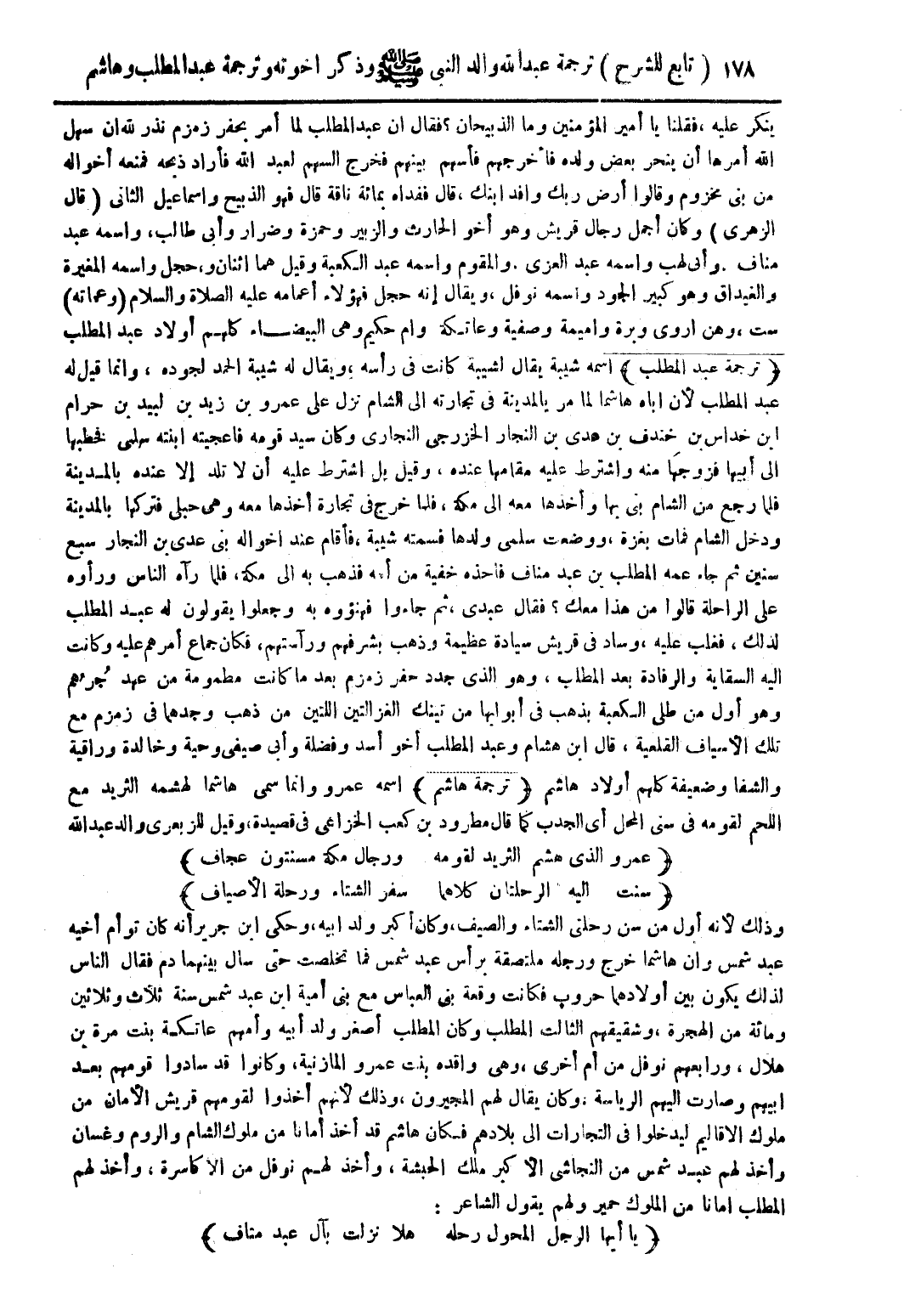 ينكر عليه، فقلنا يا أمير المؤمنين وما الذبيحان؟ فقال أن عبد المطلب لما أمر بحفر زمزم نذر الله أن سهل الله أمرها أن ينحر بعض ولده فأخرجهم فأسهم بينهم فخرج السهم لعبد الله فأراد ذبحه فمنعه أخواله من بني مخزوم وقالوا أرض ربك وافد ابنك، قال ففداه بمائة ناقة قال فهو الذبيح وإسماعيل الثاني (قال الزهري) وكان أجمل رجال قريش وهو أخو الحارث والزبير وحمزة وضرار وأبي طالب، واسمه عبد الله مناف. وأبي لهب وأسمه عبد العزى. والمقوم واسمه عبد الكعبة وقيل هما اثنان، وحجل واسمه المغيرة والغيداق وهو كبير الجود واسمه نوفل، ويقال إنه حجل فؤلاء أعمامه عليه الصلاة والسلام (وعماته) سمت، وهن أروى وبرة وصفية وعاتكة وأم حكيم وهي البيضاء كلهم أولاد عبد المطلب (ترجمة عبد المطلب) أسمه شيبة يقال لشيبة كانت في رأسه، ويقال له شيبة الحمد لجوده، وإنما قيل له عبد المطلب لأن أباه هاشمًا لما مر بالمدينة في تجارته إلى الشام نزل على عمرو بن زيد بن لبيد بن حرام ابن خداس بن خندق بن عدى بن النجار الخزرجي النجاري وكان سيد قومه فاعجبته ابنته سلمى فخطبها إلى أبيها فزوجها منه واشترط عليه مقامها عنده، وقيل بل اشترط عليه أن لا تلد إلا عنده بالمدينة فلما رجع من الشام بي بها وأخذها معه إلى مكة، فلما خرج في تجارة أخذها معه وهي حبلى فتركها بالمدينة ودخل الشام فمات بغزة، ووضعت سلمى ولدها فسمته شيبة، فأقام عند اخواله بني عدي بن النجار سبع سنين ثم جاء عمه المطلب بن عبد مناف فأخذه خفية من أمه فذهب به إلى مكة، فلما رآه الناس ورأوه على الراحلة قالوا من هذا معك؟ فقال عبدي، ثم جاءوا فهنؤوه به وجعلوا يقولون له عبد المطلب لذلك، فغلب عليه، وساد في قريش سيادة عظيمة وذهب بشرفهم ورأستهم، فكان جماع أمرهم عليه وكانت إليه السقاية والرفادة بعد المطلب، وهو الذي جدد حفر زمزم بعد ما كانت مطمومة من عهد جرهم وهو أو من طلى الكعبة بذهب في أبوابها من تينك الغزالتين اللتين من ذهب وجدهما في زمزم مع تلك الأسياف القلعية، قال ابن هشام وعبد المطلب أخو أسد وفضلة وأبي صيفي وحية وخالدة وراقية والشفا وضعيفة كلهم أولاد هاشم (ترجمة هاشم) اسمه عمرو وإنما سمى هاشمًا لهشمه الثريد مع اللحم لقومه في سنى المحل أي الجدب كمال قال مطرود بن كعب الخزاعي في قصيدة، وقيل للزبعرى والدعبة الله