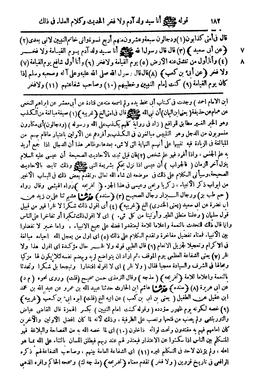 قال في أمتي كذابون (1) ودجالون سبعة وعشرون منهم منهم أربع ونسوة وأني خاتم النبيين لانبي بعدي (عن أبي سعيد) (3) قال قال رسول الله صلى الله عليه وسلم أنا سيد ولد آدم يوم القيامة ولا فخر (4) وأنا أول من تشق عنه الأرض (5) يوم القيامة ولا فخر (6) وأنا أول شافع يوم القيامة (7) ولا فخر (عن أبي بن كعب) (8) قال قال رسول الله صلى الله عليه وسلم وعلى آله وصحبه وسلم إذا كان يوم القيامة (9) كنت إمام النبيين وخطيبهم (10) وصاحب شفاعتهم (11) ولا فخر
